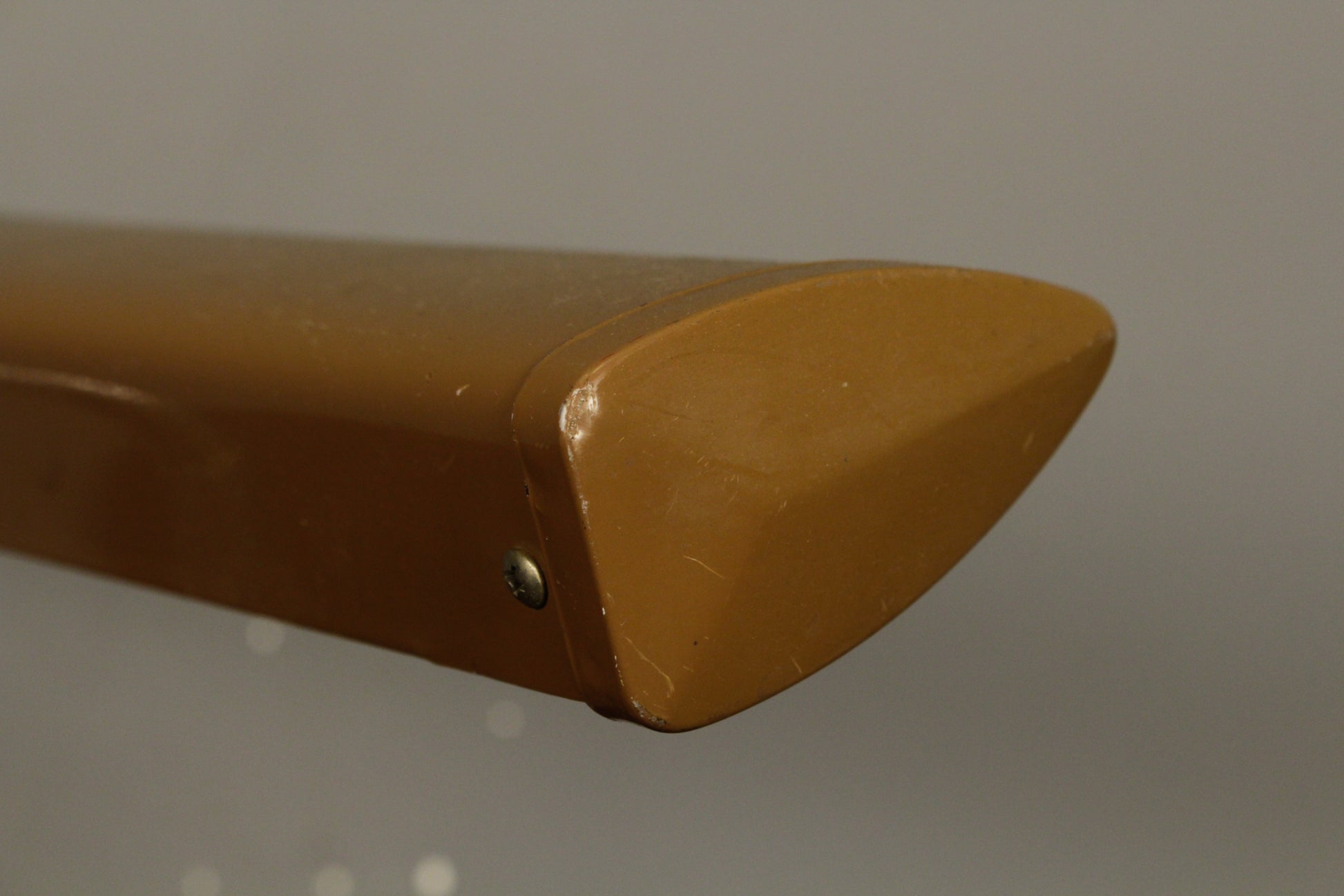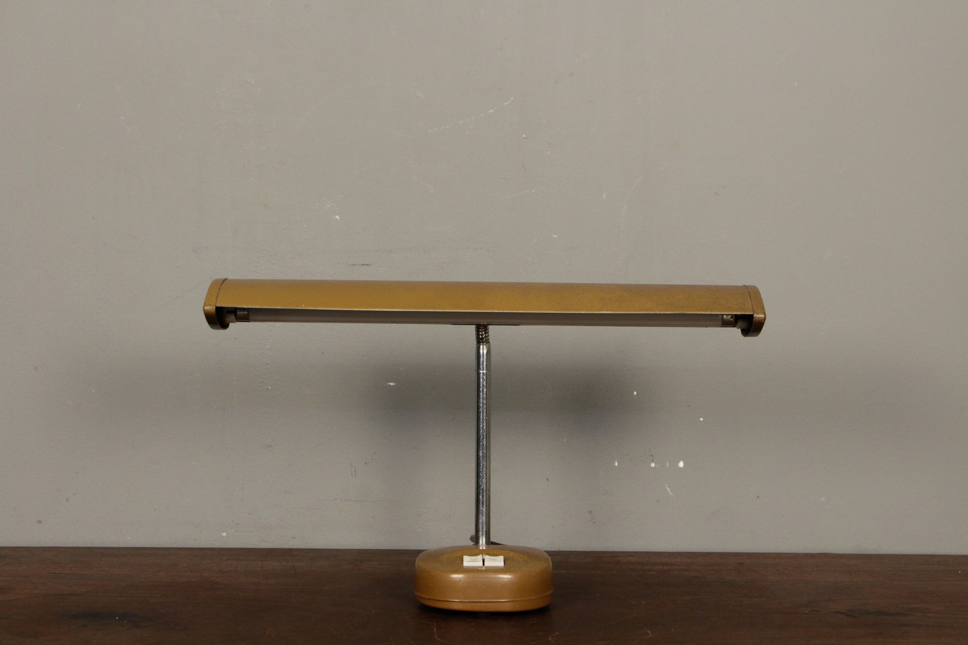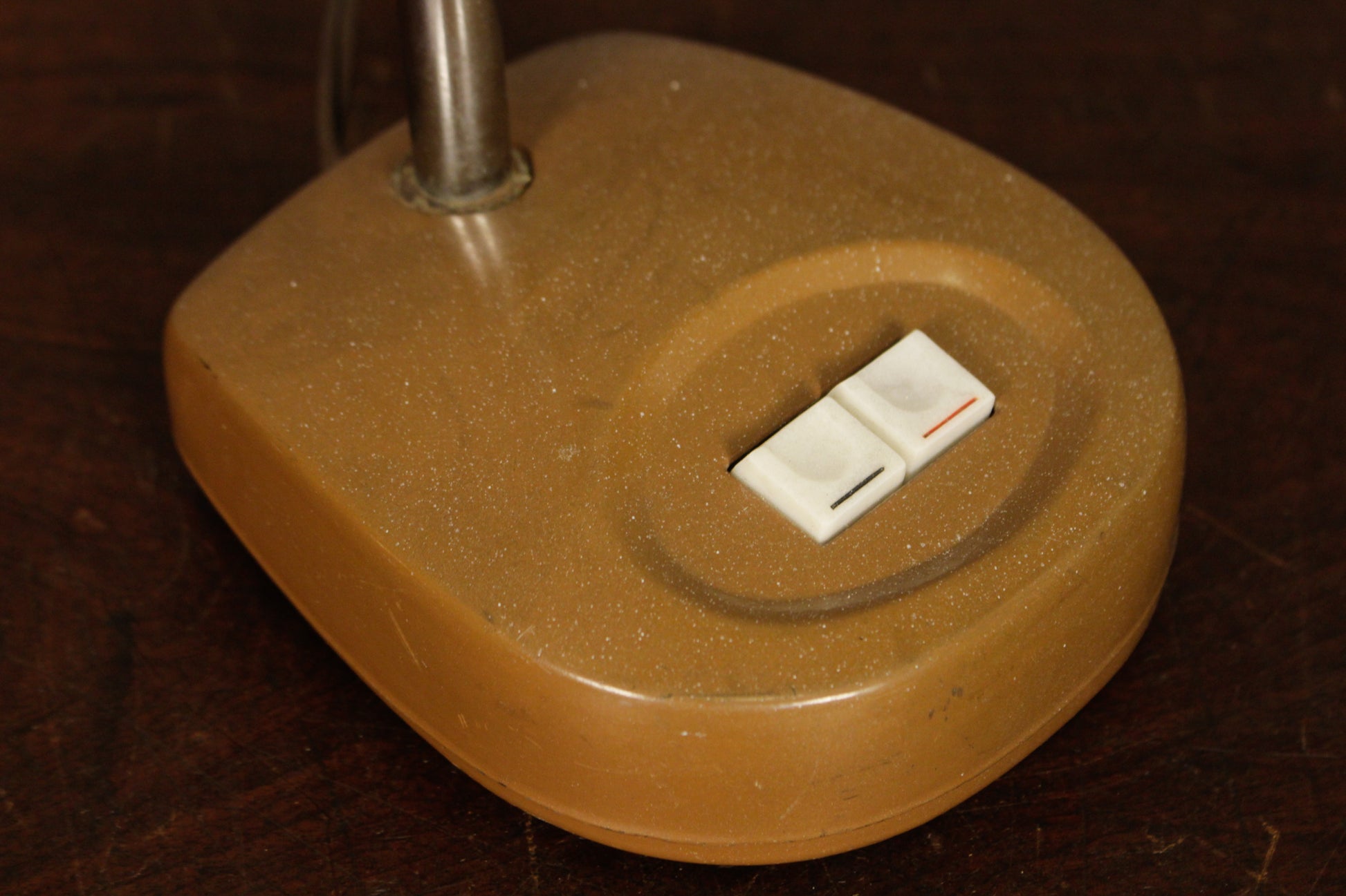 Set the mood to get to work with this cool 1970s desk lamp! Brown metal shade and base with silver gooseneck. Fluorescent bulb turns on by holding down the on button for a few seconds and then releasing. In good condition with some surface wear and fine paint speckling to brown metal finish.