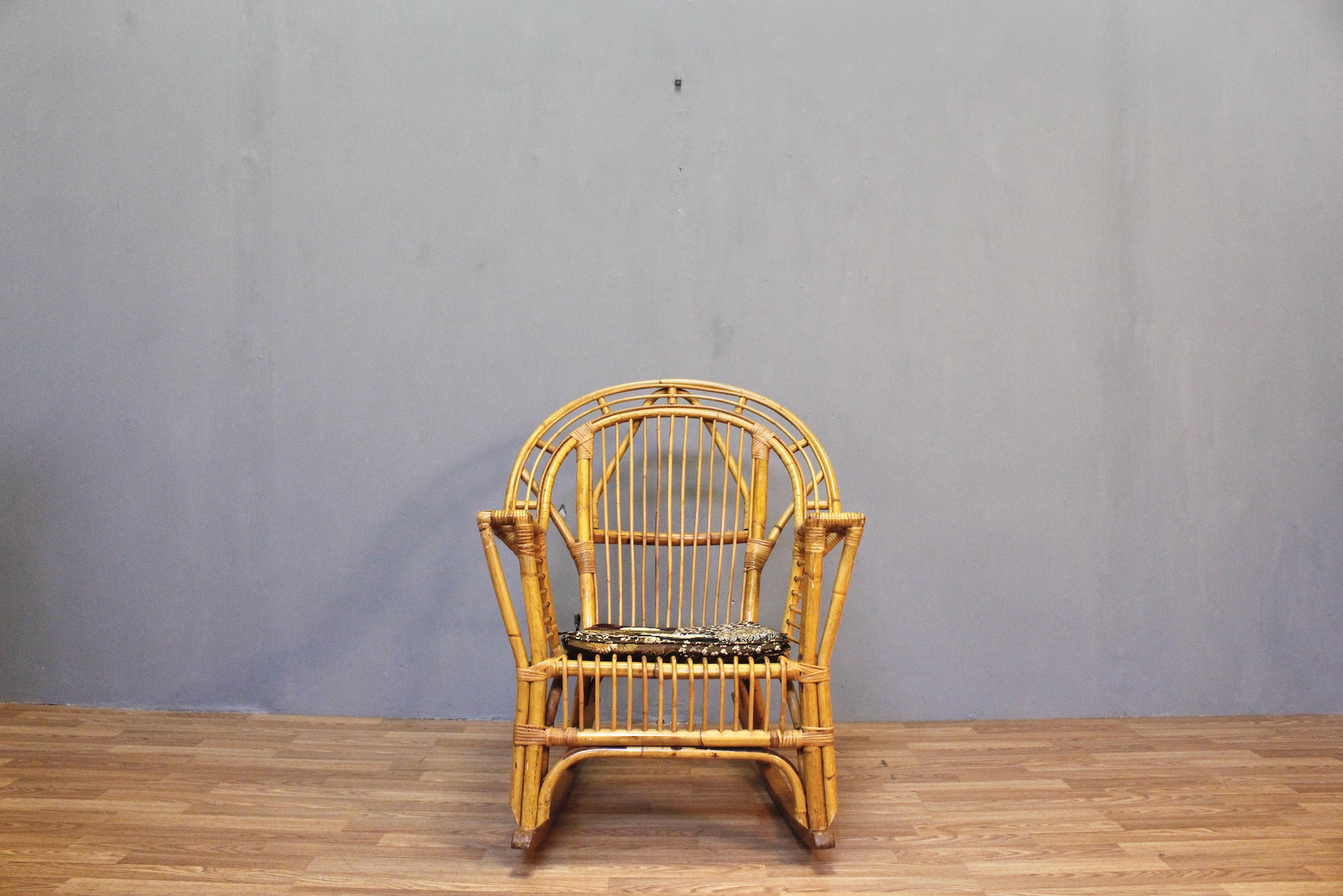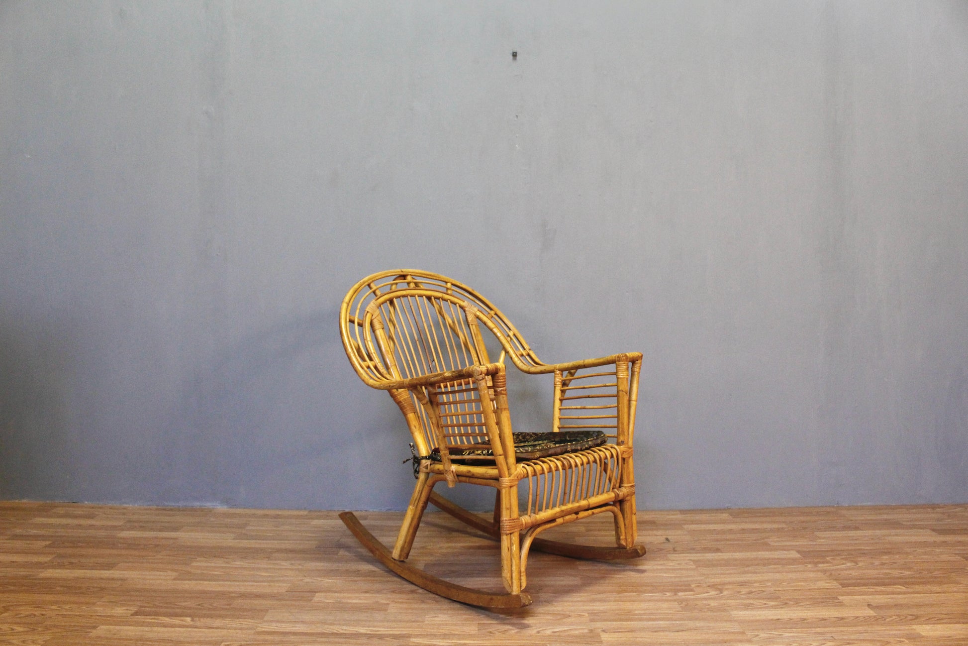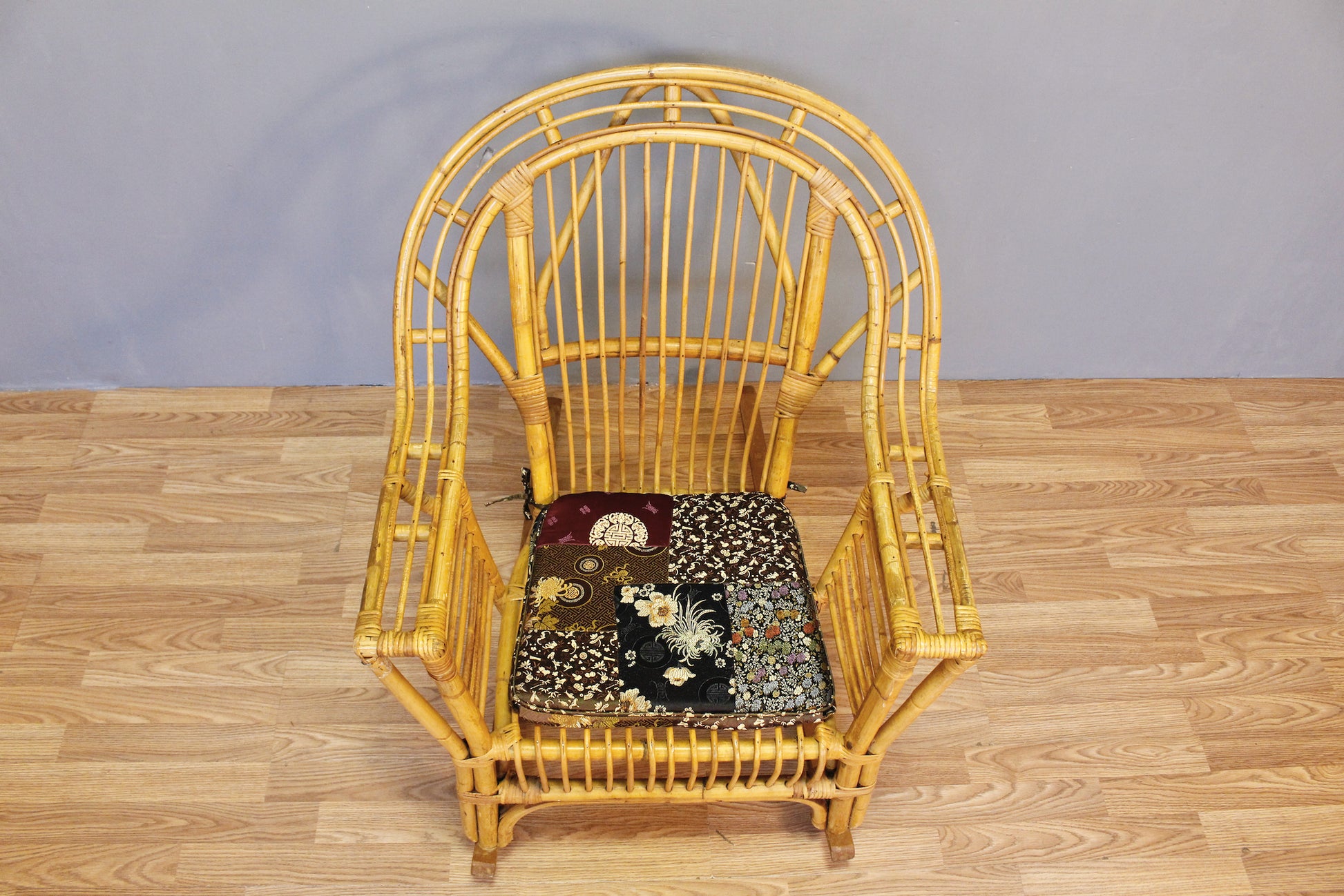 Bohemian rocking chair with an inviting curvy shape. Comes with a funky patchwork cushion. In good condition, light wear.