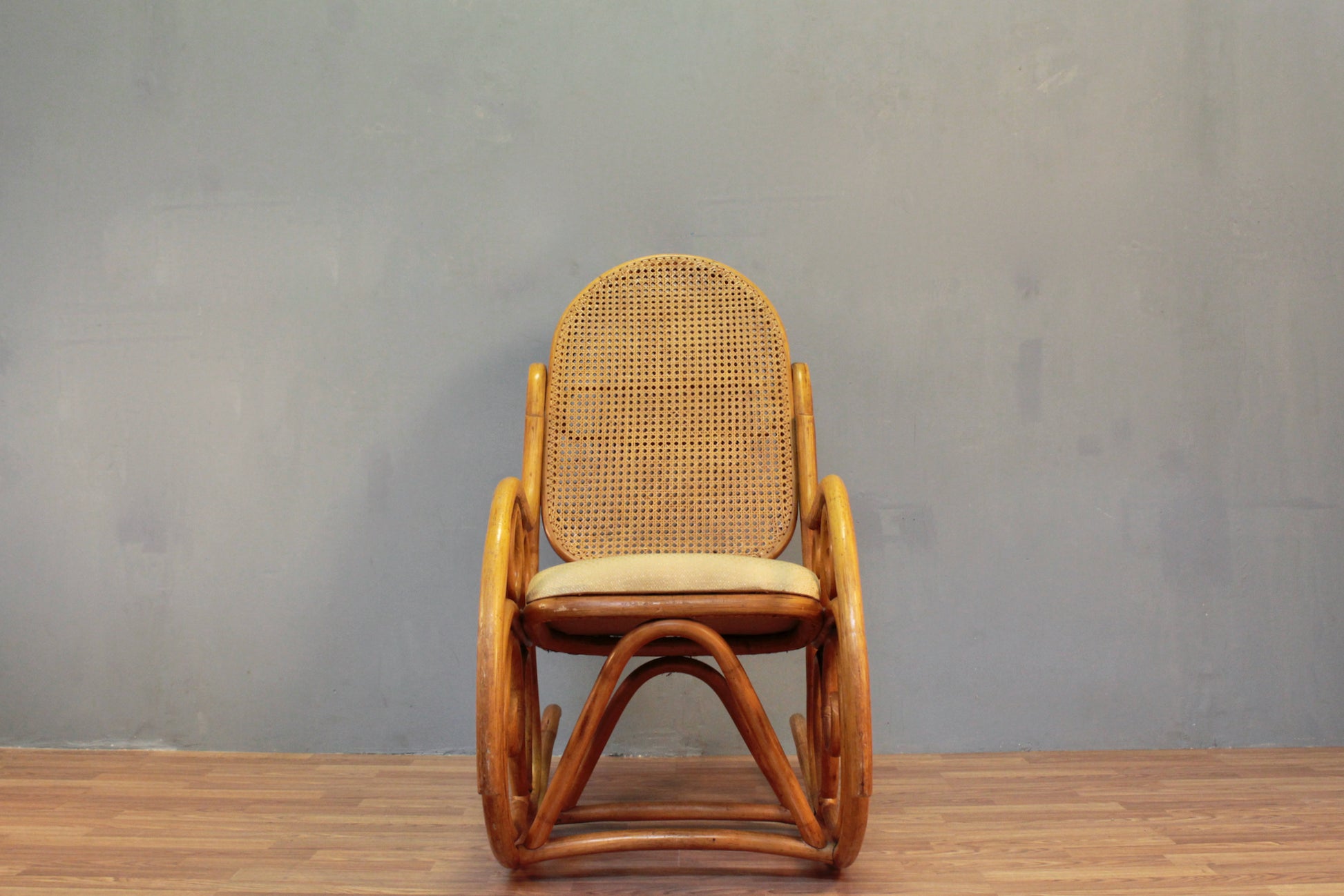 Whimsical bentwood rocking chair by Thonet. The iconic Schaukelstuhl chair was adored by Picasso who owned two! Cane seat and back. Curled beech wood. In good second-hand condition with some scuffs and aesthetic wear to the beech frame. Fabric seat is noticeably discolored and stained from age. Seat height is 21 inches. Disclaimer: This piece is not available to view in-store. It is for sale online only, and by appointment at our NJ warehouse. Once purchased, it will be transported to our Manhattan store for pick-up or delivery. All sales are FINAL. Please call if you have any questions regarding the piece prior to purchase or to place a 15% deposit to see the piece in-person in our store.