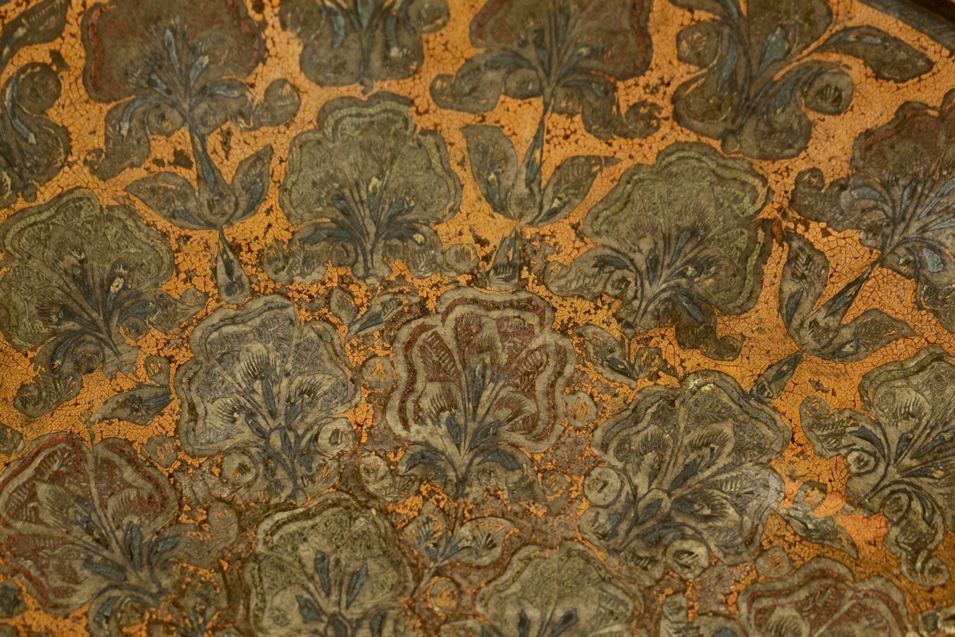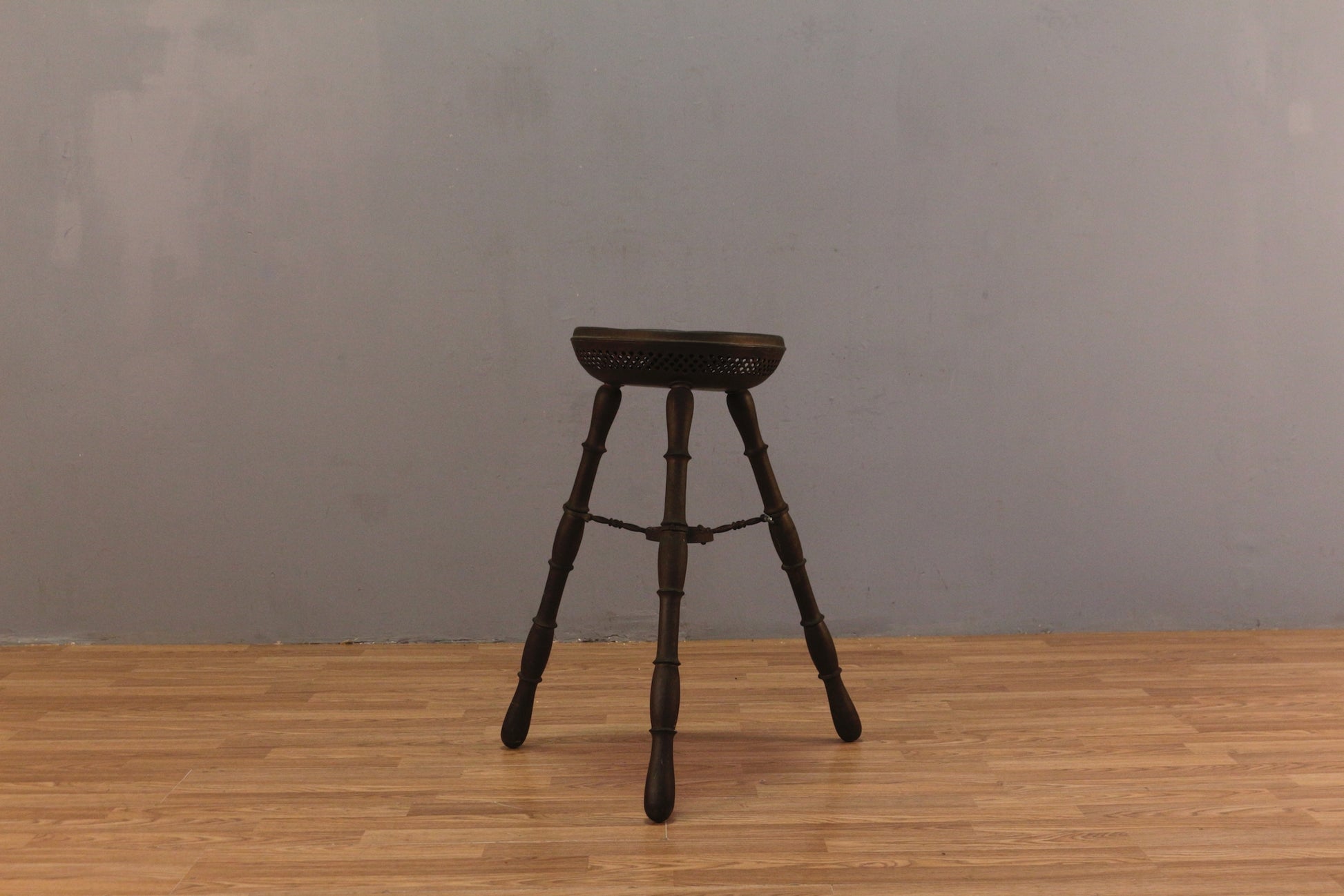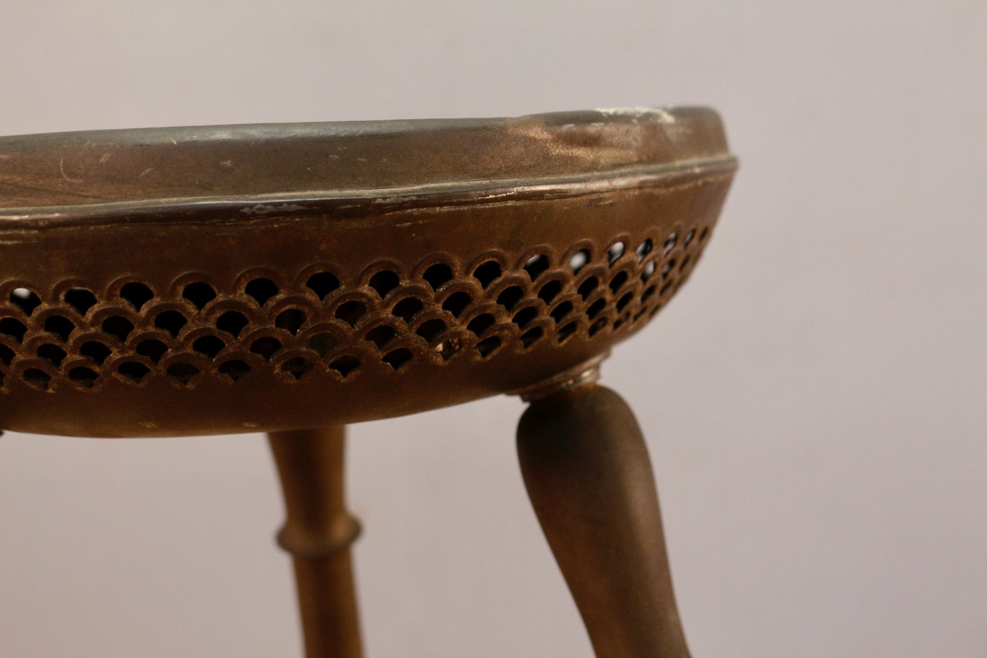 Warm up your living space - literally! Antique brass warmer. Perforated drum sits on three tapered legs. Top was originally meant to hold fuel to be burned and heat the surface. Would likely best serve as a decorative side table. Brass is noticeably patinated and top is significantly dented and sits crooked.