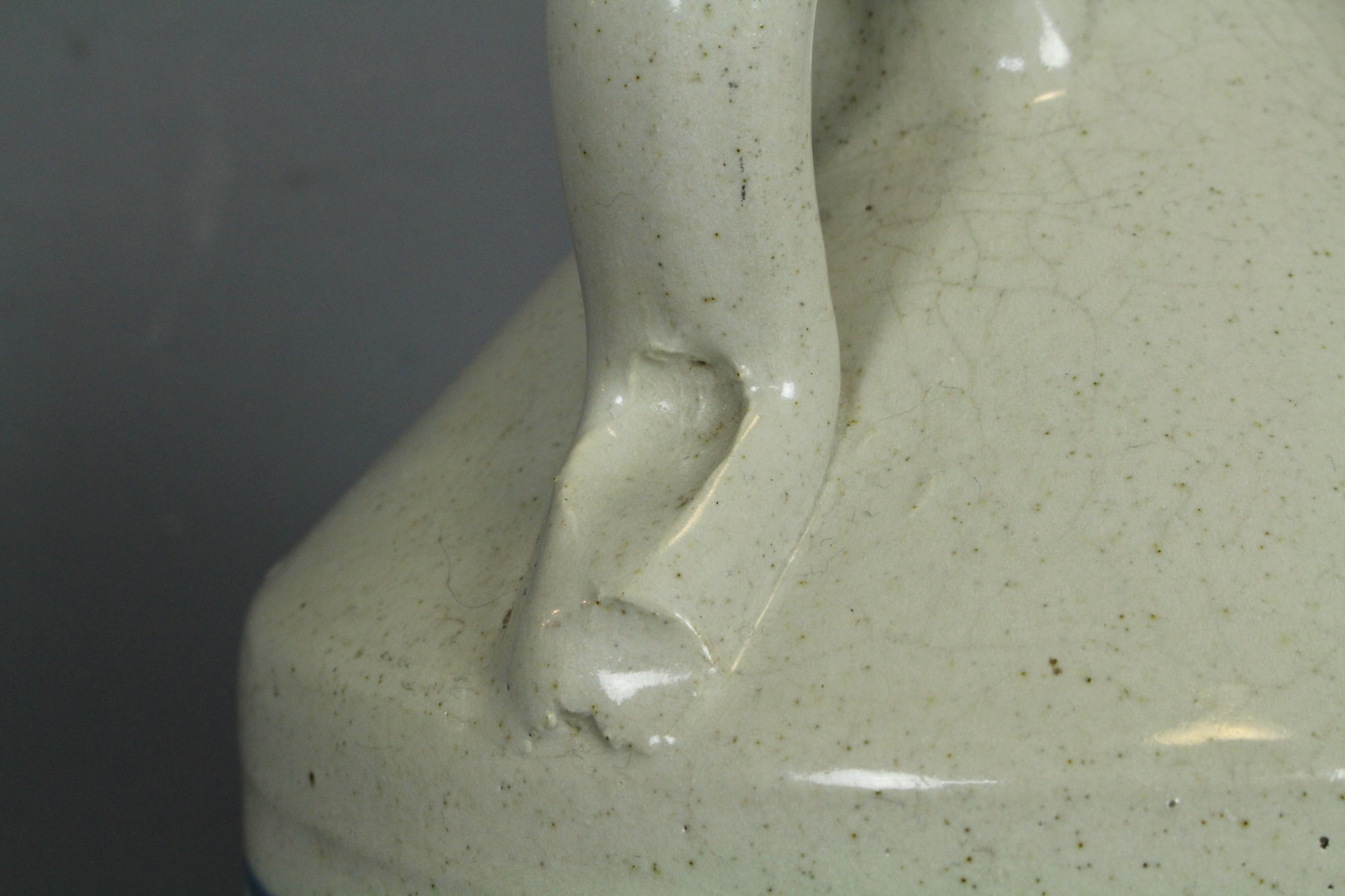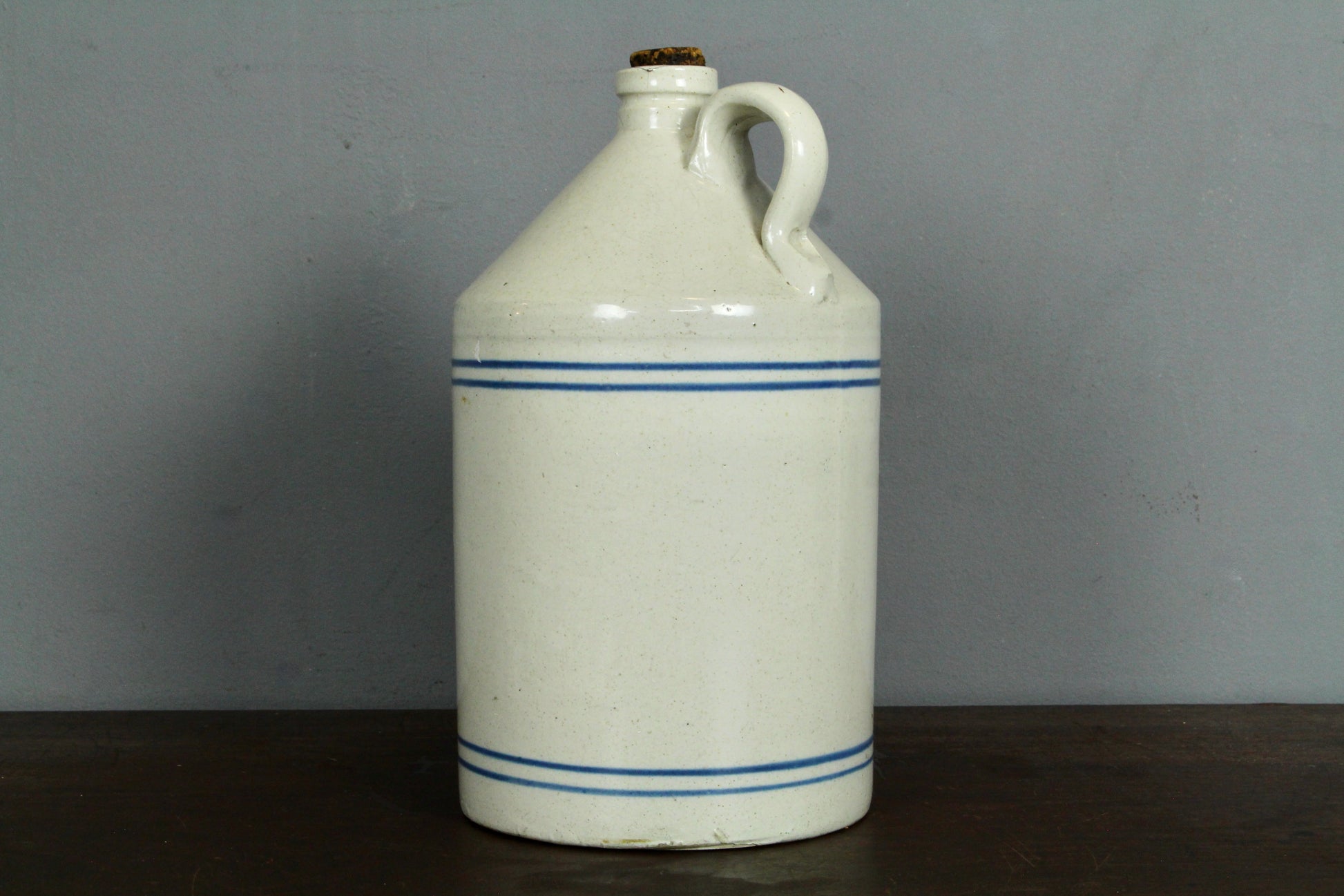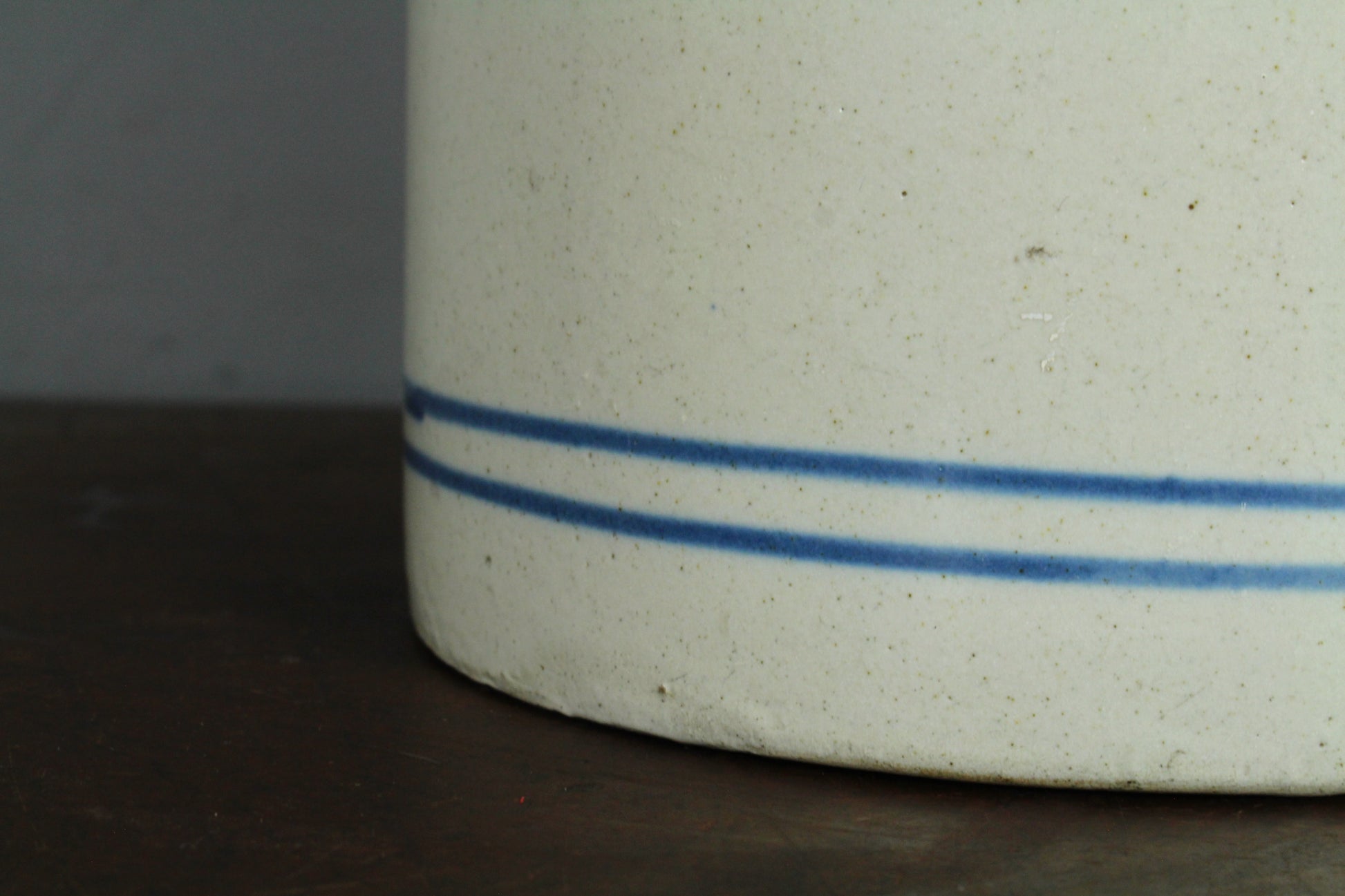 Hefty antique stoneware crock jar. Glazed in a nice neutral tone with slim blue stripe accents - perfect for centerpiece arrangements or display as is! Likely from the 19th century. In generally good antique condition with some crazing to the glaze and aesthetic wear throughout.