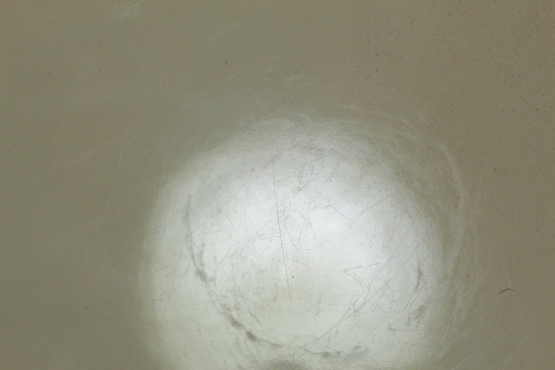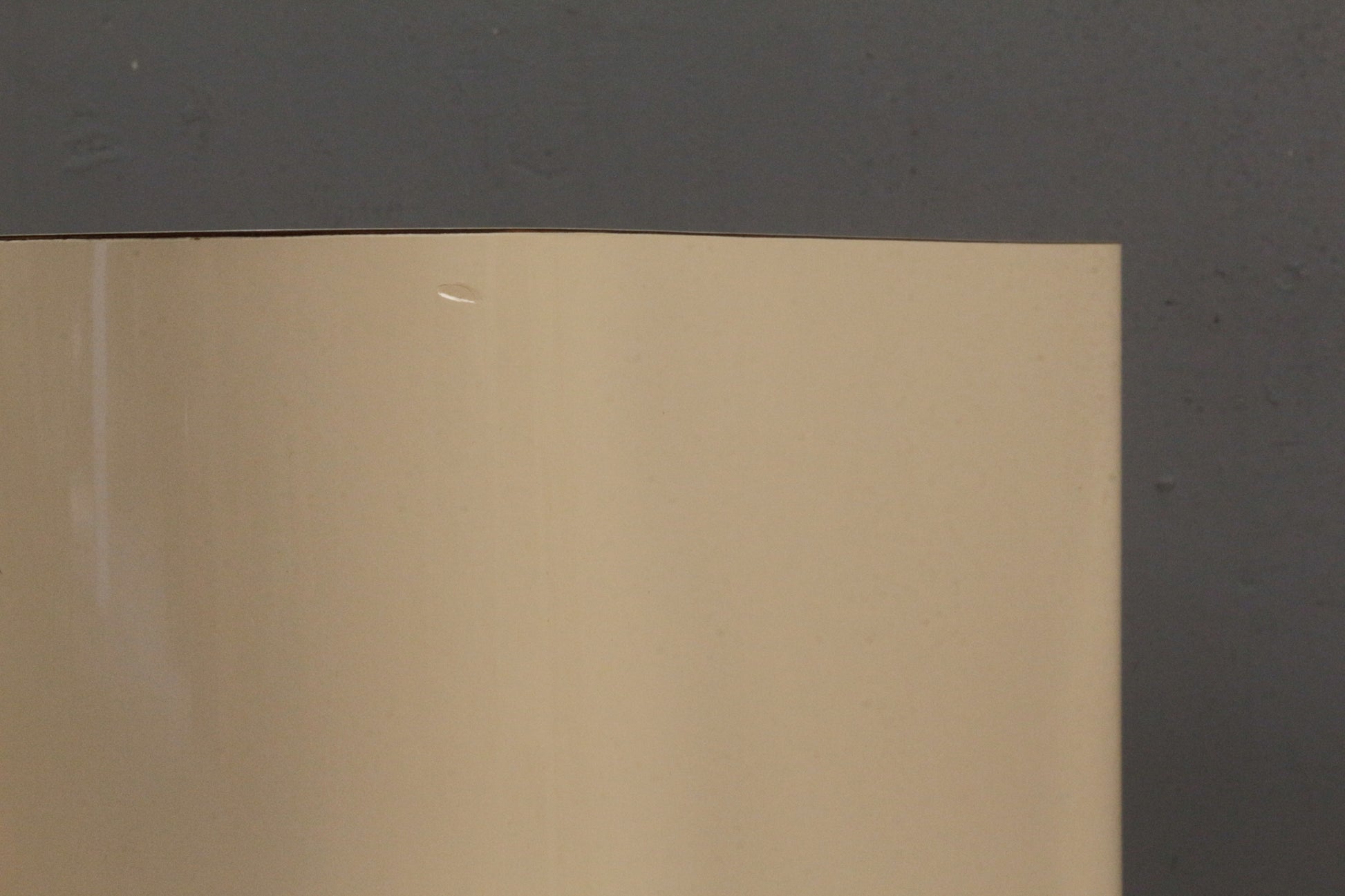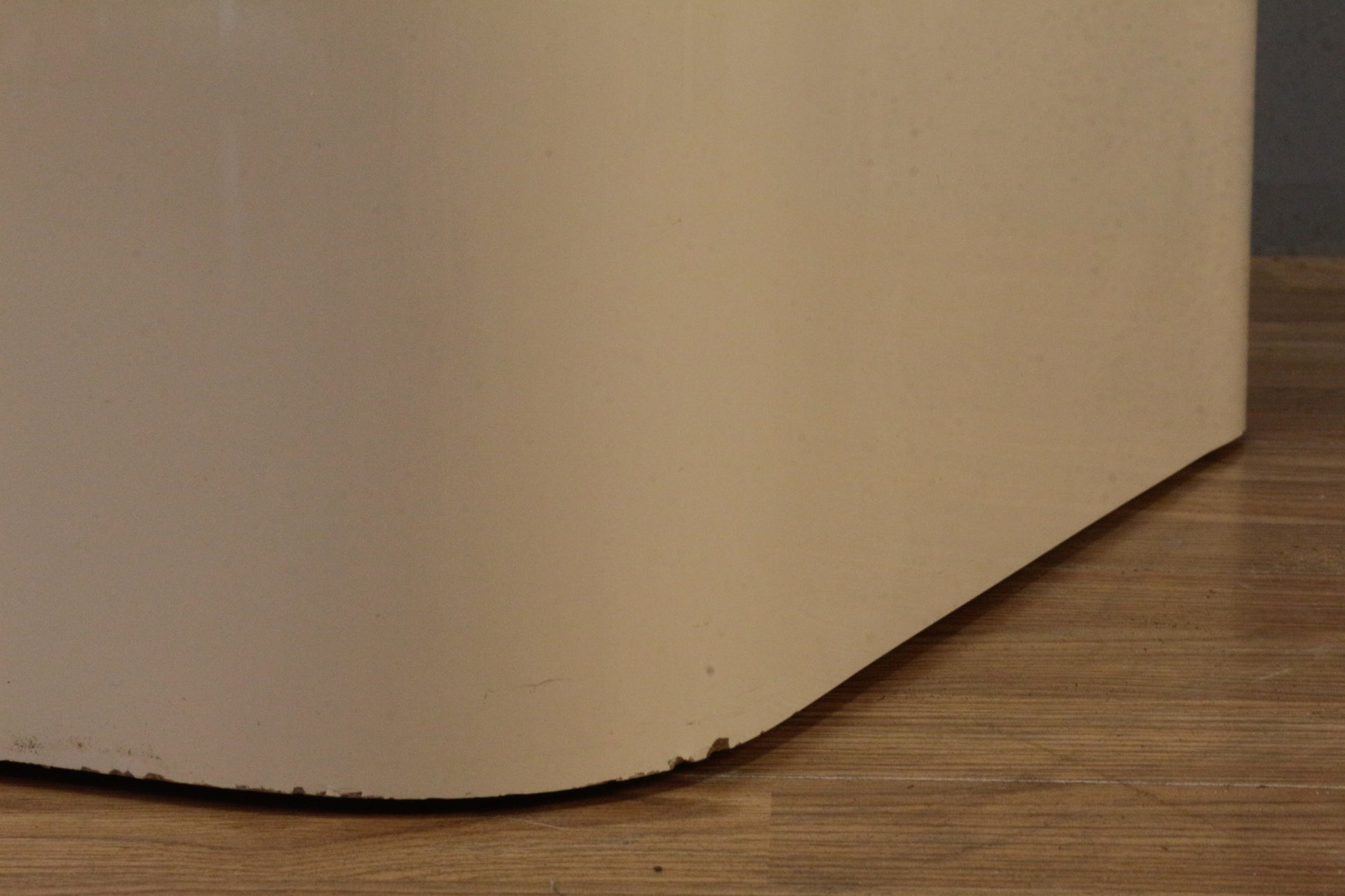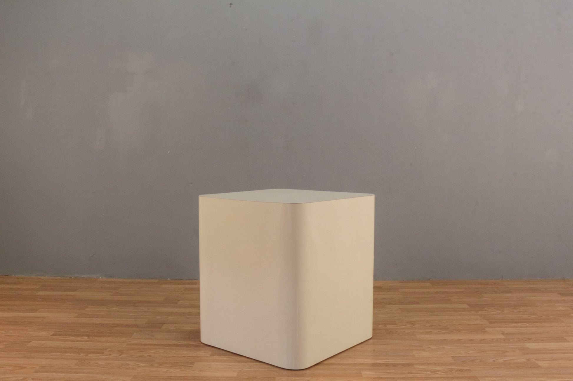 The cutest cream cube! Glossy laminate end table with nice rounded edges. Will add the perfect mod touch to any space! In good condition with a few dings, scratches, and chips, the worst of which is on the back.