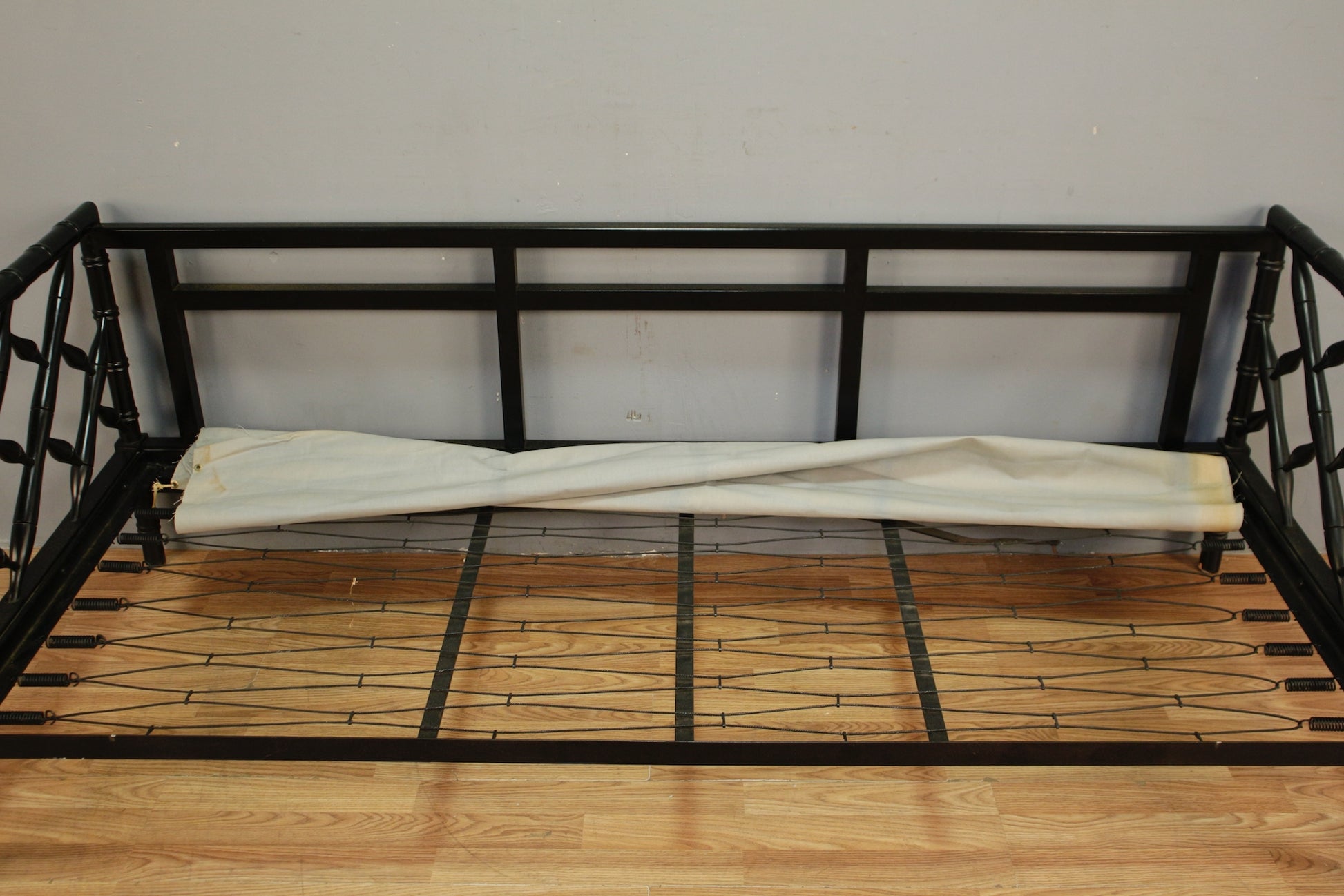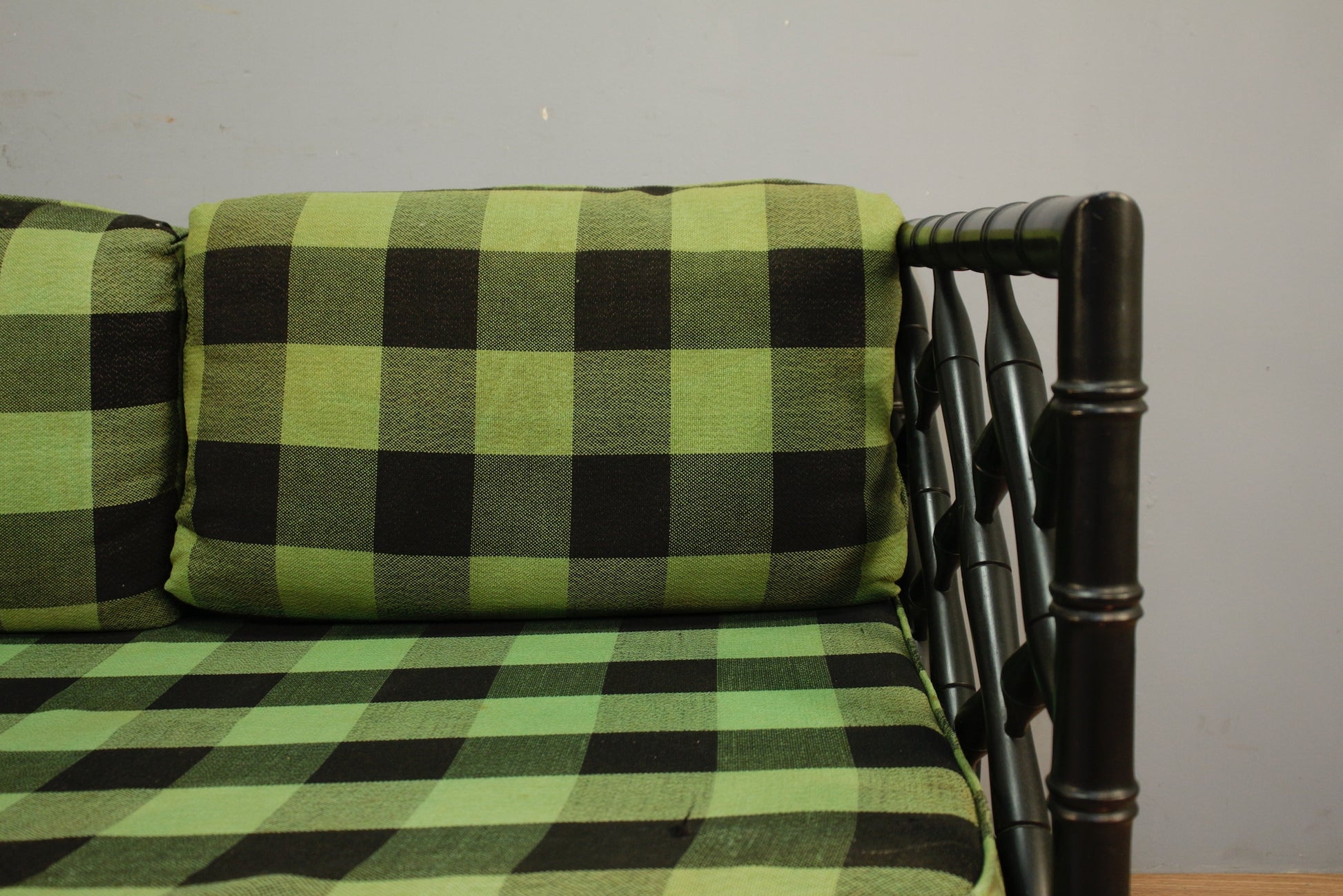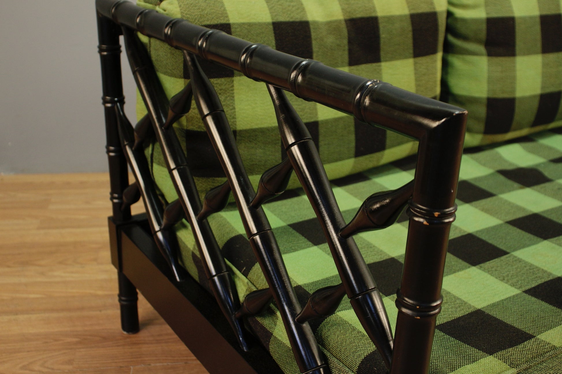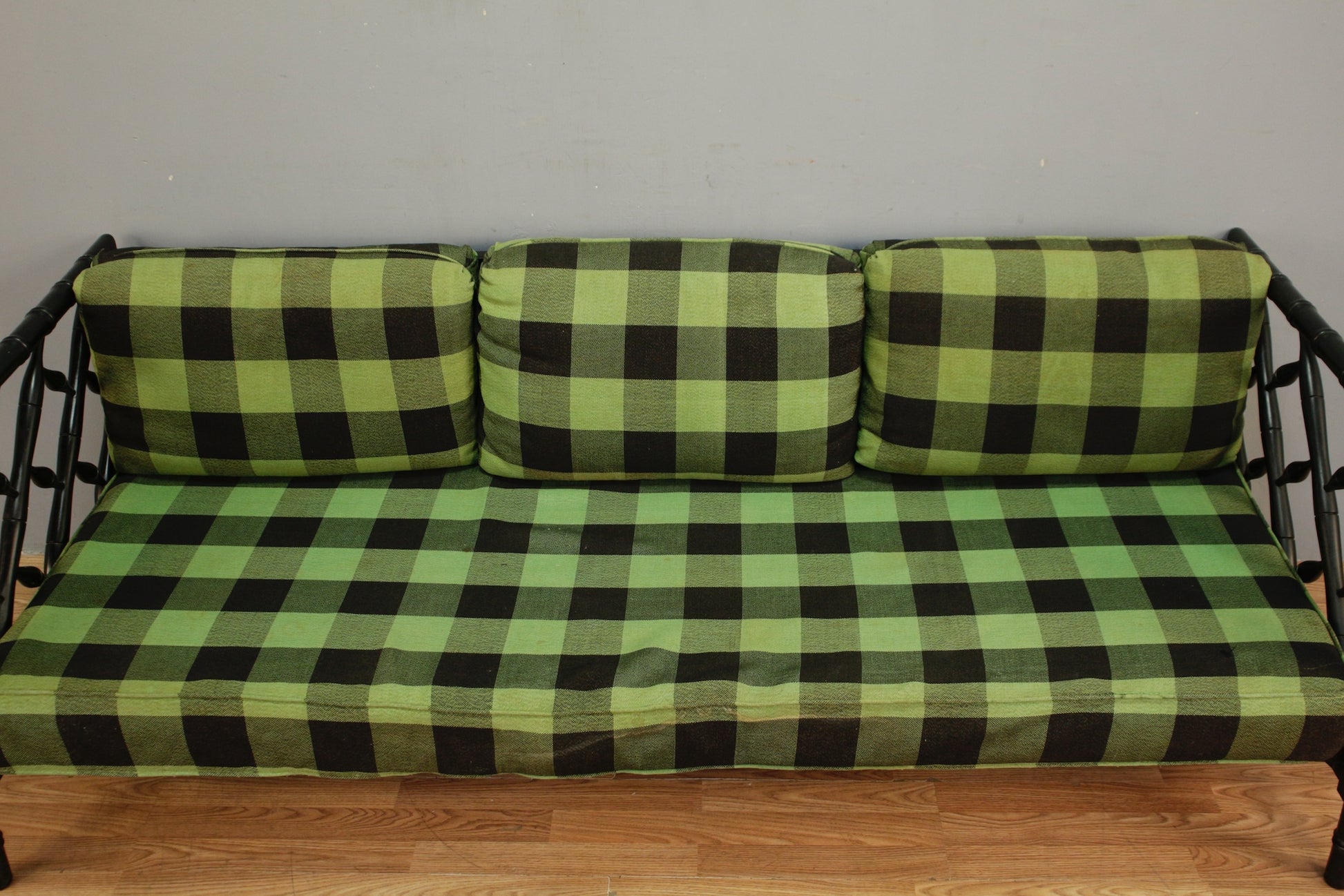 Stylish gingham and lattice framed sofa. Black faux bamboo frame with bold kelly green cushions. Cushions are removable. Upholstery of seat cushions shows signs of wear and some tears throughout. Frame shows some scratches and aesthetic wear throughout. Seat height is 15". PLEASE NOTE: cushions are towards the end of their life and are really suited primarily for prop/decor use. Not a great choice for regular use unless you plan to purchase new cushions and are just interested in frame. Disclaimer: This piece is not available to view in-store. It is for sale online only, and by appointment at our NJ warehouse. Once purchased, it will be transported to our Manhattan store for pick-up or delivery. All sales are FINAL. Please call if you have any questions regarding the piece prior to purchase or to place a 15% deposit to see the piece in-person in our store.