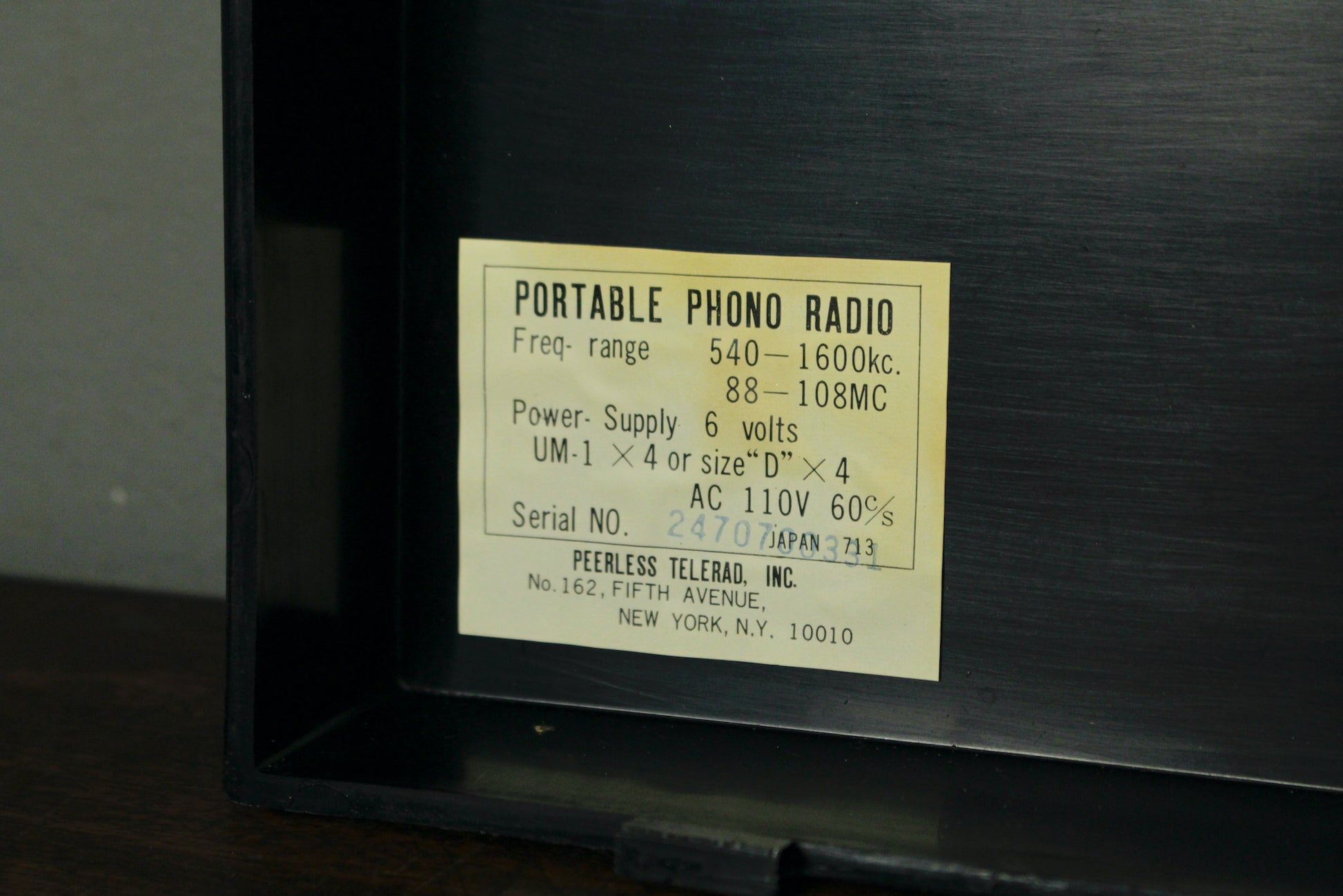 Adorable retro portable radio phonograph with a sleek walnut veneer trim. Would make a sweet addition to any space! In working condition but sound is fairly low. Small chip to veneer at one corner. Comes with a plug and also takes D batteries.