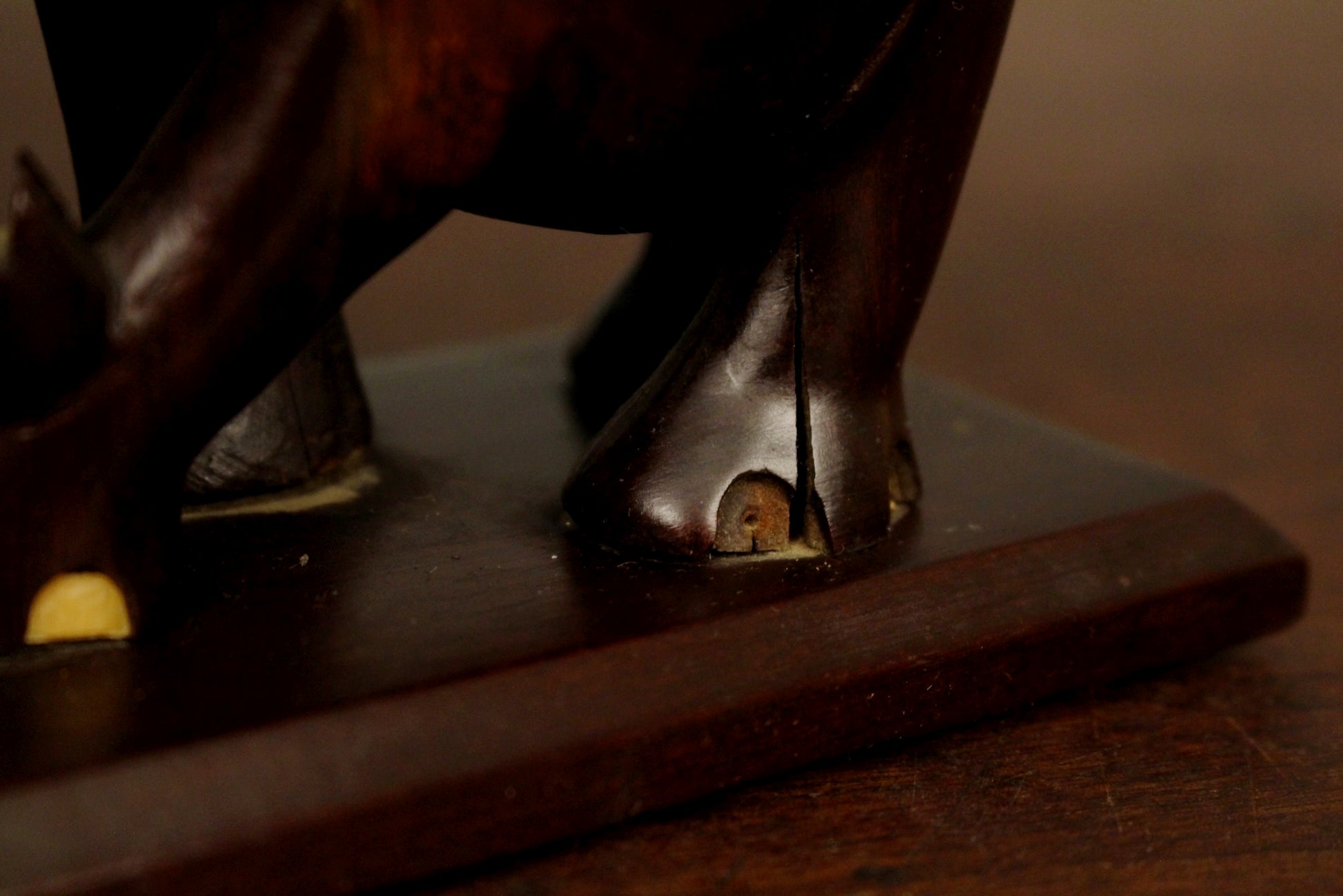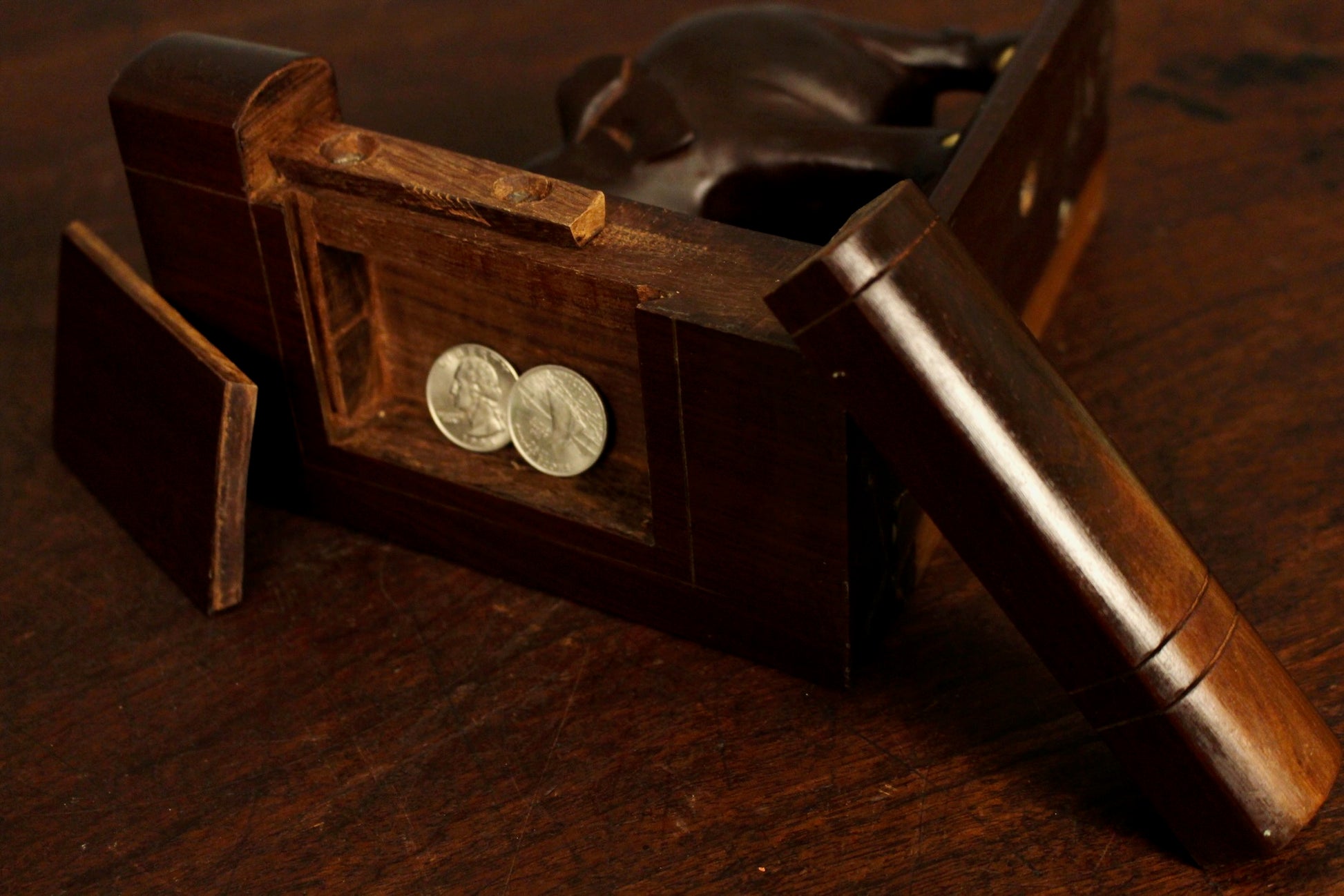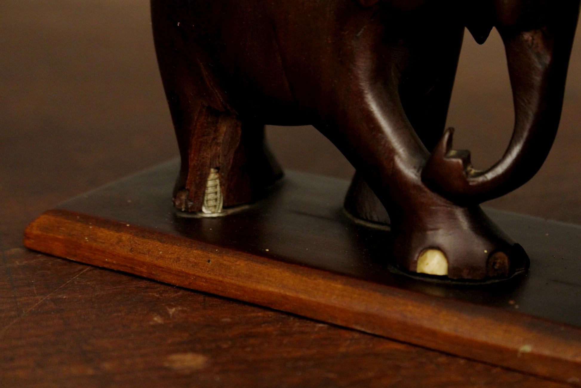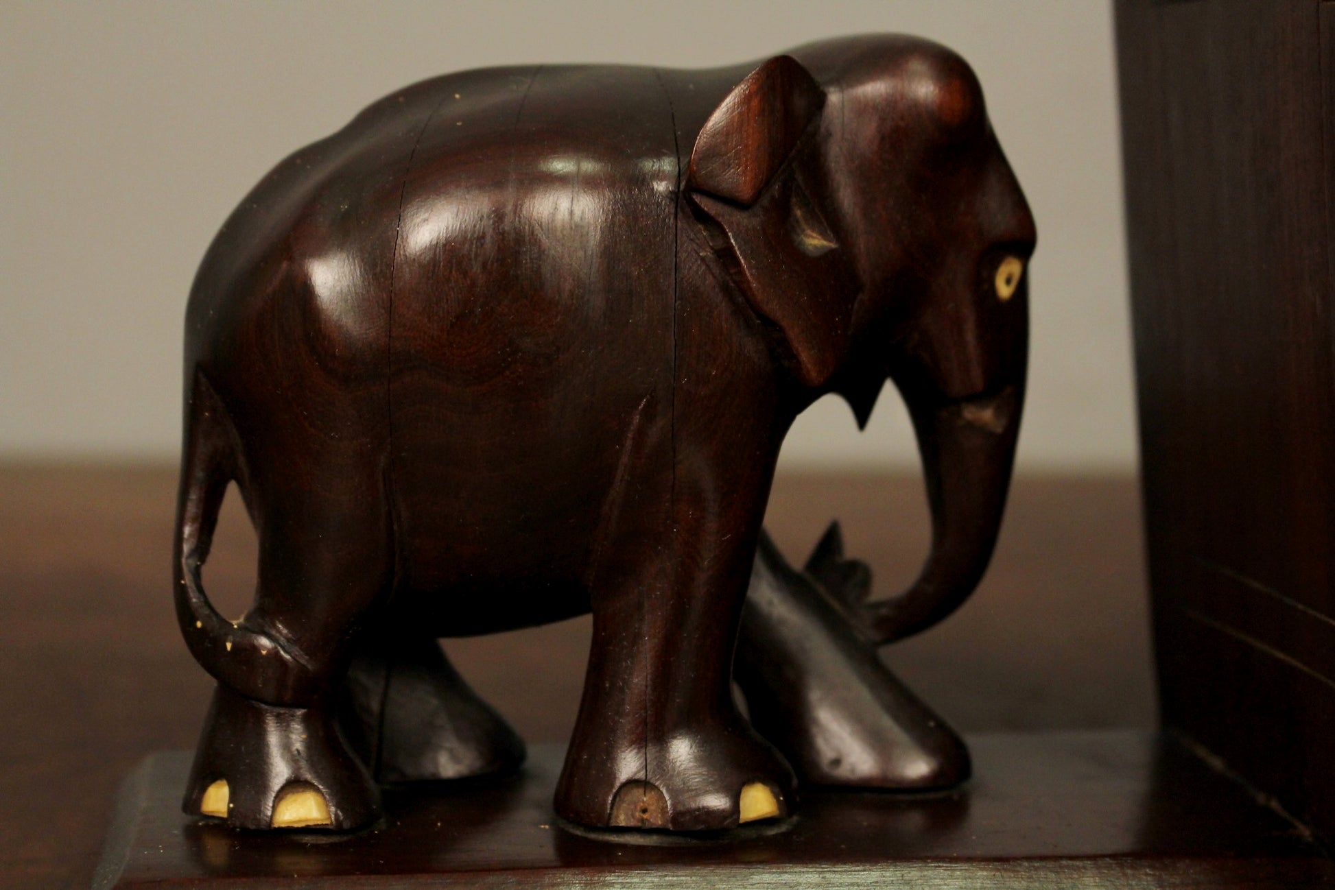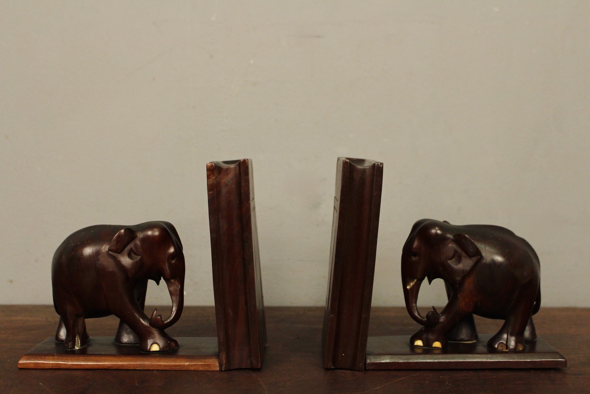 Carved wooden elephant bookends. From the 1950s. Wooden books feature a small hidden compartment! One of the elephants has a missing nail and a crack down the foot. The books sit at a slight angle. Other general surface wear throughout.