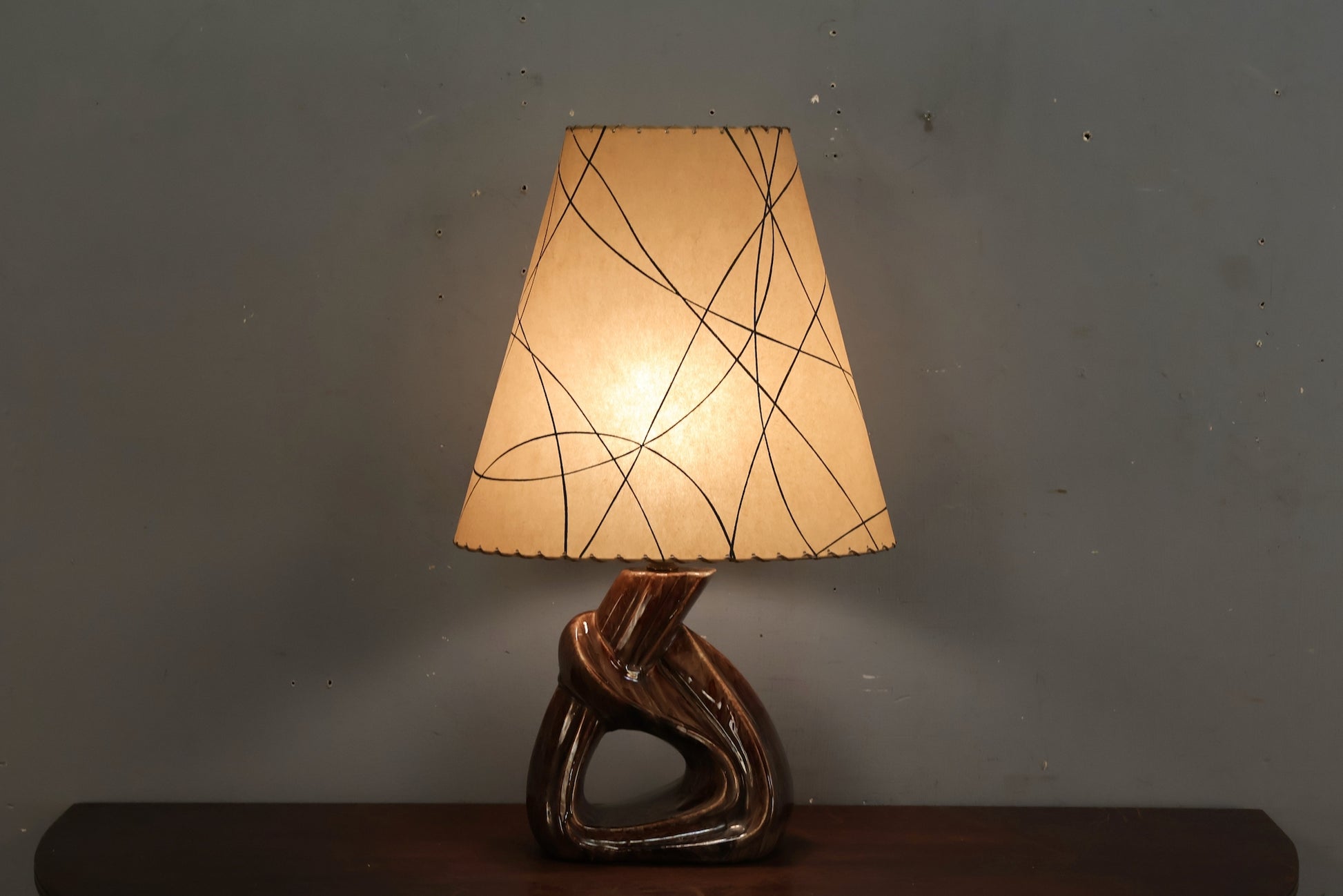 Chic brown ceramic knot lamp with funky fiberglass lampshade. In good condition, light wear.