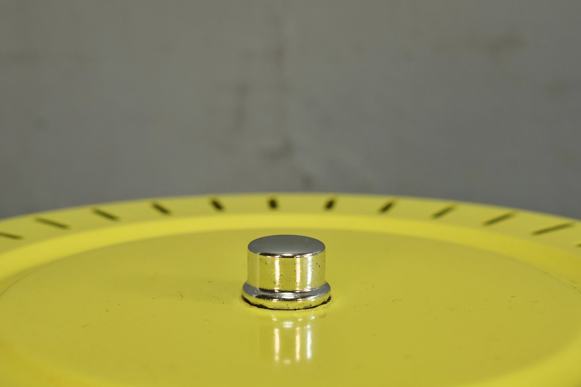 Funky yellow table lamp that's a nice blend of metal and plastic components. In good condition, light wear.