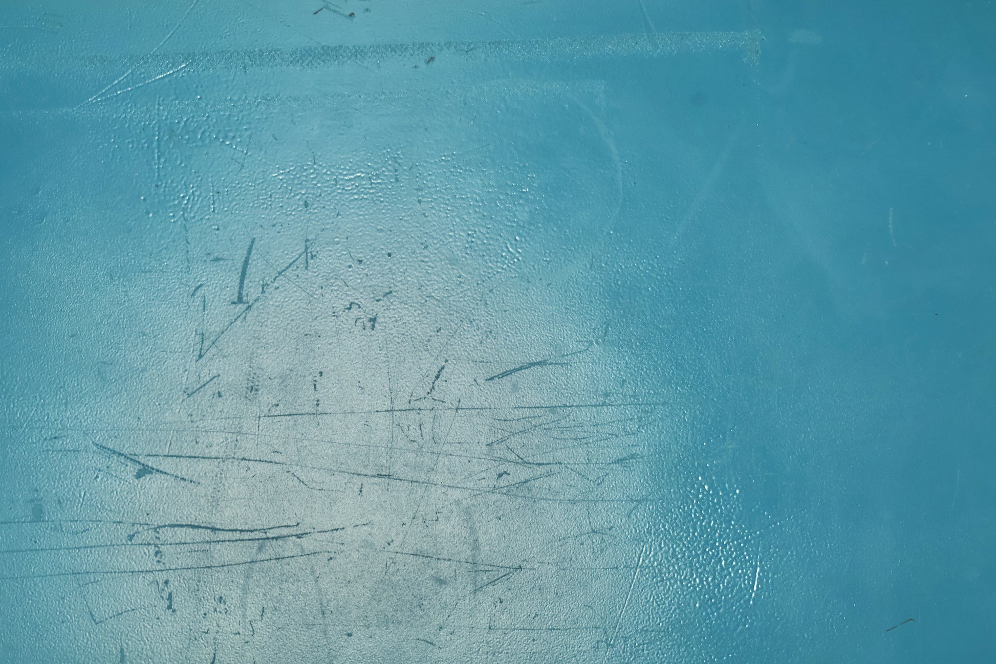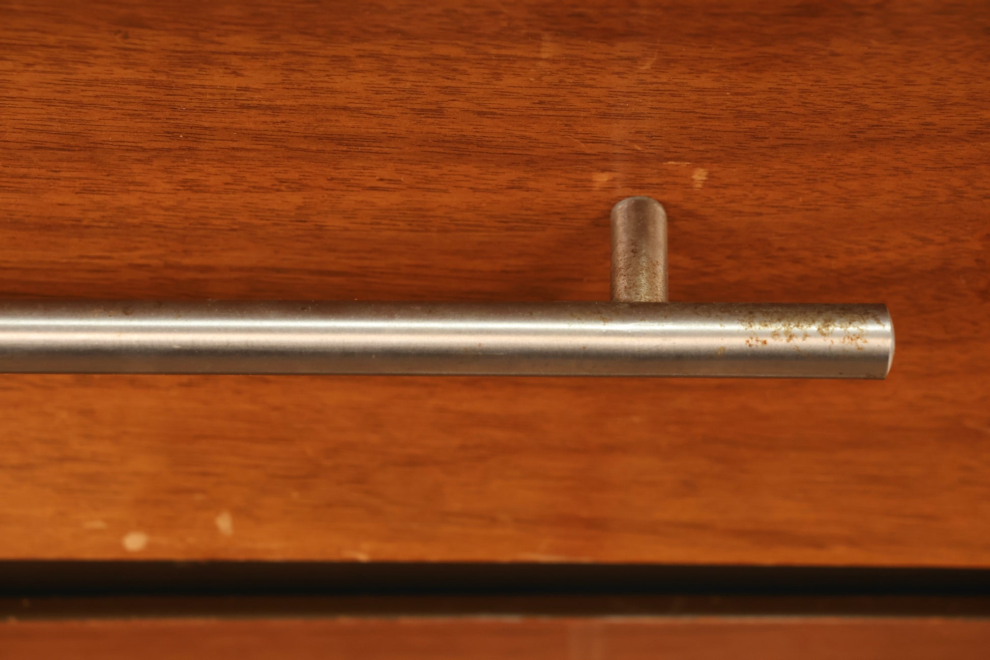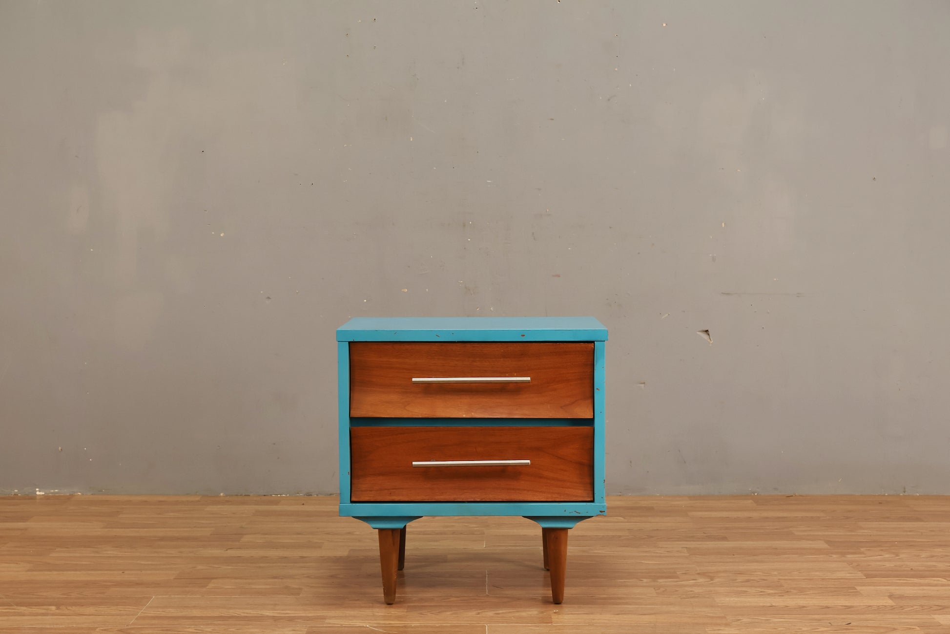 Funky mid century walnut nightstand with blue painted frame and two concave front drawers. Sure to pop by your bedside! Paint job was likely done by the previous owner who had too much time on their hands. In good condition, chipping and scuffing to paint finish, some scratching and wear throughout.