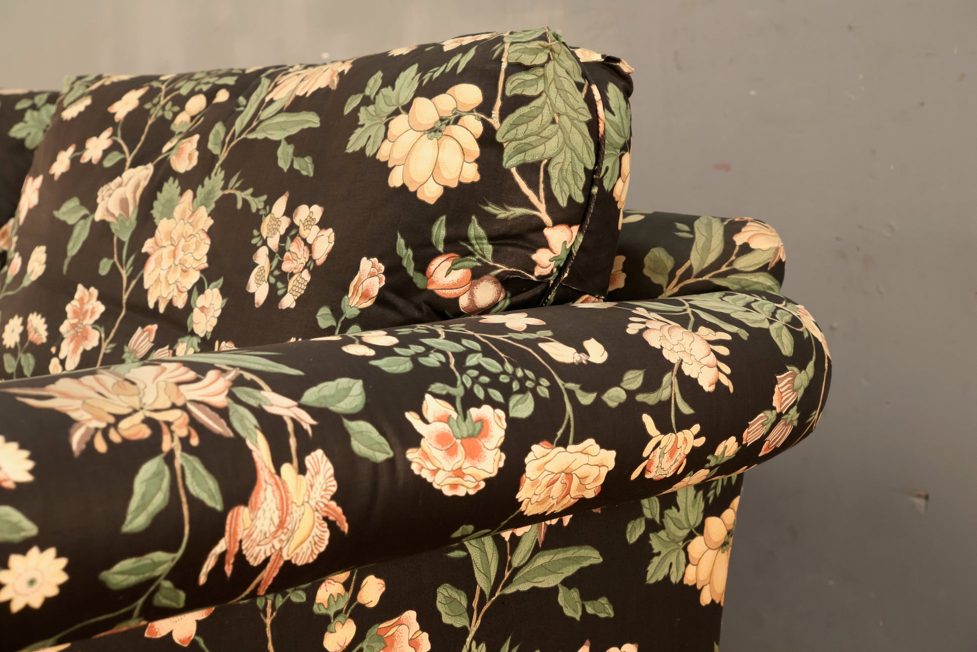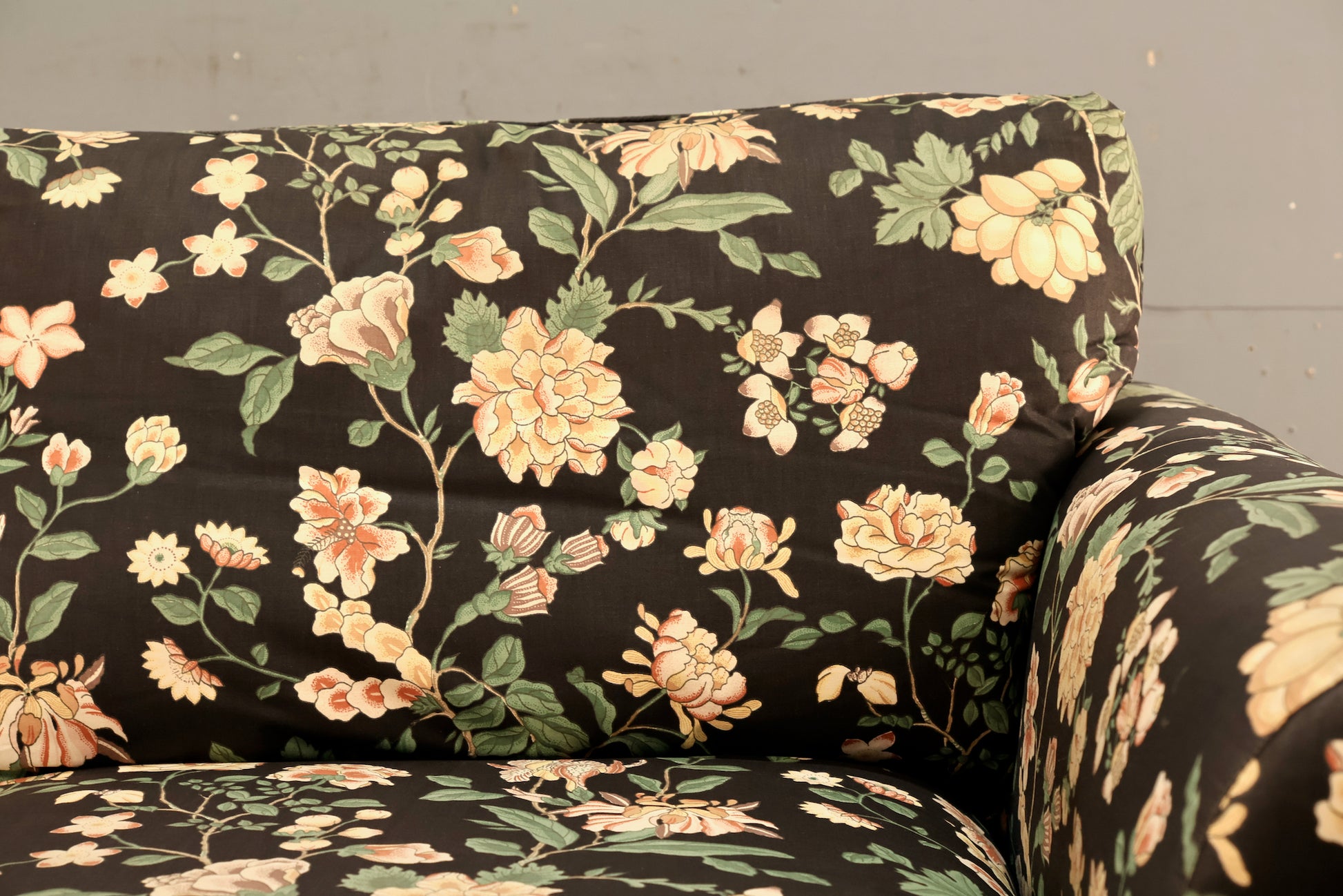 Not your typical granny floral sofa! Pastel pink floral-patterned upholstery is set against a soft black background. Made by Henredon Furniture. Finished with rolled armrests and a skirted bottom. Has a nice deep, comfortably cushioned sit. Seat height is 16 inches. In good condition, minimal wear. Disclaimer: This piece is not available to view in-store. It is for sale online only, and by appointment at our NJ warehouse. Once purchased, it will be transported to our Manhattan store for pick-up or delivery. All sales are FINAL. Please call if you have any questions regarding the piece prior to purchase or to place a 15% deposit to see the piece in-person in our store.