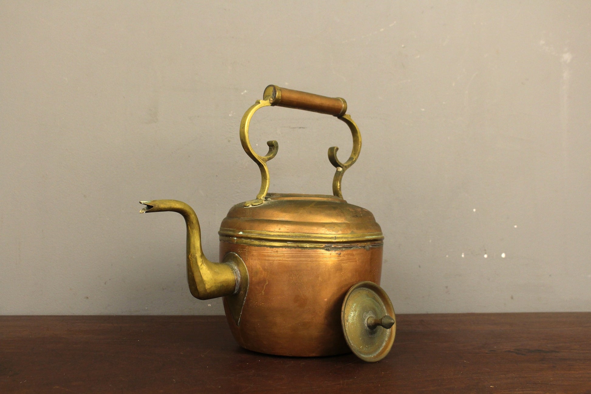 Old copper tea kettle! Great item for the shelf. In good condition, with some general wear.