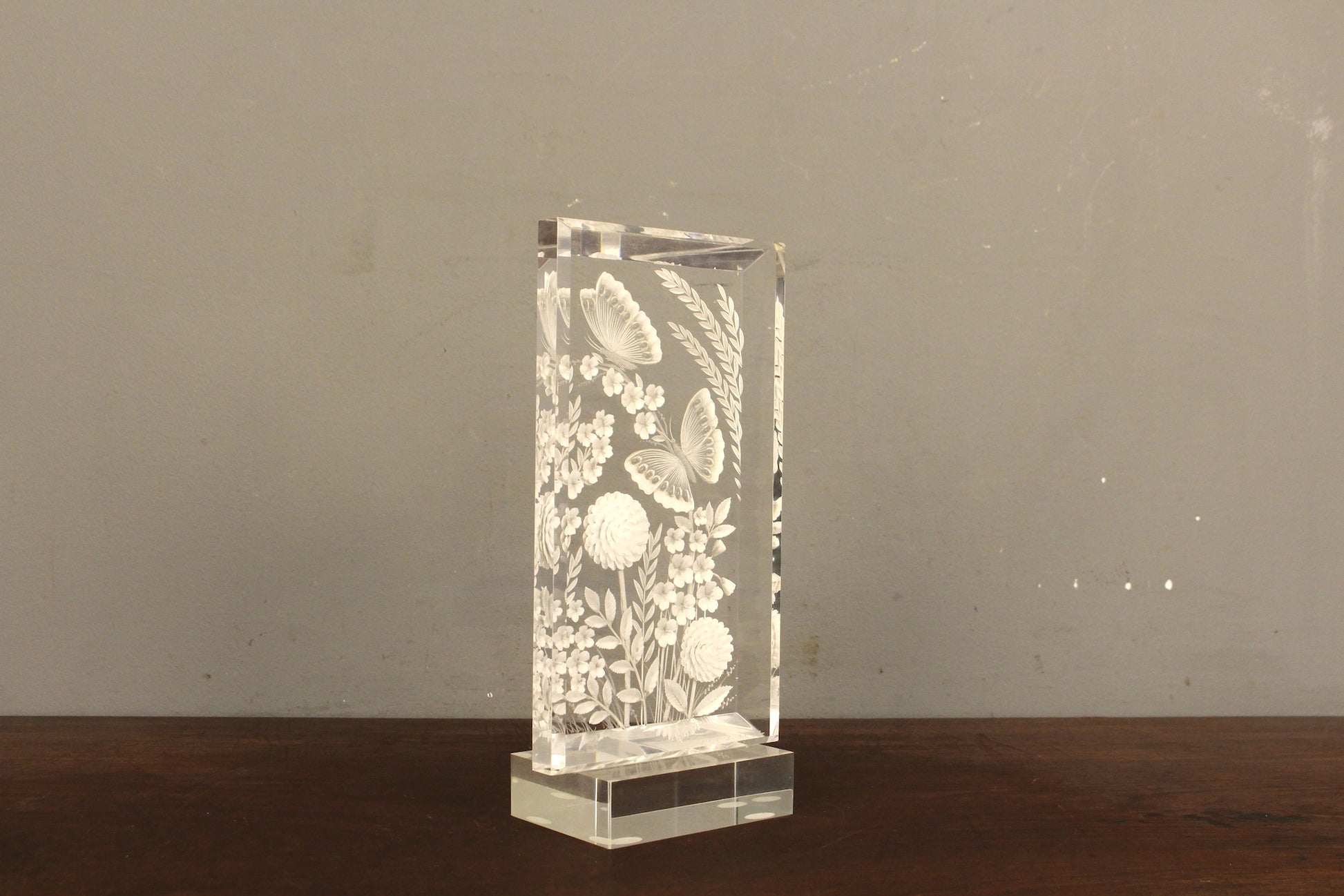 Whimsical etched lucite sculpture! Looks great in the light. Signed. Heavy. In good condition, light wear.