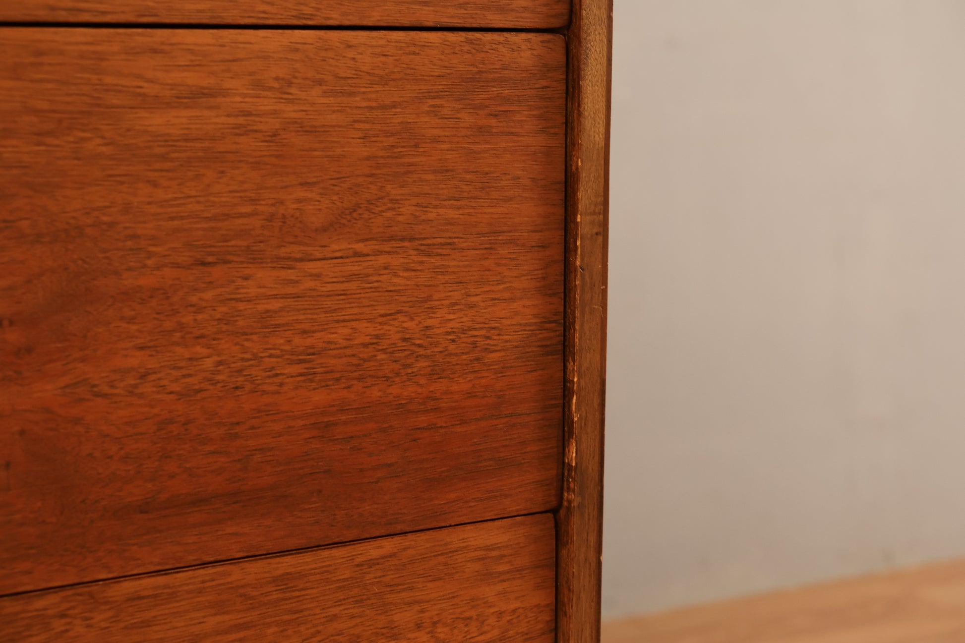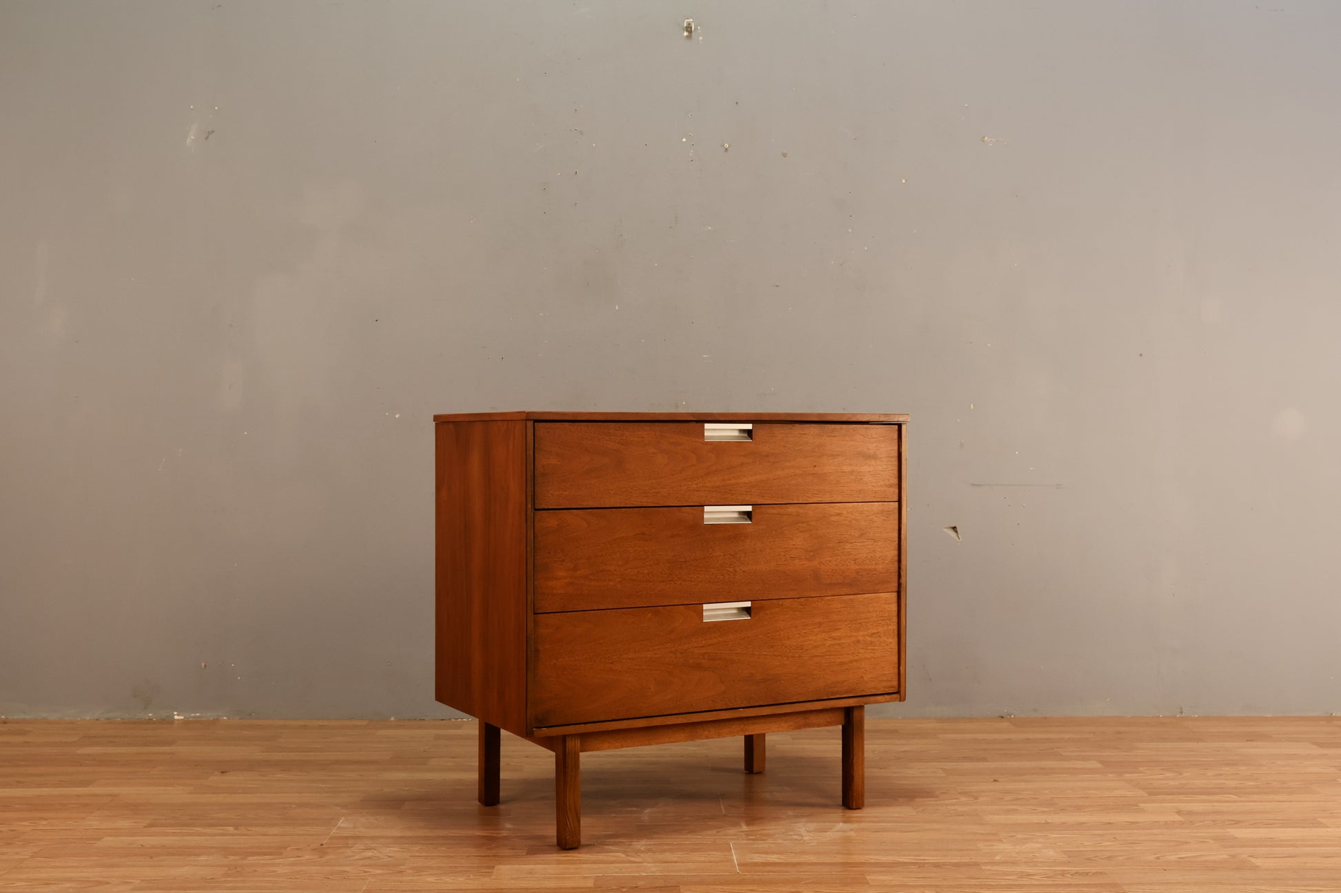 Compact mid century dresser with industrial metal hardware. Features walnut construction with woodgrain laminate top. In good condition, light wear.