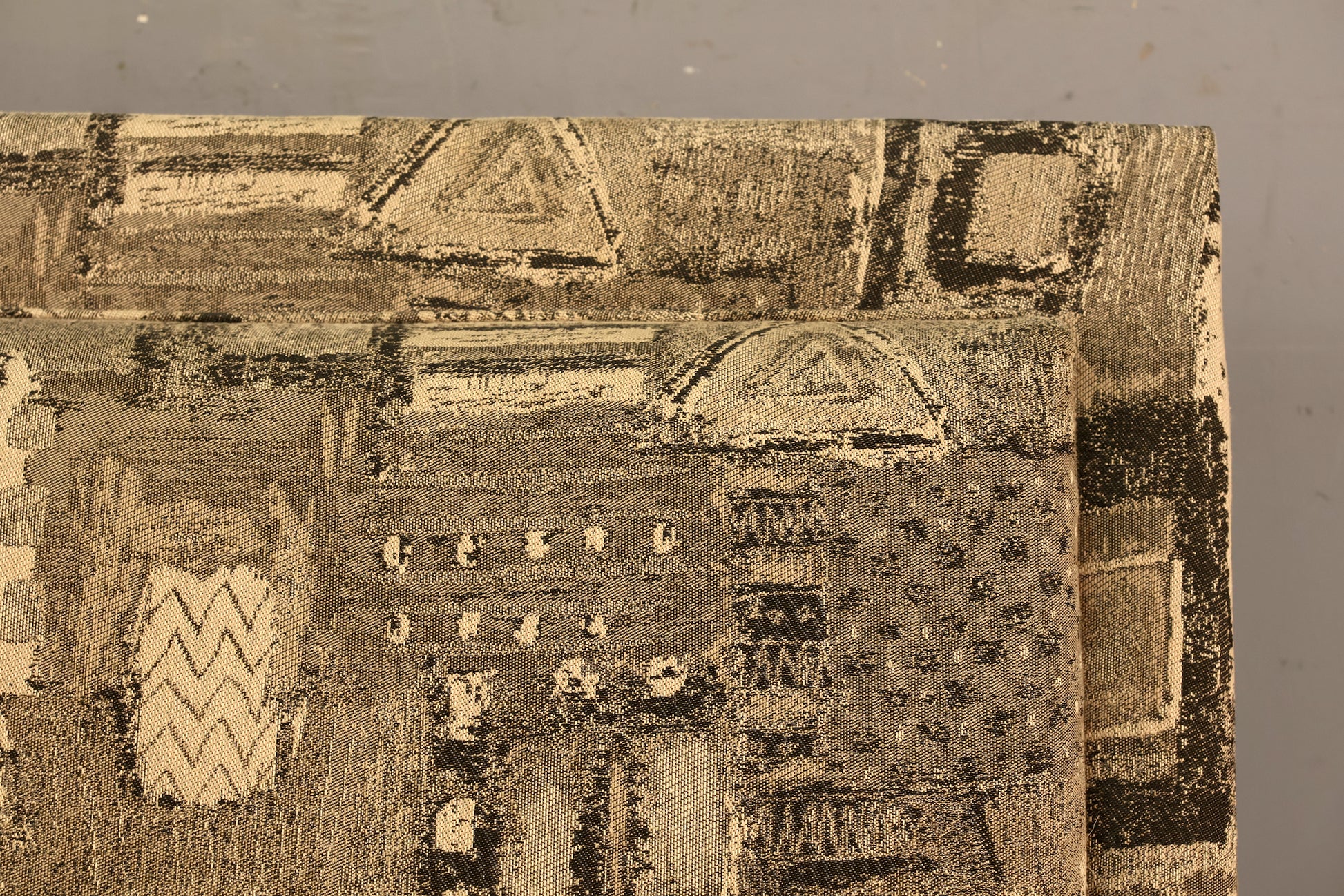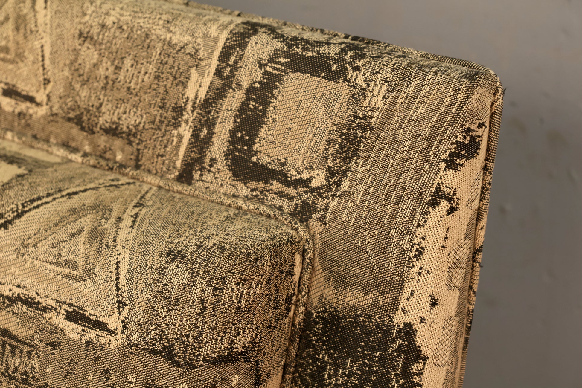 Boxy asymmetrical loveseat finished with a fun geometric upholstery in a grayscale palette. Nice and comfortable with a medium firmness to the cushions. Seat height is 17 inches. Compact size would suit any size space! In good condition, some light surface wear to the upholstery and frame. Small hole to fabric under one of the cushions. Disclaimer: This piece is not available to view in-store. It is for sale online only, and by appointment at our NJ warehouse. Once purchased, it will be transported to our Manhattan store for pick-up or delivery. All sales are FINAL. Please call if you have any questions regarding the piece prior to purchase or to place a 15% deposit to see the piece in-person in our store.