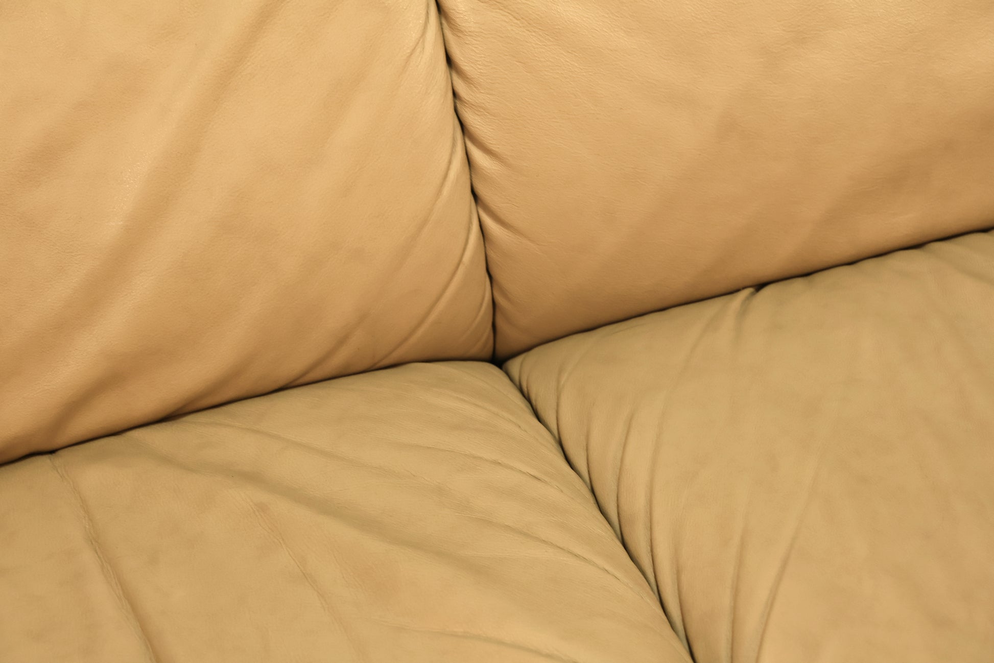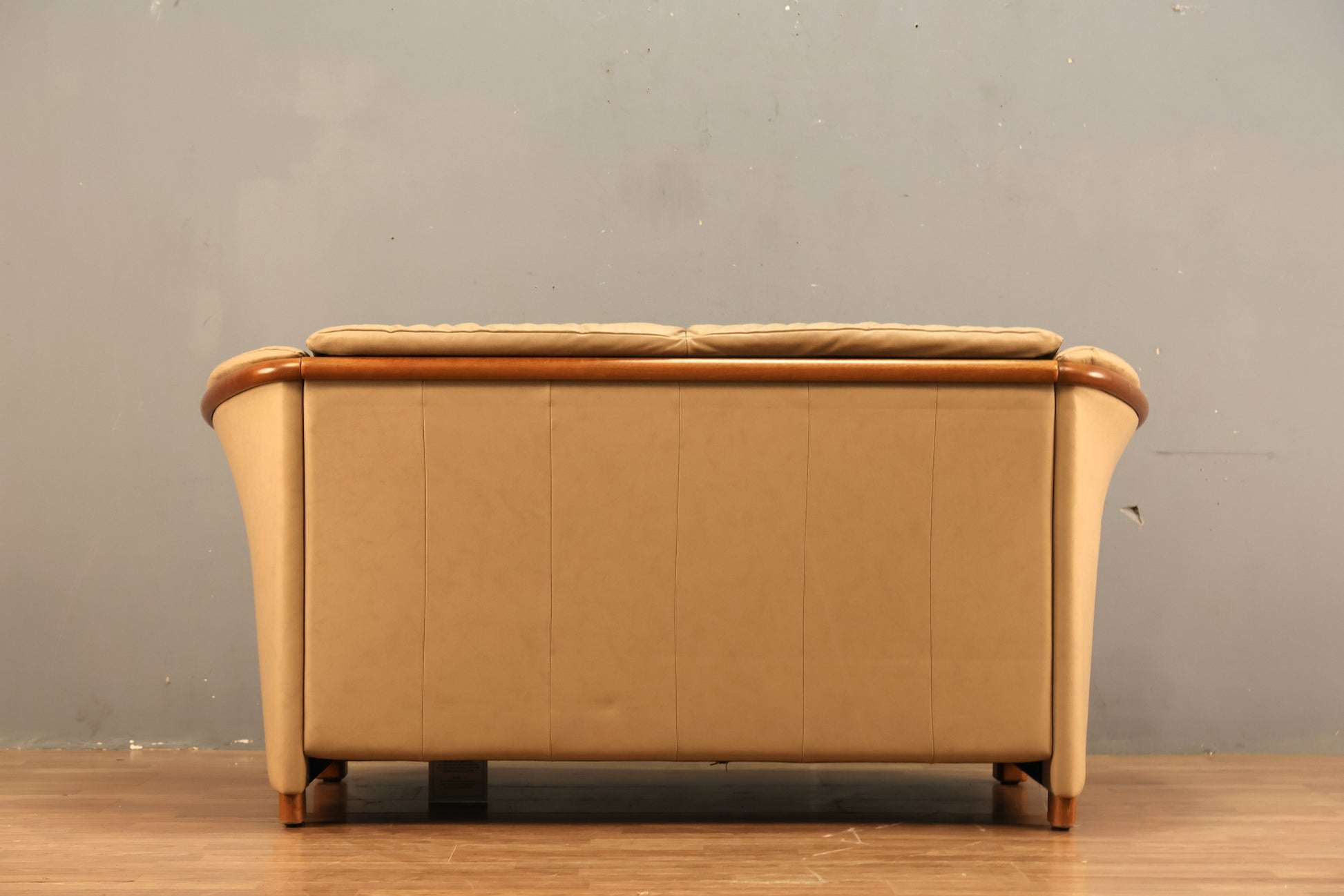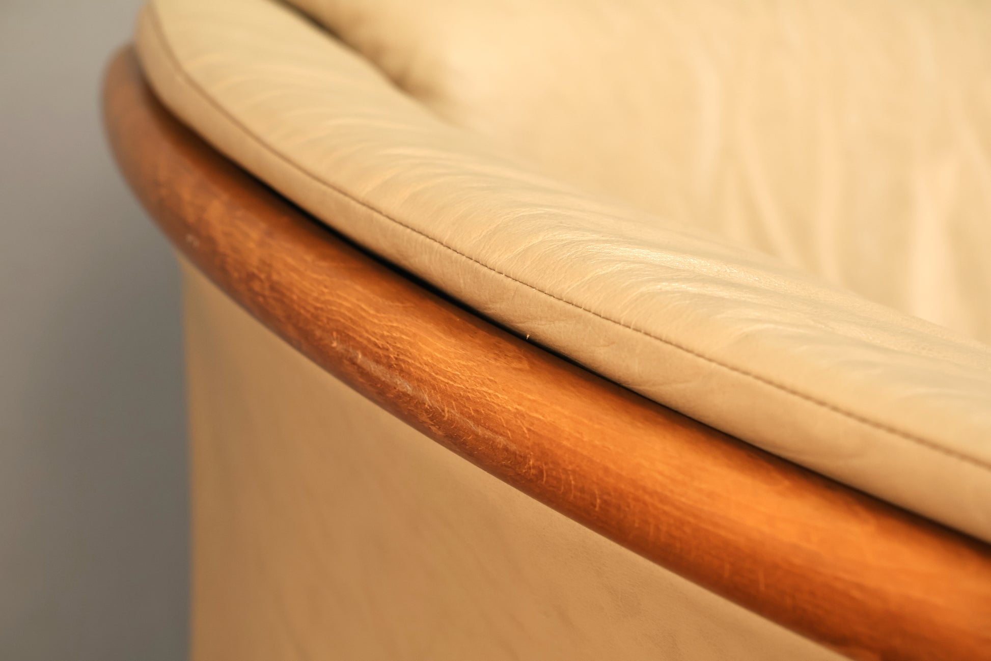 Luxurious and well-made loveseat from Norwegian manufacturer Ekornes. Made within the last 30 years, it's comfortable in a not-too-squishy sort of way and made to last. Supple creamy-beige leather upholstery with birch trim. In good condition, light wear.
