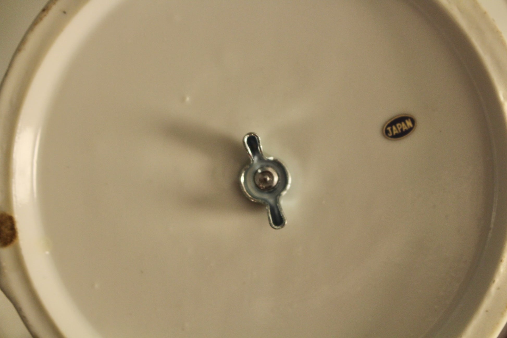 Charming as ever vanity mirror. Painted ceramic base. Double-sided articulating magnifying mirror. Some light spots on the mirror. Minor wear to the base.