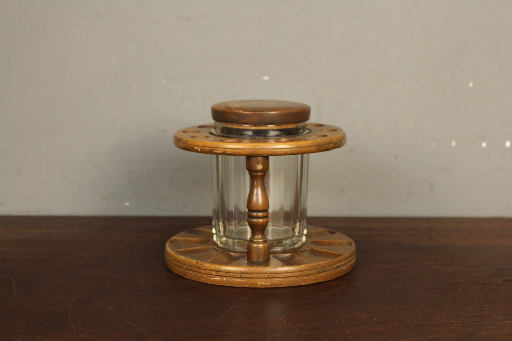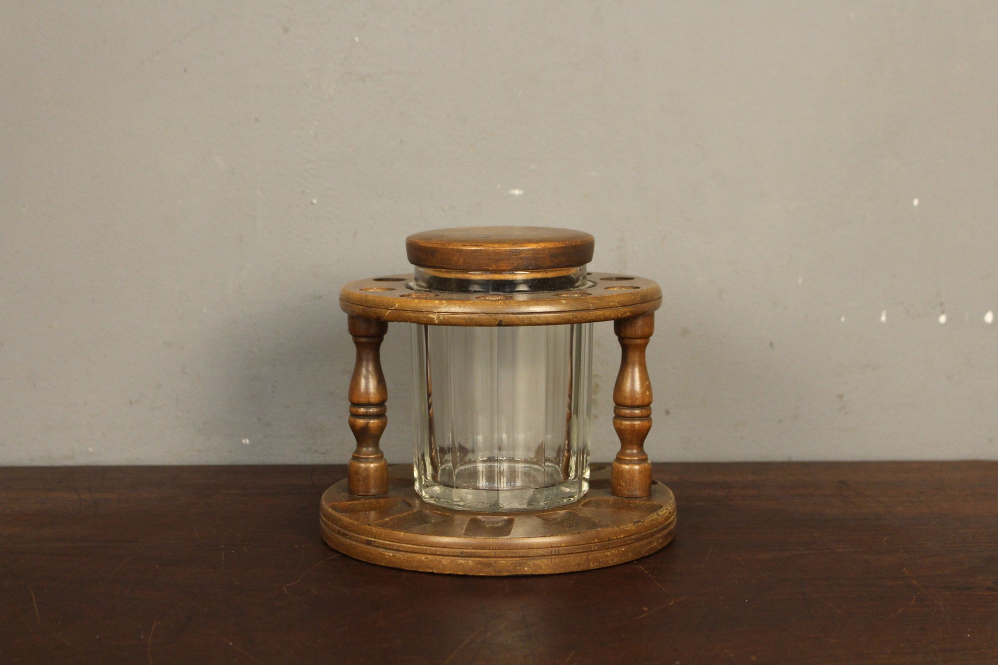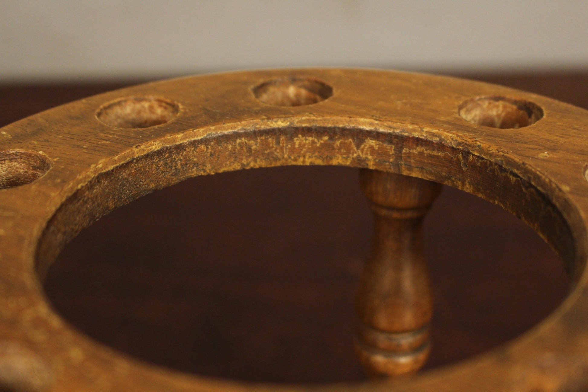 Very cool wooden pipe display with jar in the center for your tobacco! In good condition, with some notable surface scratches. Does not rotate.