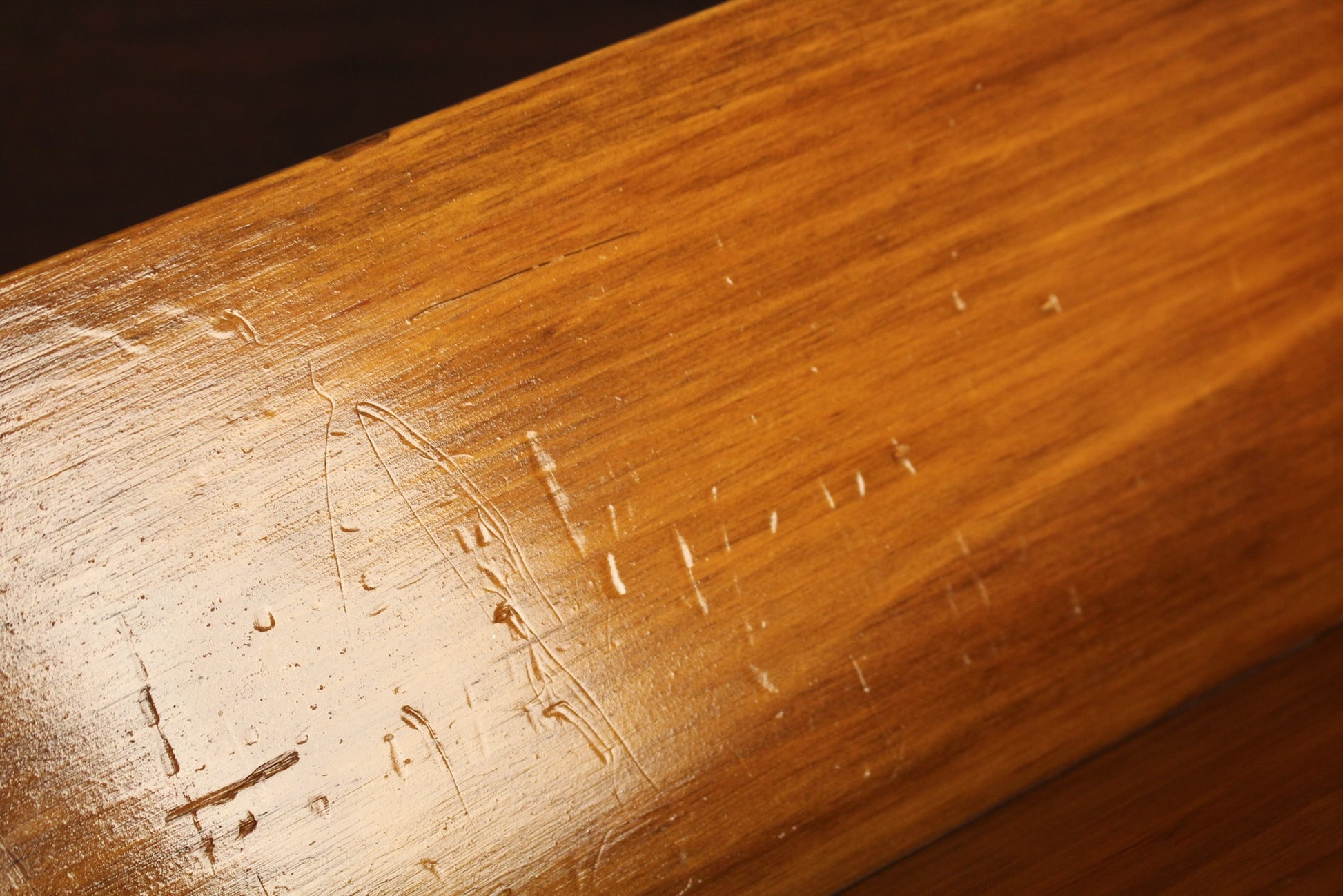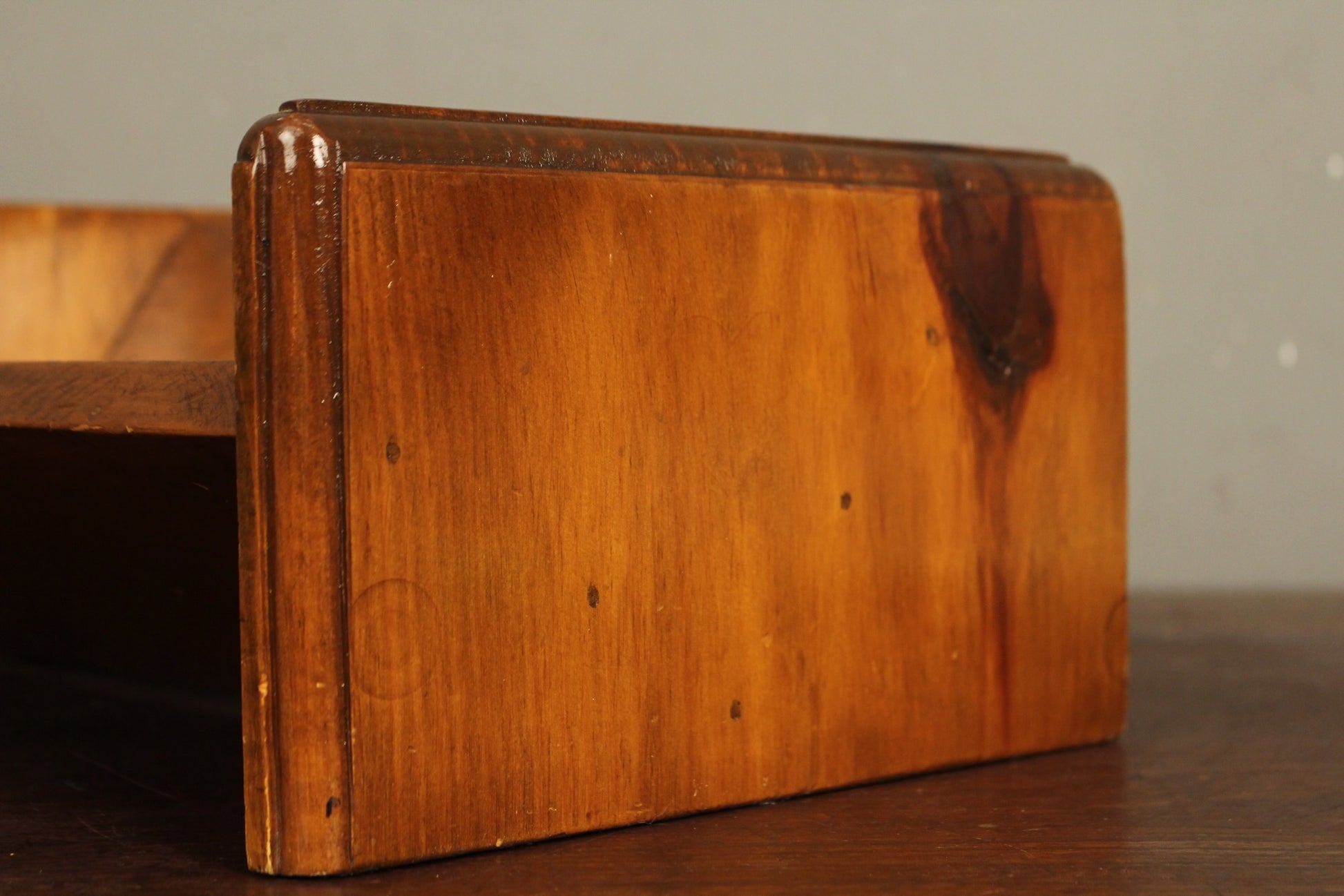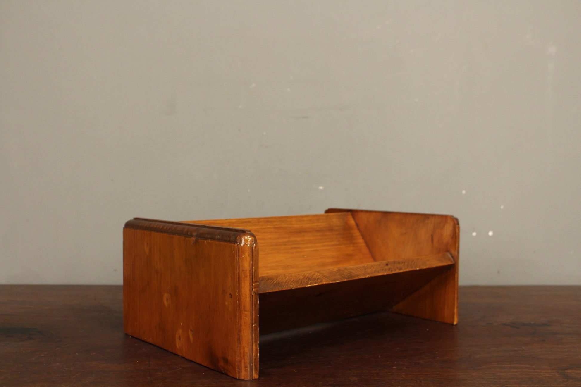 Warm pine book stand with a nice glossy finish. Some wear that adds to the vintage charm.