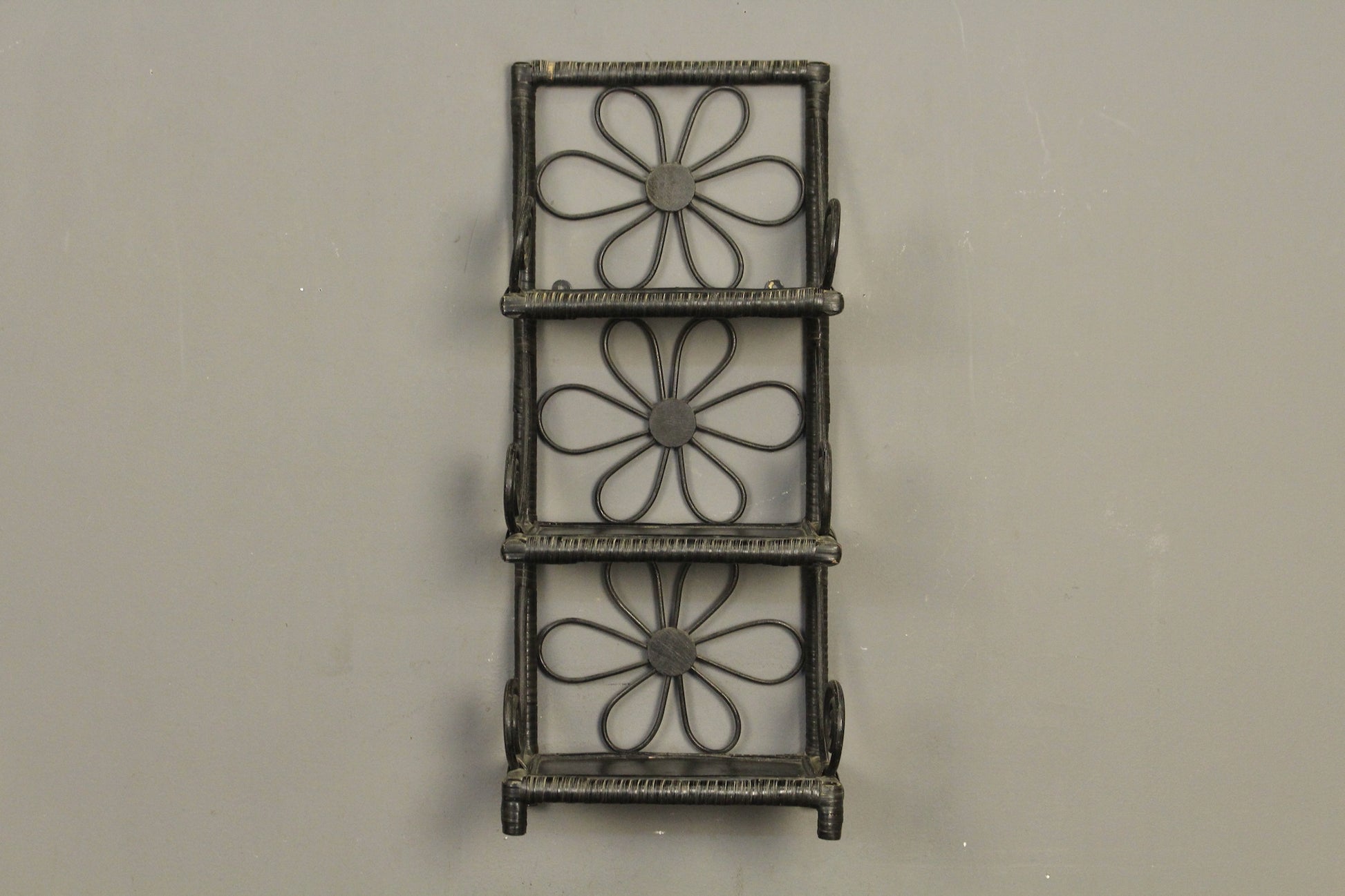 Charming rattan wall shelf perfect for a living space or bathroom. Slim rattan frame with daisy accents and a black-painted finish. In good condition, some surface wear that adds to the charm.