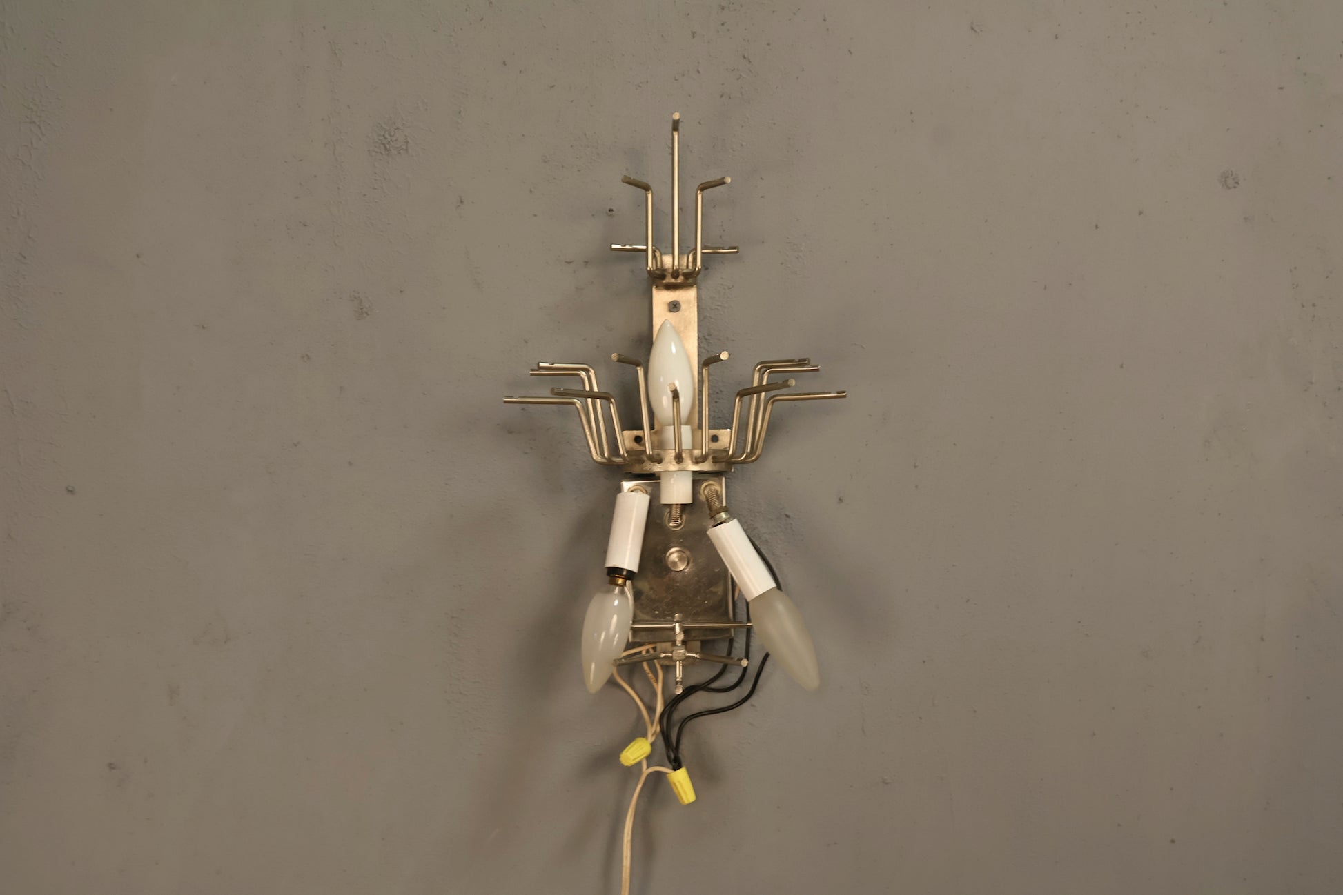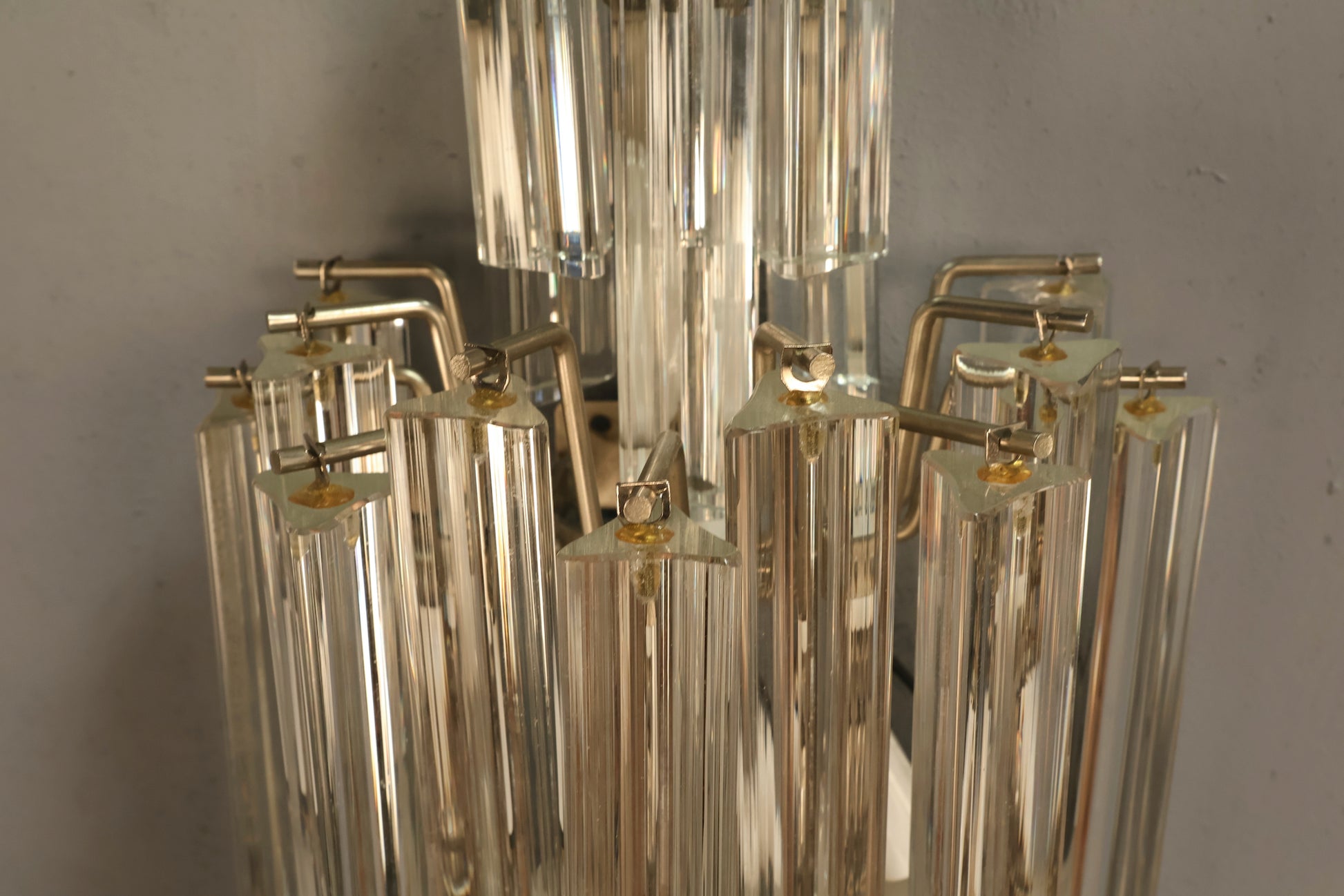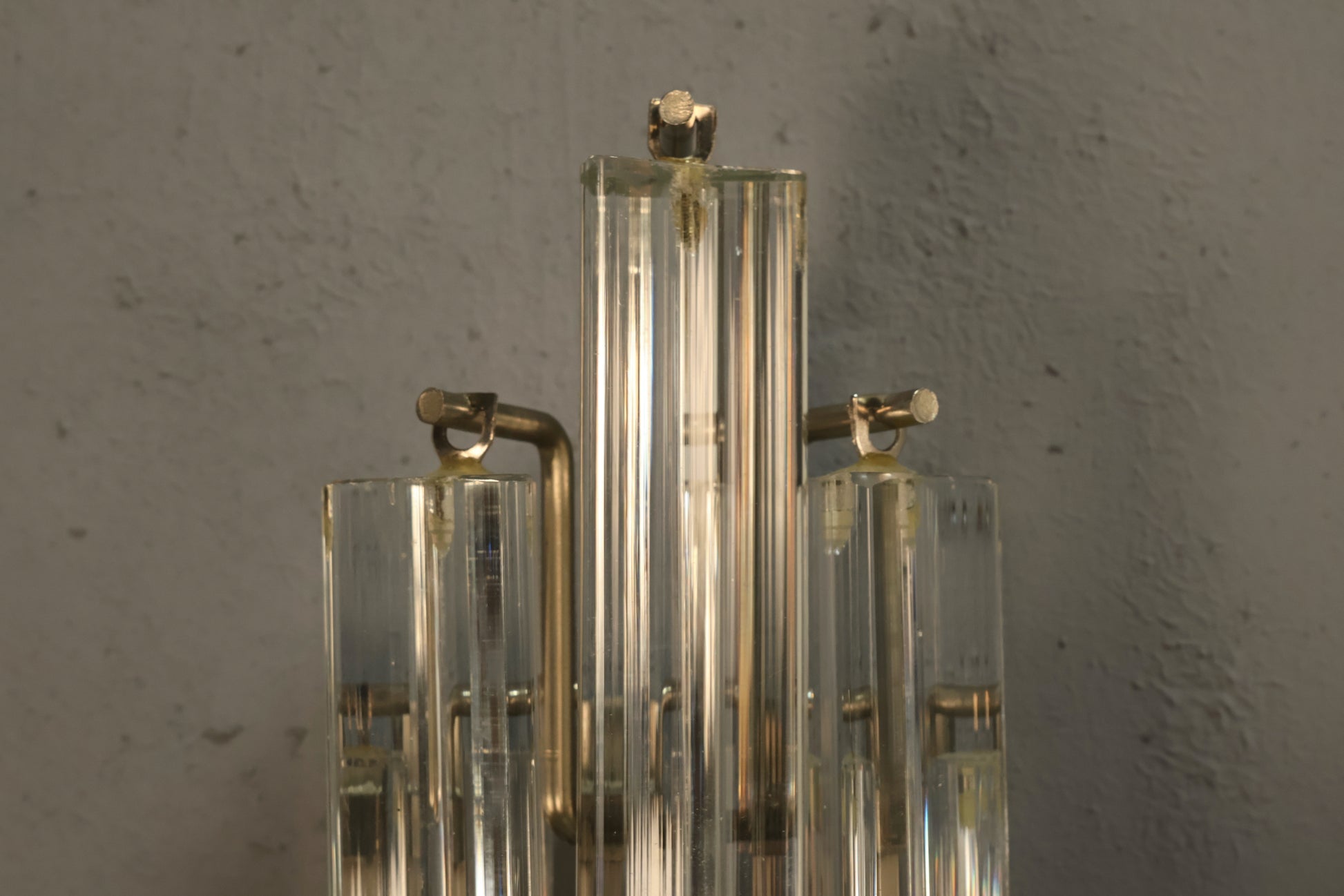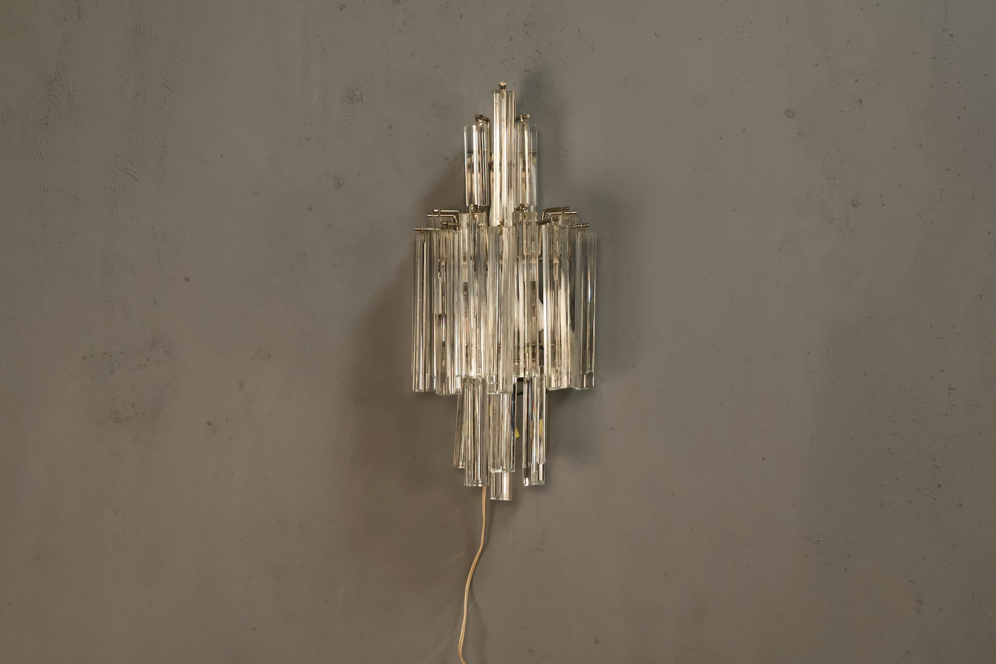 Luxurious glass wall sconce fit for a glamorous space! Lovely design with layered murano glass fixtures that hang on a wall-mounted metal frame. In good condition, hairline crack in one of the glass pieces.