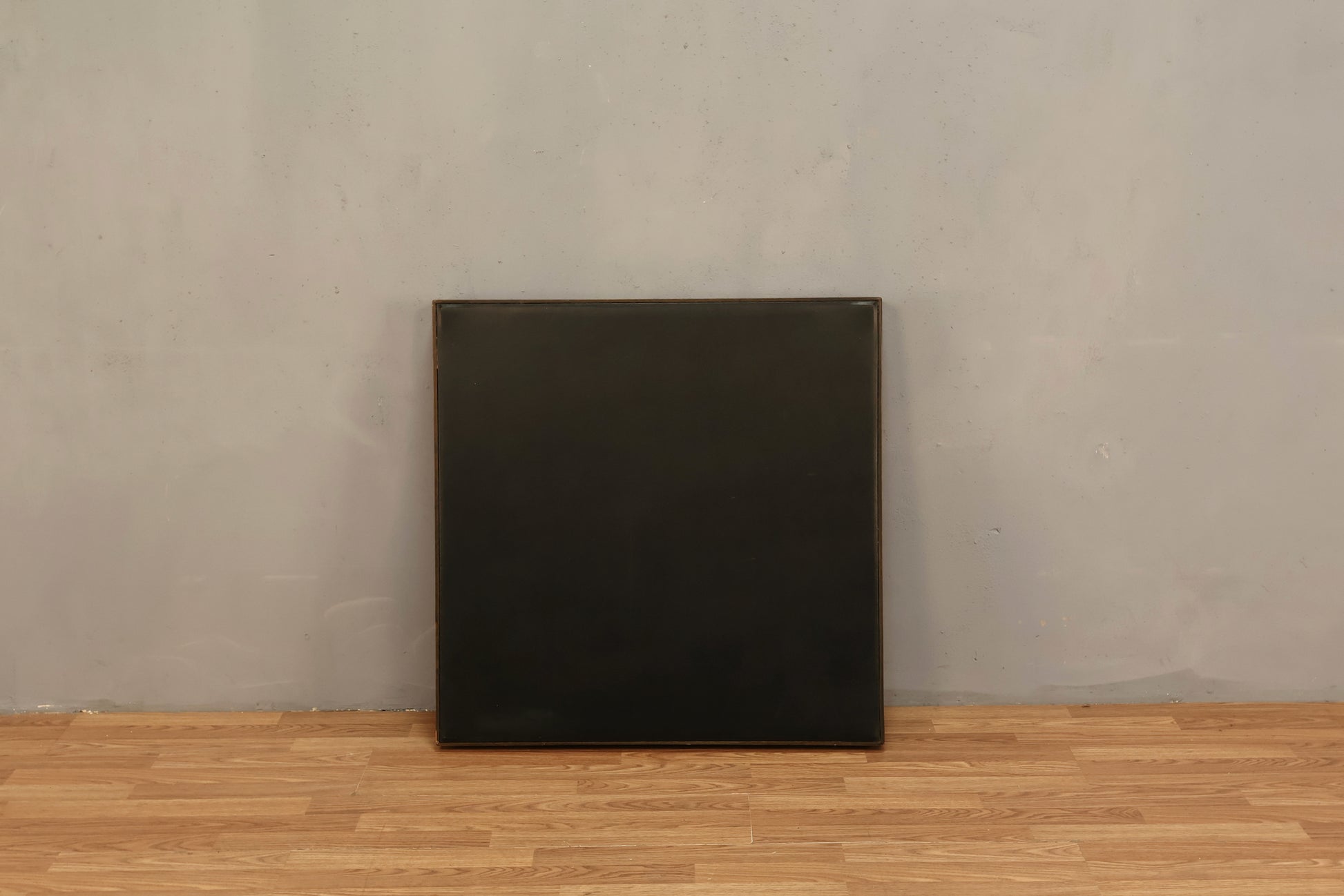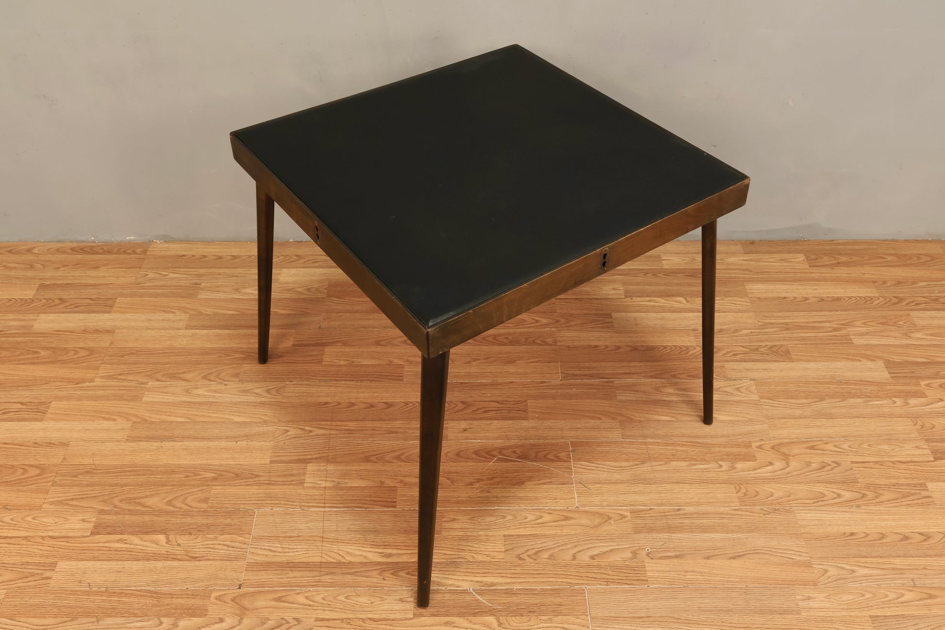 Sophisticated mid century folding card table with a dark walnut frame and black vinyl top. Smaller than the average card table. In good condition, minor surface and edge wear.