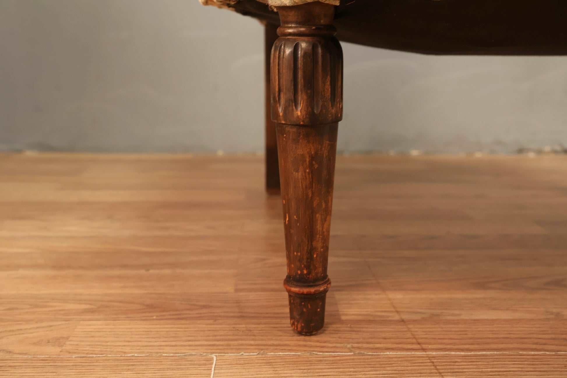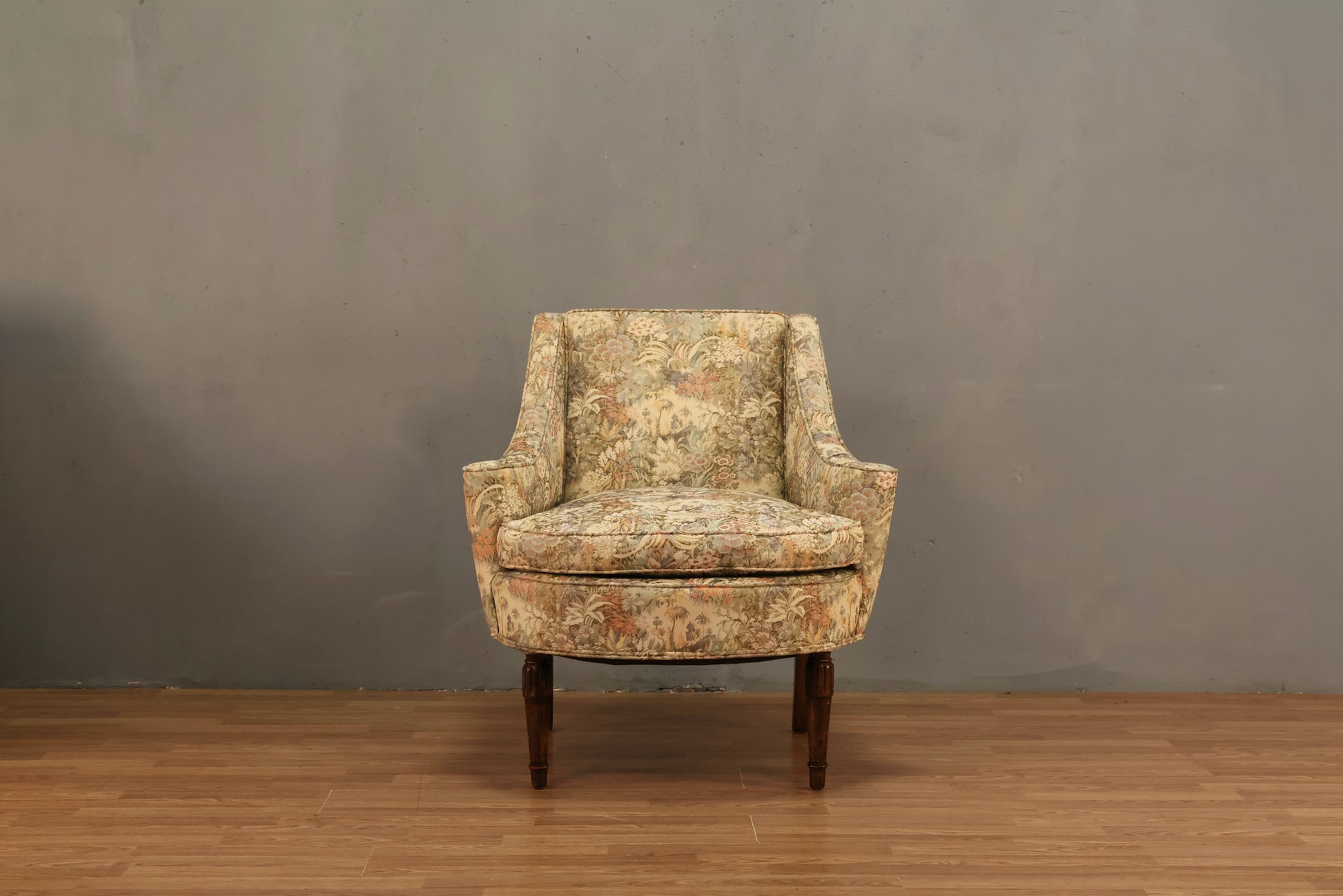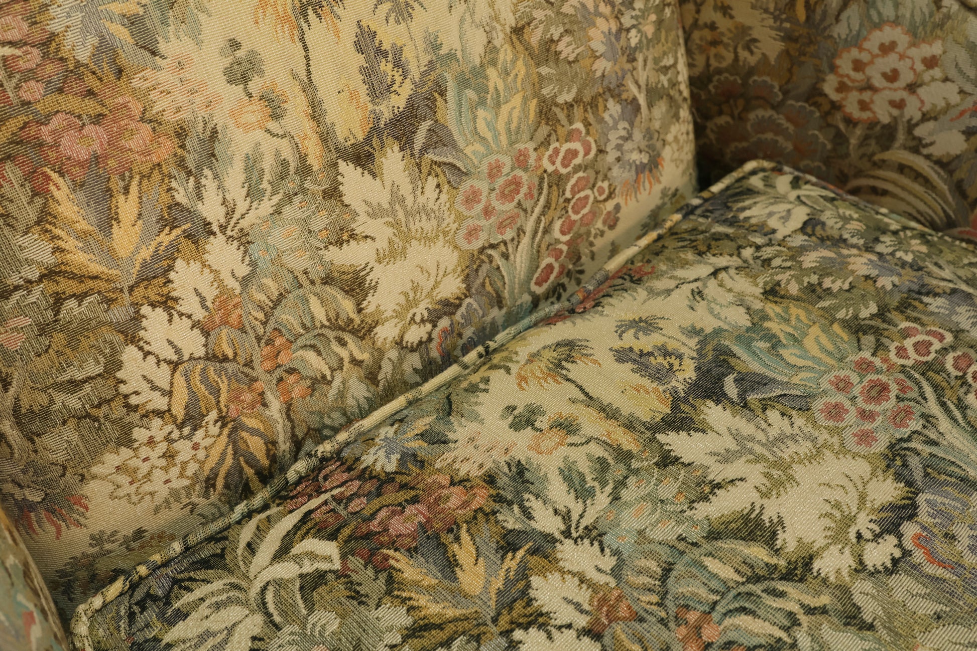 Enchanting lounge chair with elaborate floral upholstery and charming rolled armrests. Finished with carved wooden legs. In good condition, some scuffing to legs. Seat height is 19 inches. SOLD SEPARATELY. Disclaimer: This piece is not available to view in-store. It is for sale online only, and by appointment at our NJ warehouse. Once purchased, it will be transported to our Manhattan store for pick-up or delivery. All sales are FINAL. Please call if you have any questions regarding the piece prior to purchase or to place a 15% deposit to see the piece in-person in our store.