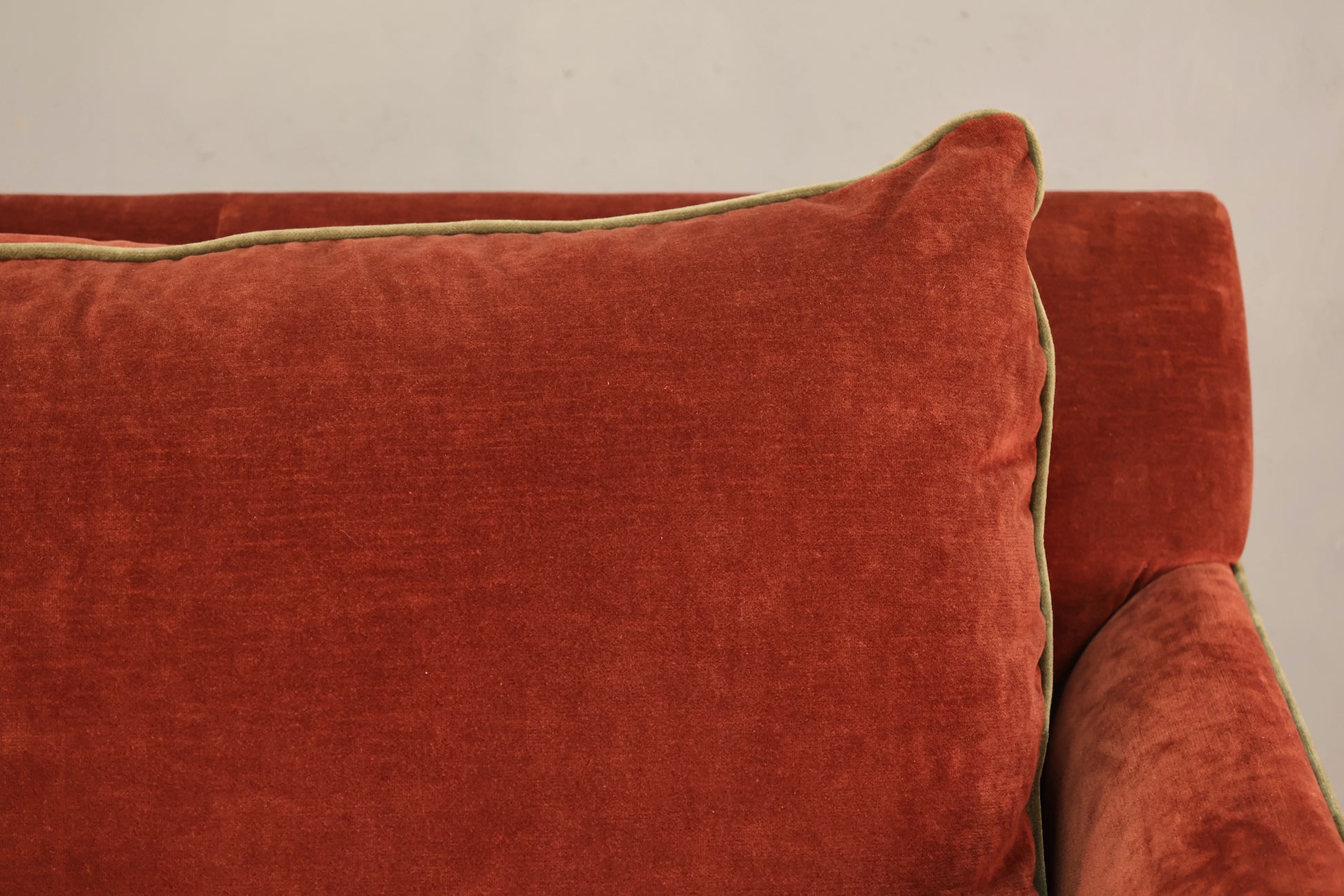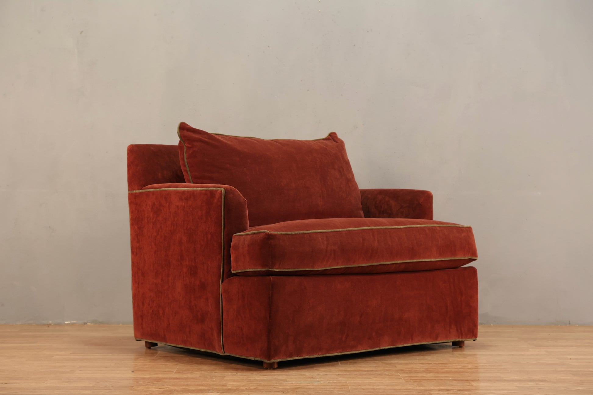 Mid Century compact loveseat that is as comfortable as it is cute! A unique size that we'd consider a 1.75-seater (instead of a 2-seater) - could fit two adults who are comfortable being snuggled up together (with the throw pillows removed), or one person with a child or dog, or just one person who really wants room to lounge. Soft maroon velveteen upholstery with an olive green piping. Seat height is 21 inches and armrest height is 27 inches. In good condition with some general surface wear. Backside fabric a little loose. Disclaimer: This piece is not available to view in-store. It is for sale online only, and by appointment at our NJ warehouse. Once purchased, it will be transported to our Manhattan store for pick-up or delivery. All sales are FINAL. Please call if you have any questions regarding the piece prior to purchase or to place a 15% deposit to see the piece in-person in our store.