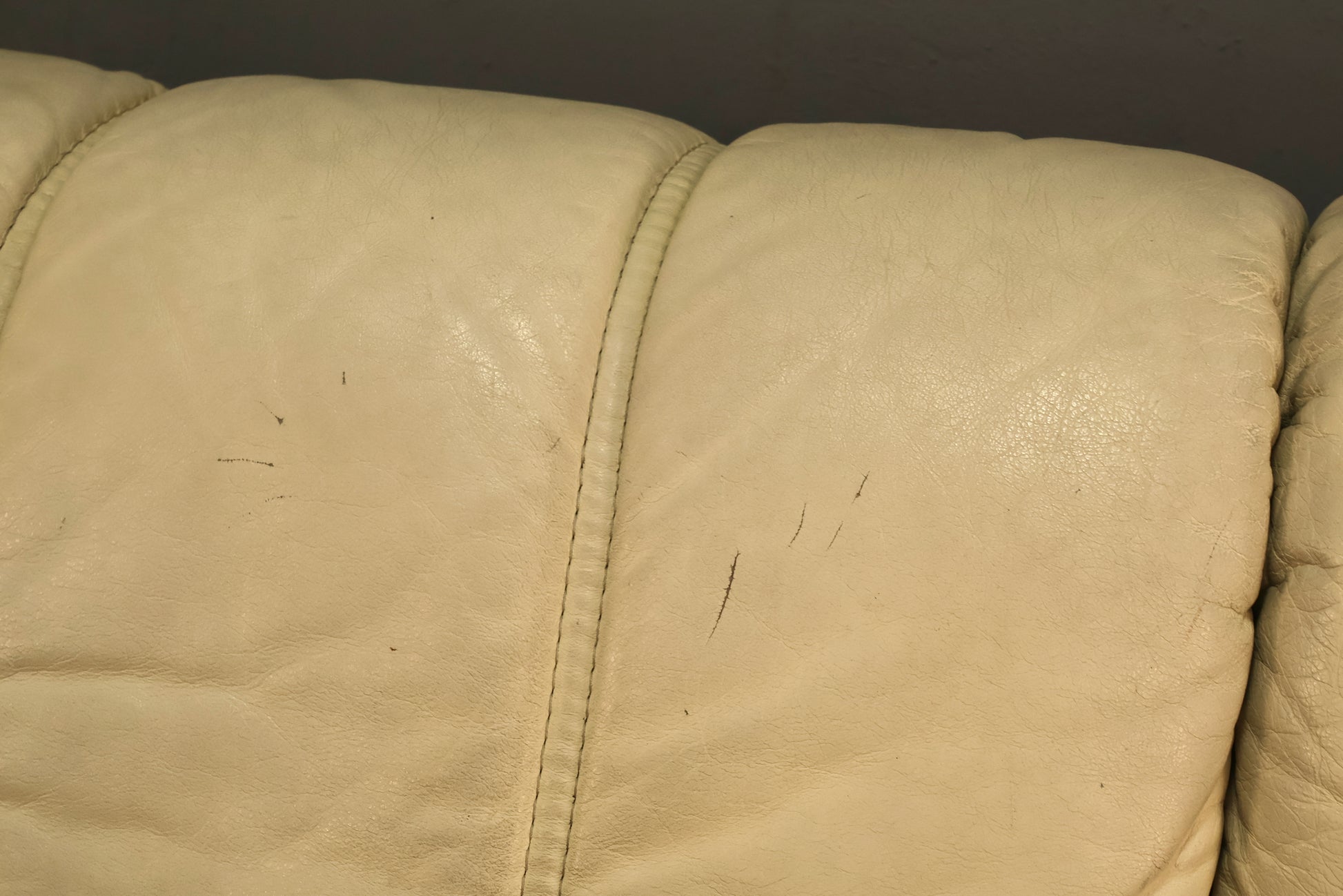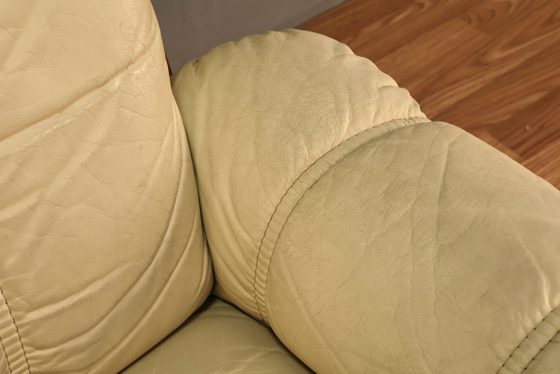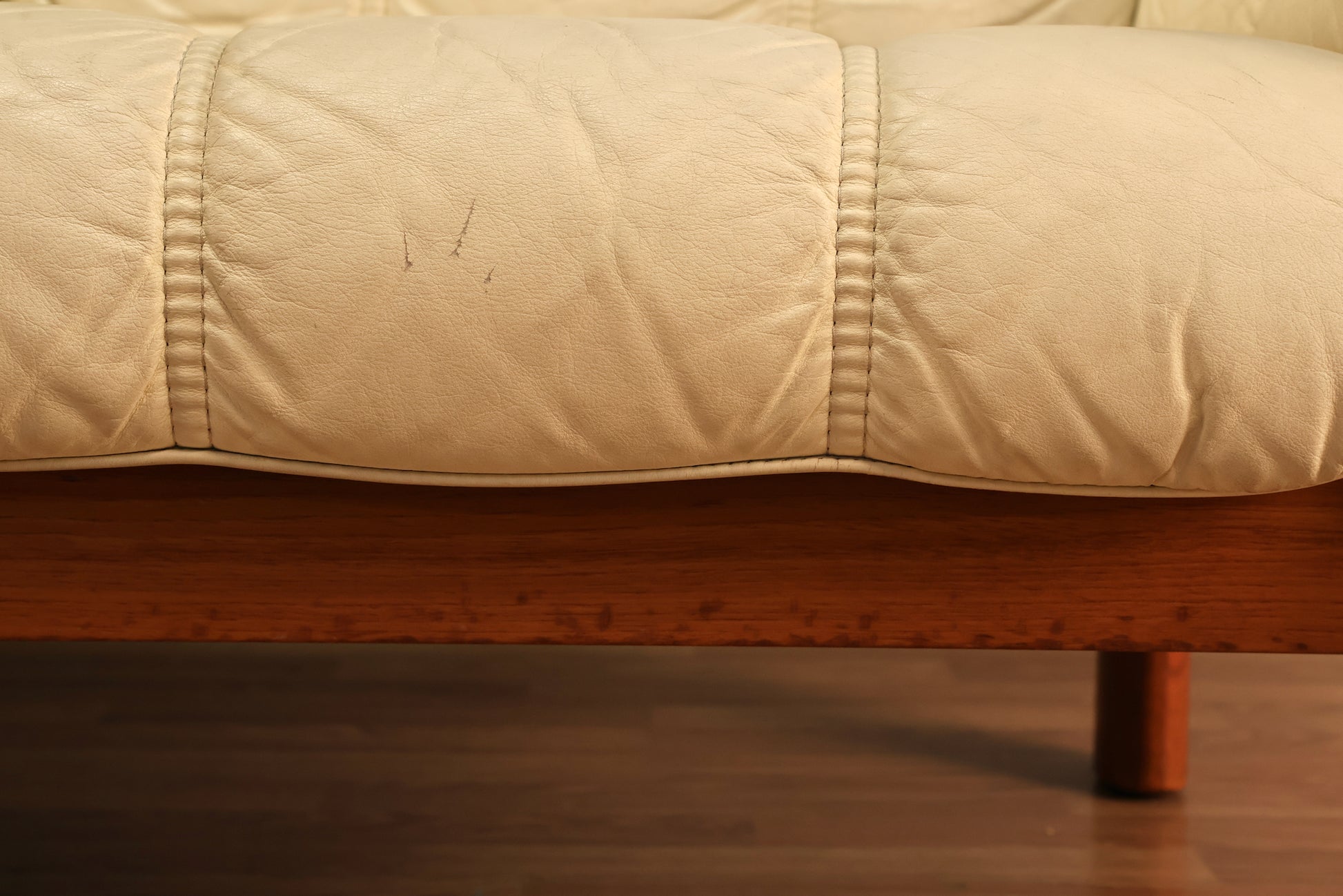 Incredibly chic sofa with a solid teak frame and ivory leather upholstery. Made by Ekornes in the 1970s. Well-constructed. Very comfortable, on the firmer side. Six cushions, all removable. Seat height 16" and armrest height 20". In good condition, minor marks to frame and leather. One hairline tear in seat cushion.