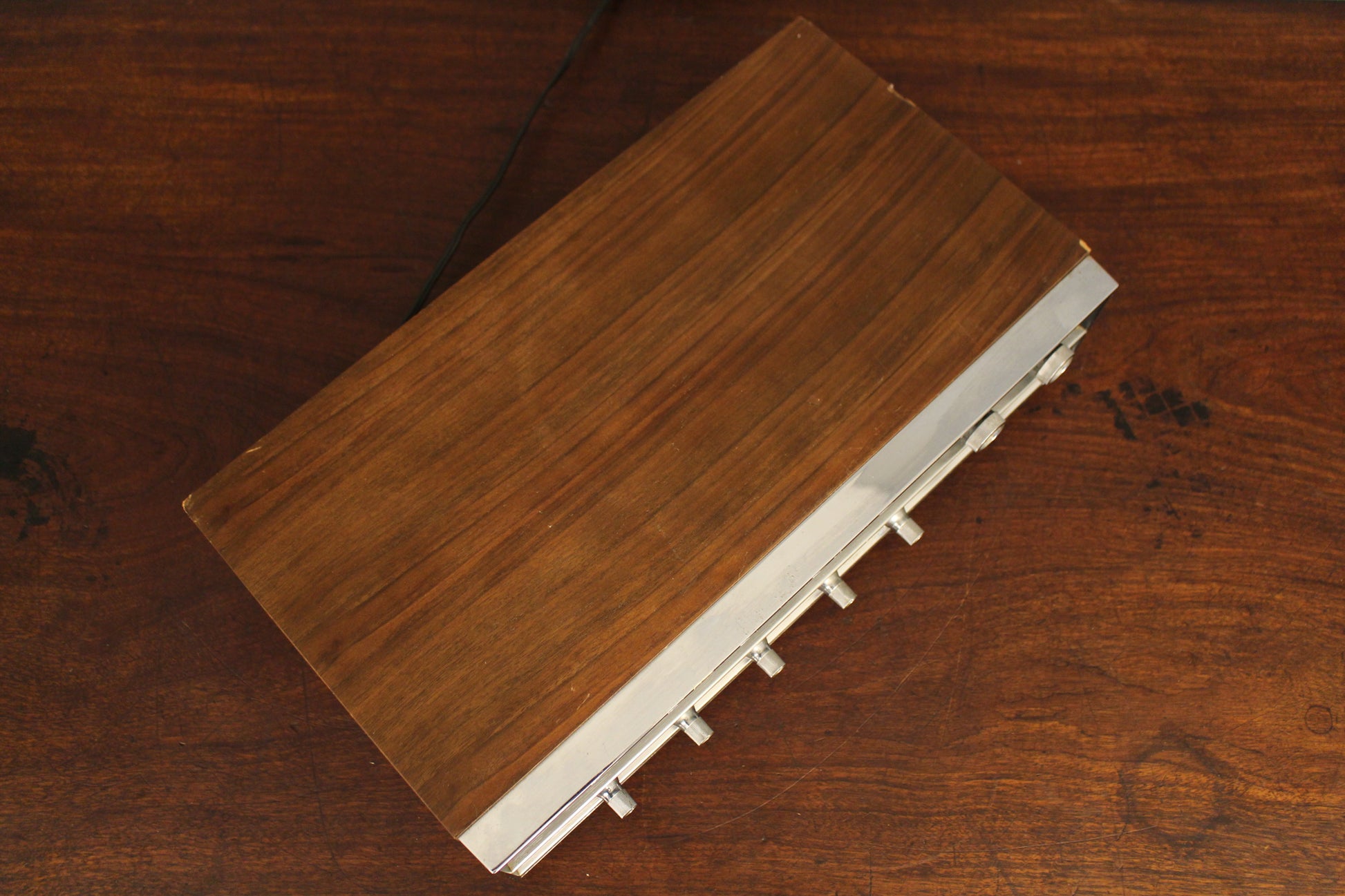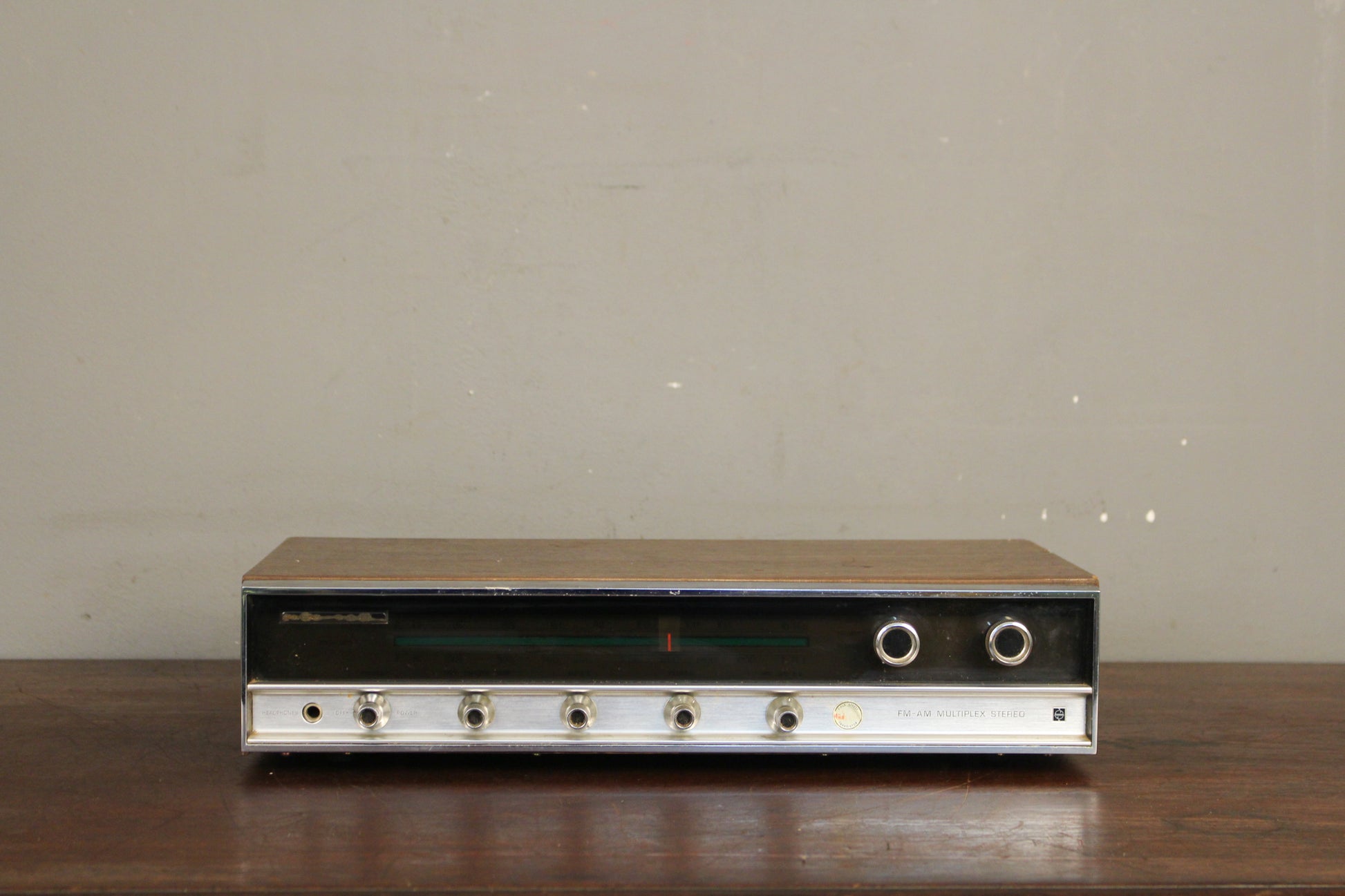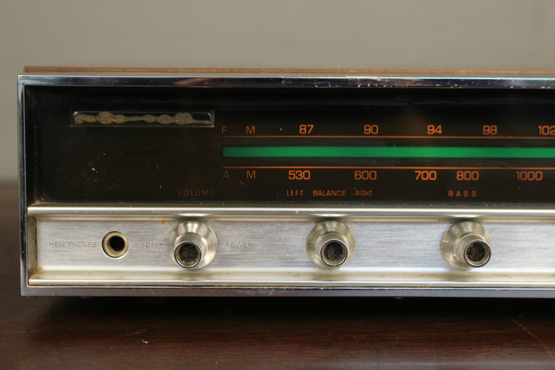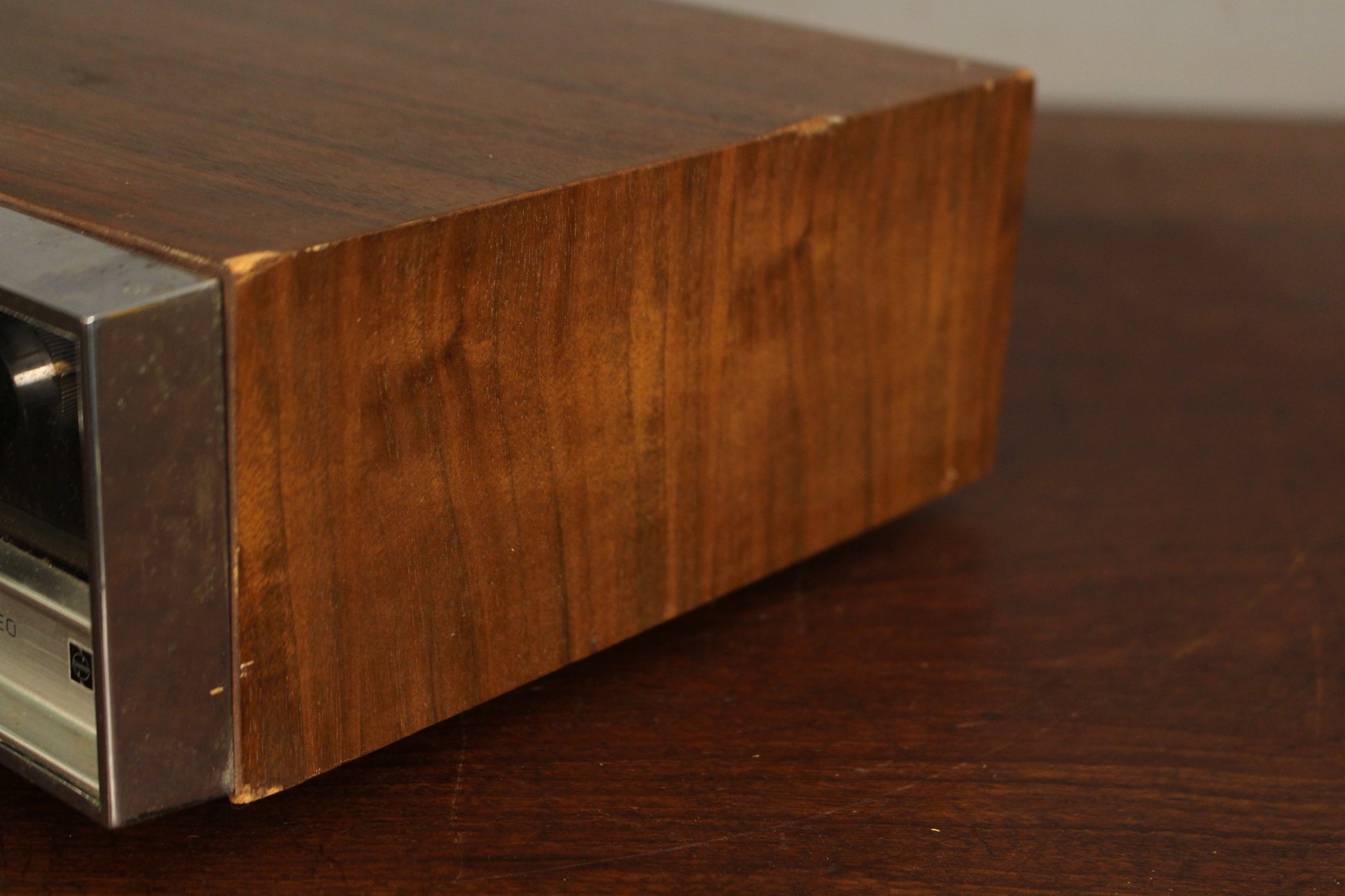 Slender stereo, perfect for stacking on your existing media set up! Woodgrain exterior. Works! In good condition, some wear around the edges.