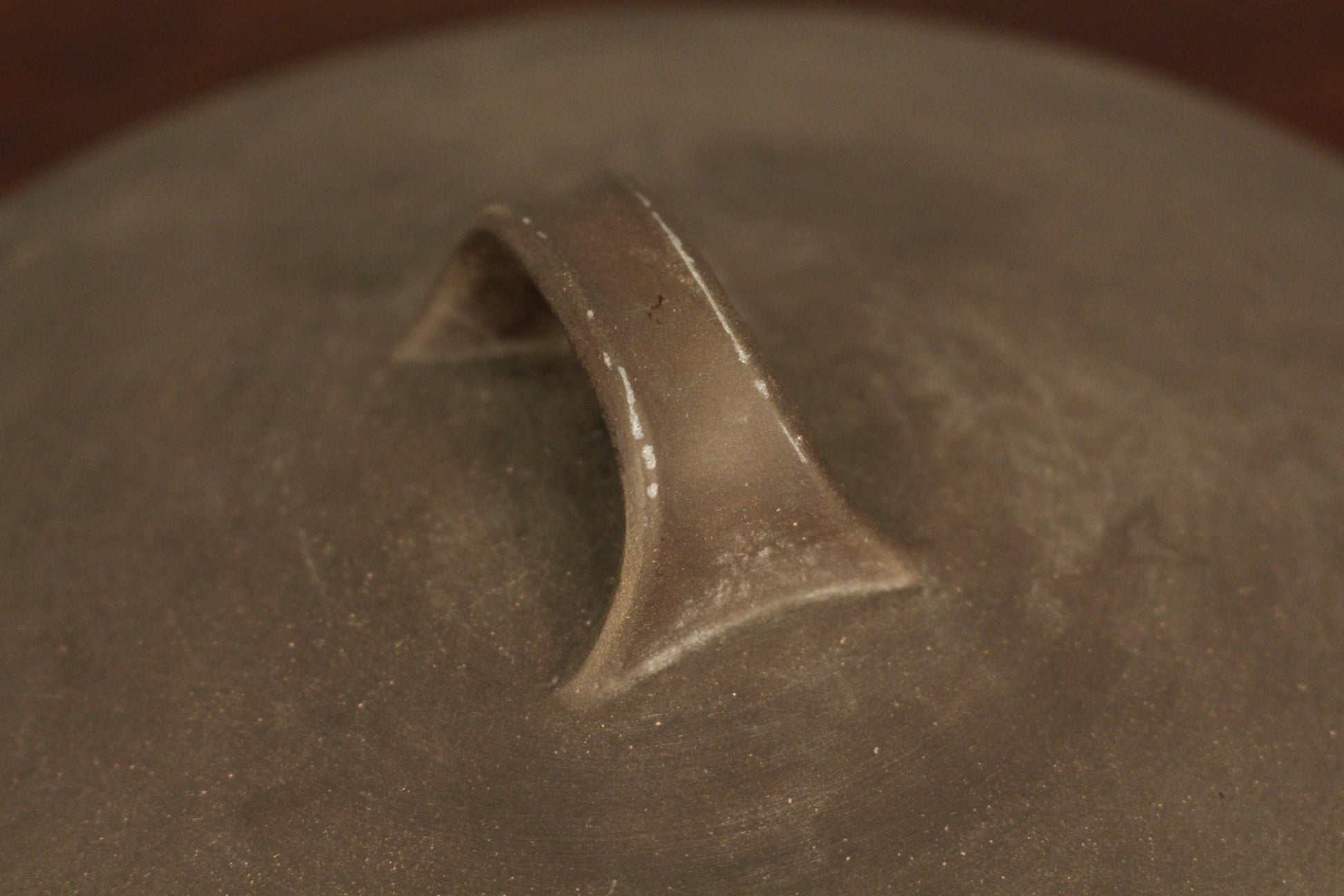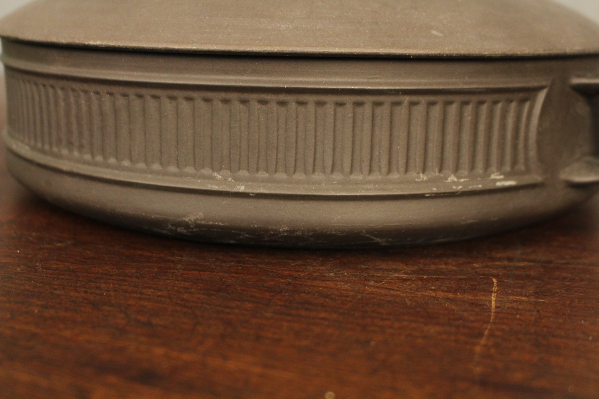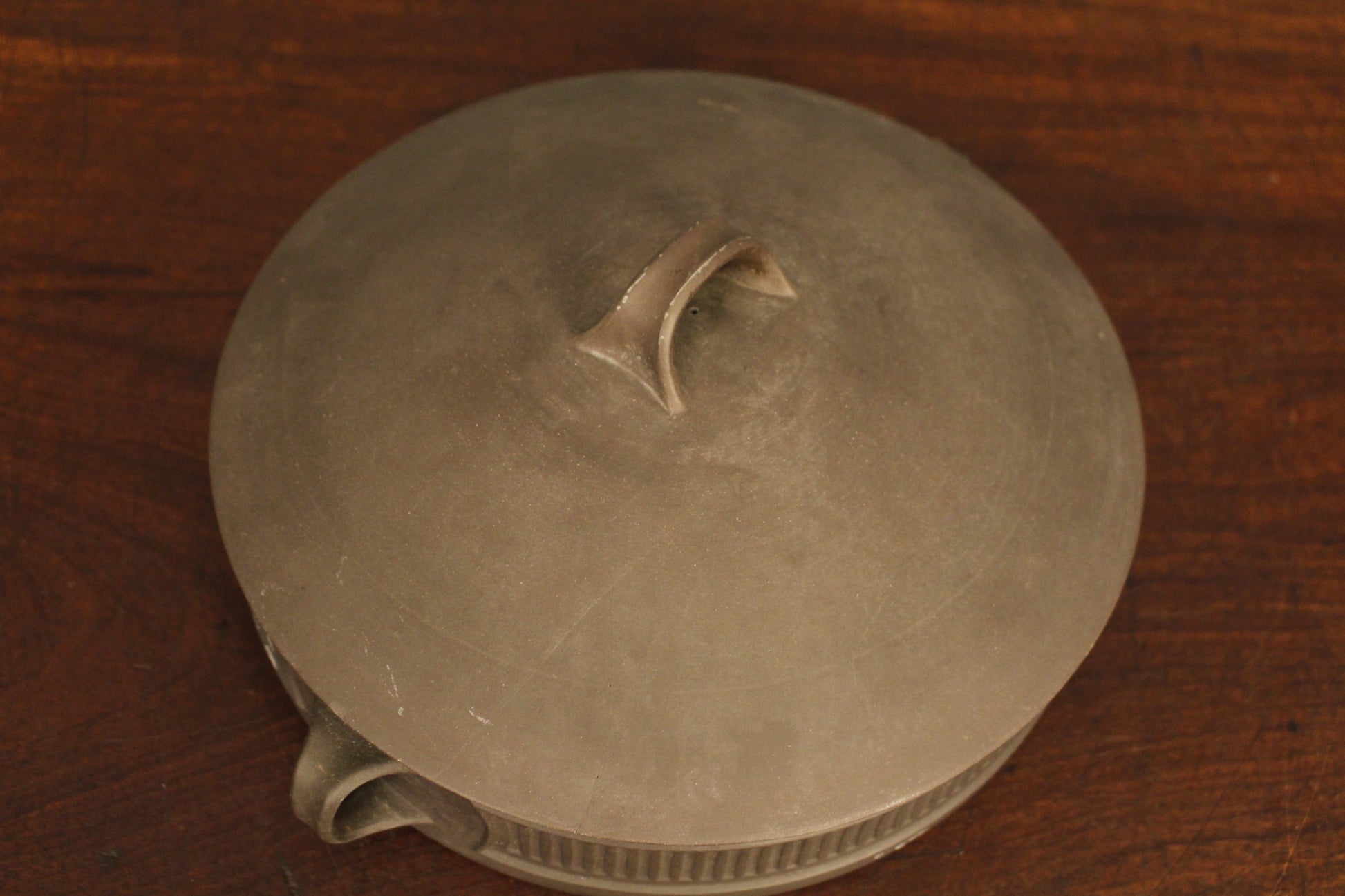 Sophisticated shallow lidded dish designed by Jens Quistgaard for Dansk. Features fluted accents to the side with a matte brown finish to the exterior and glossy white glaze inside. In good condition with some notable surface wear and marks to exterior.