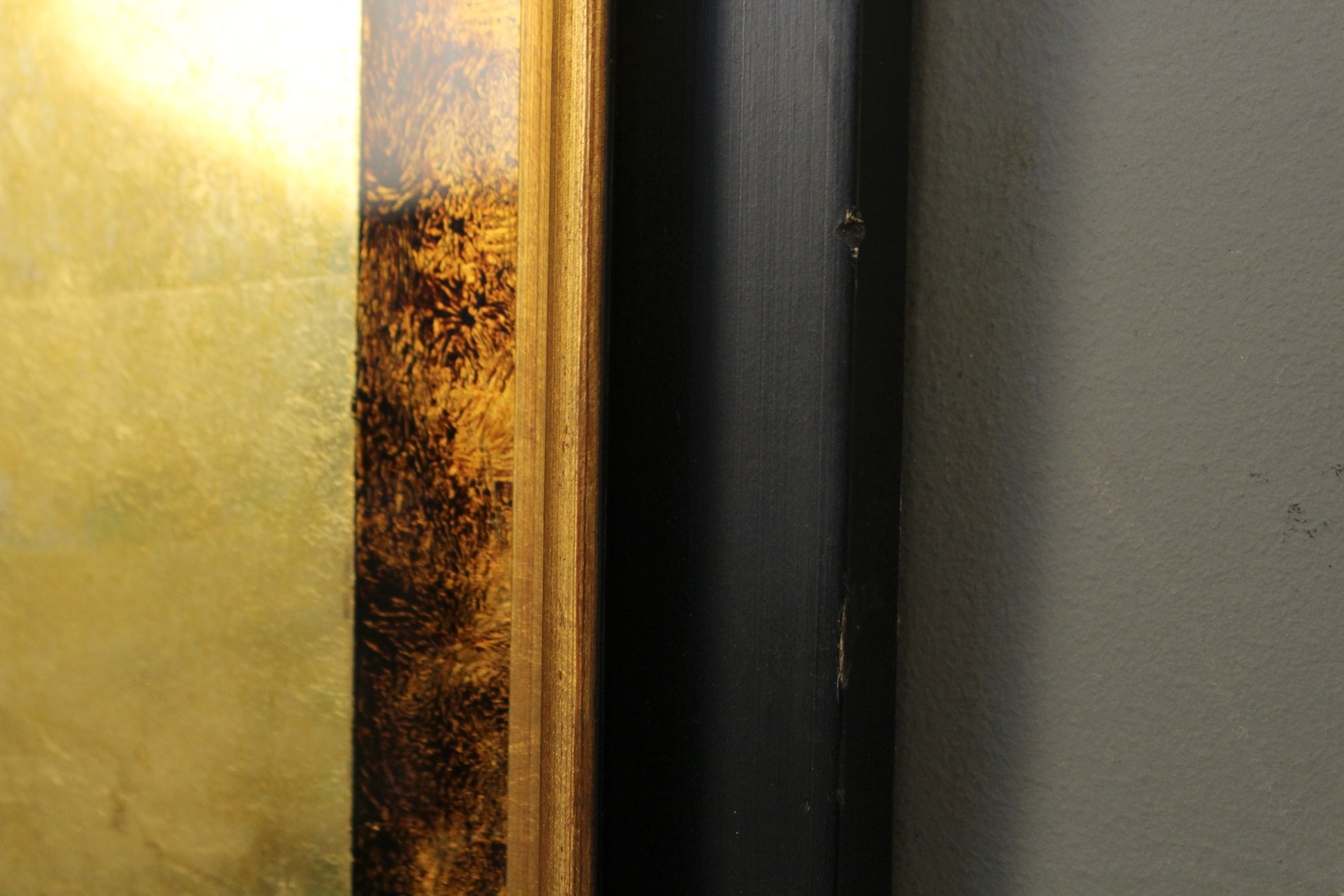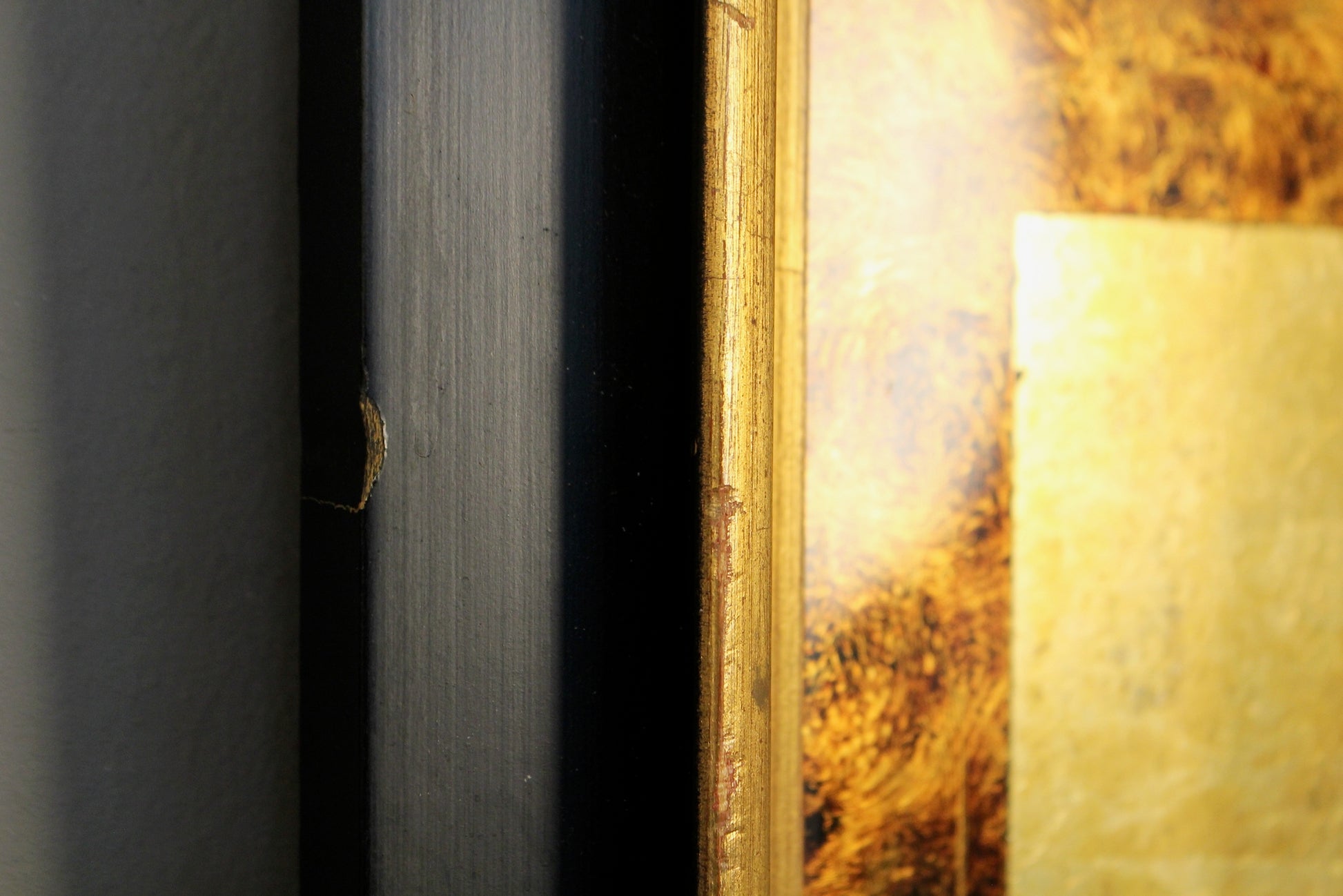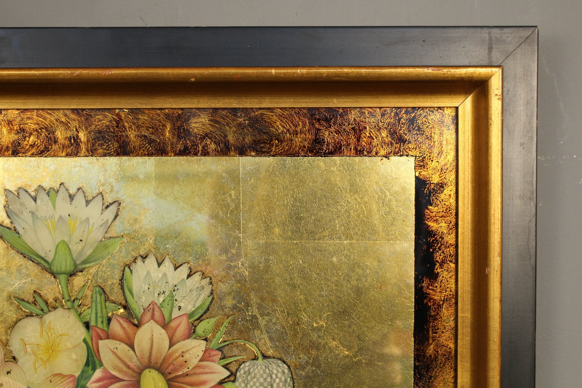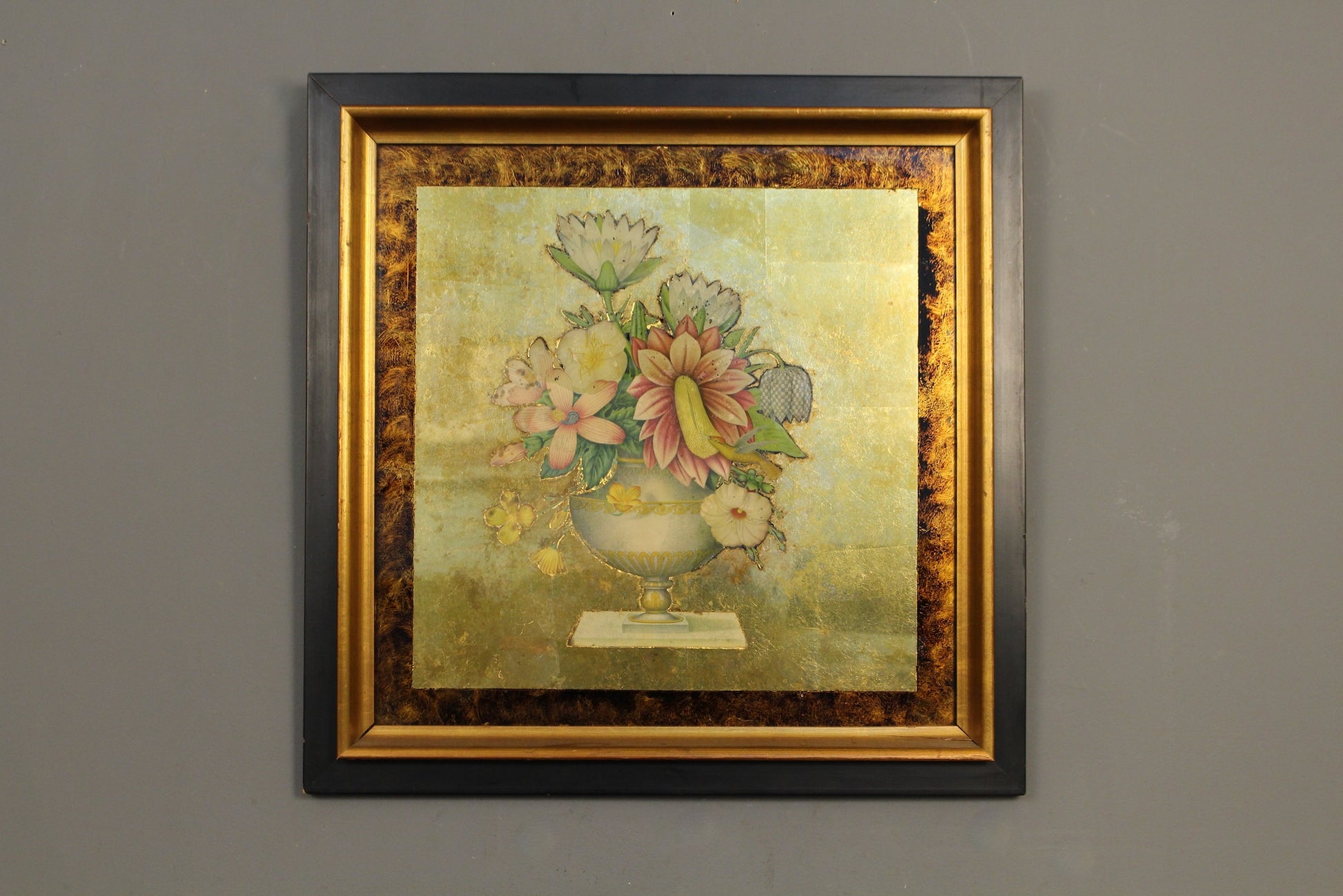 Classy lacquer and gold leaf floral bouquet art. In a black and gold painted frame. Some light edgewear, in otherwise good second-hand condition.
