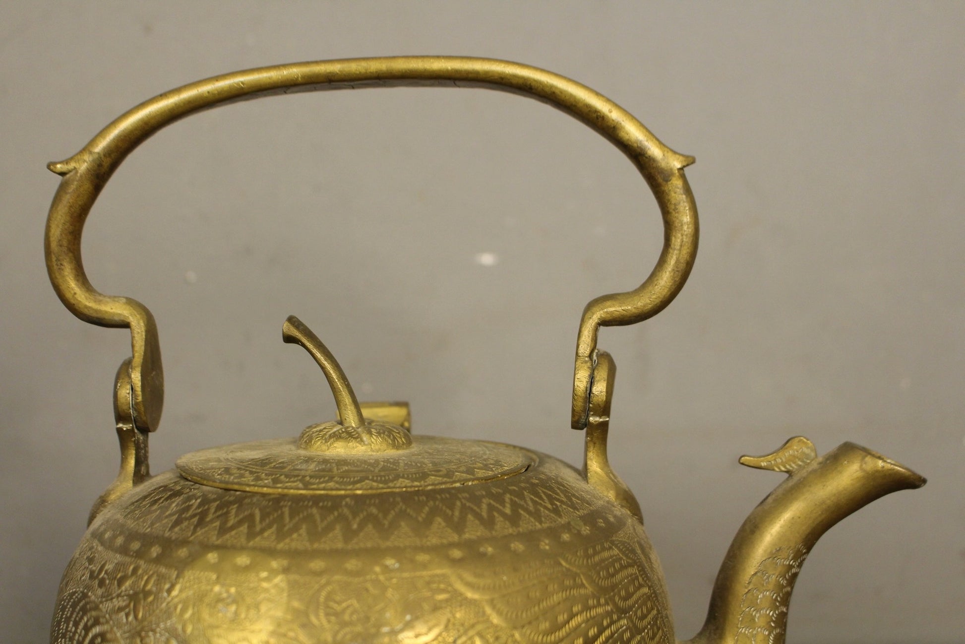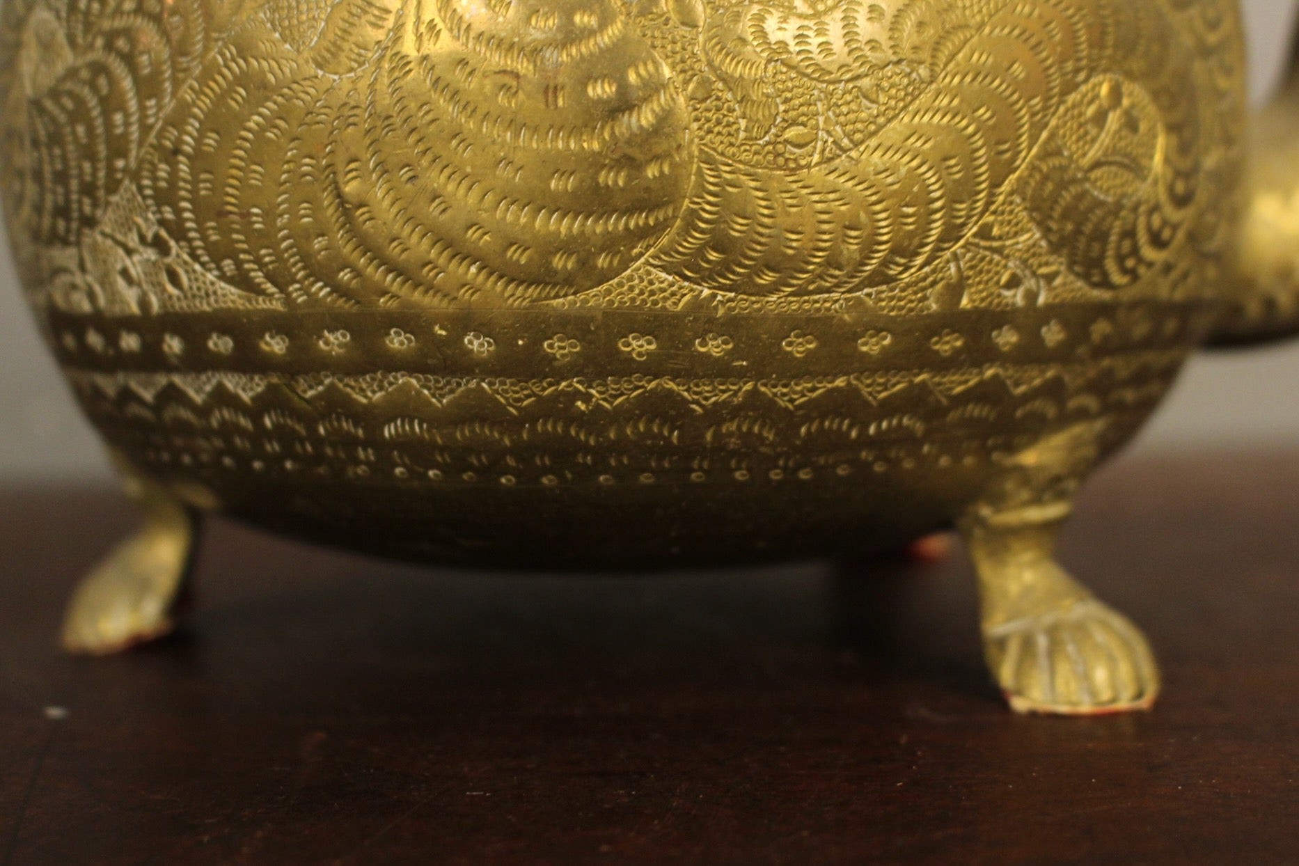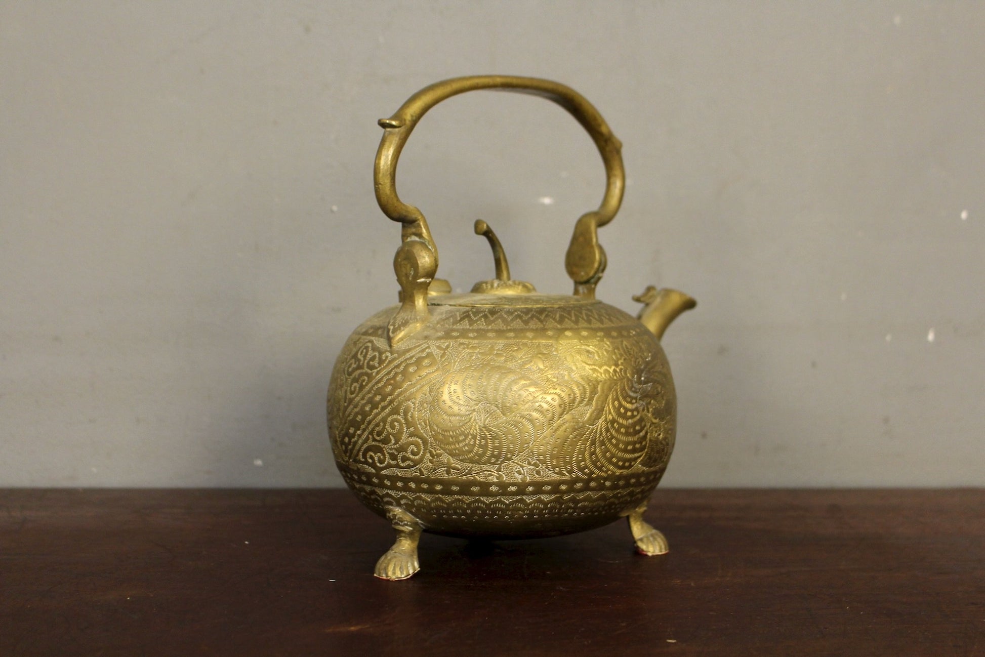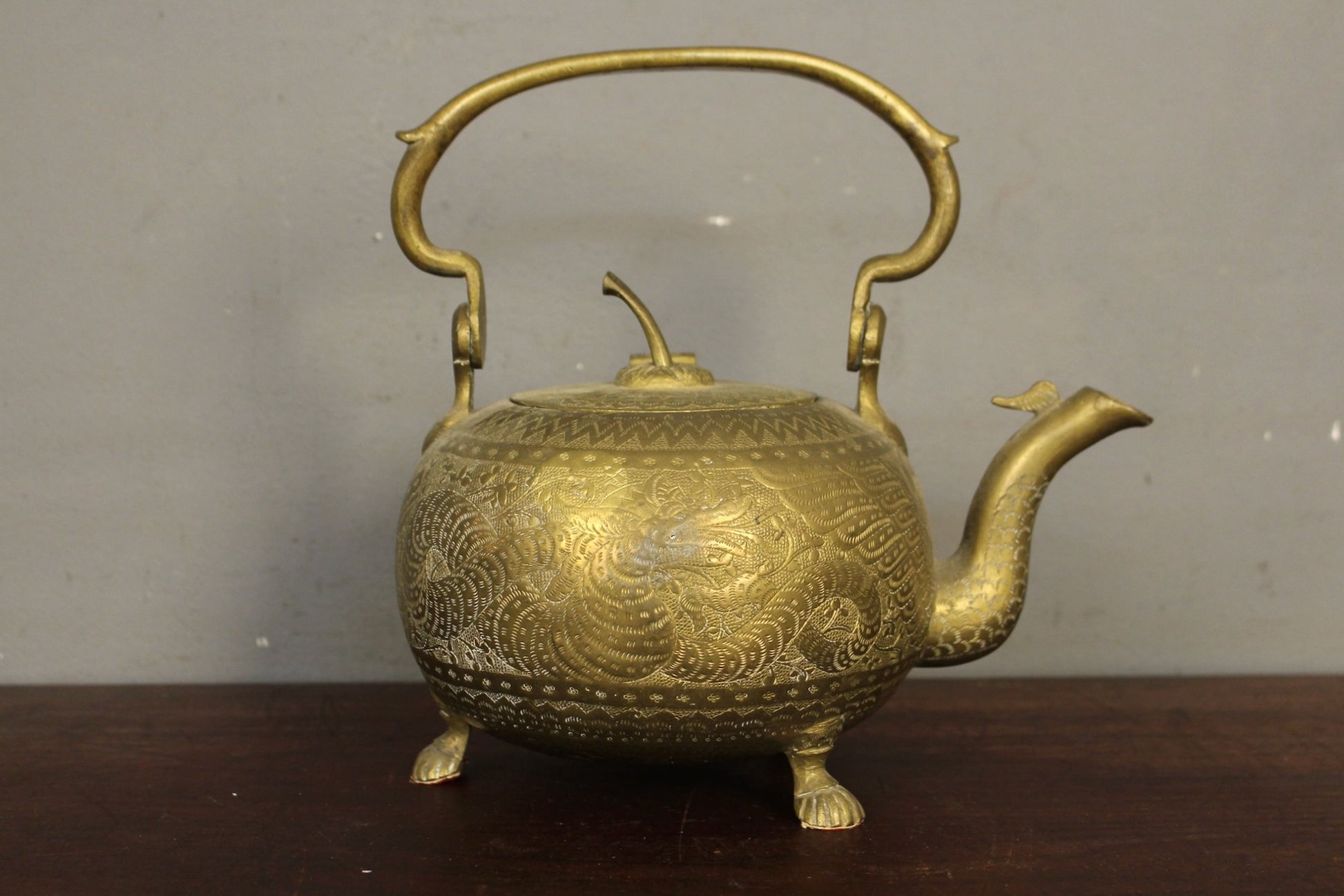 Darling decorative brass teapot with lots of intricate etchings. In good condition, light wear.