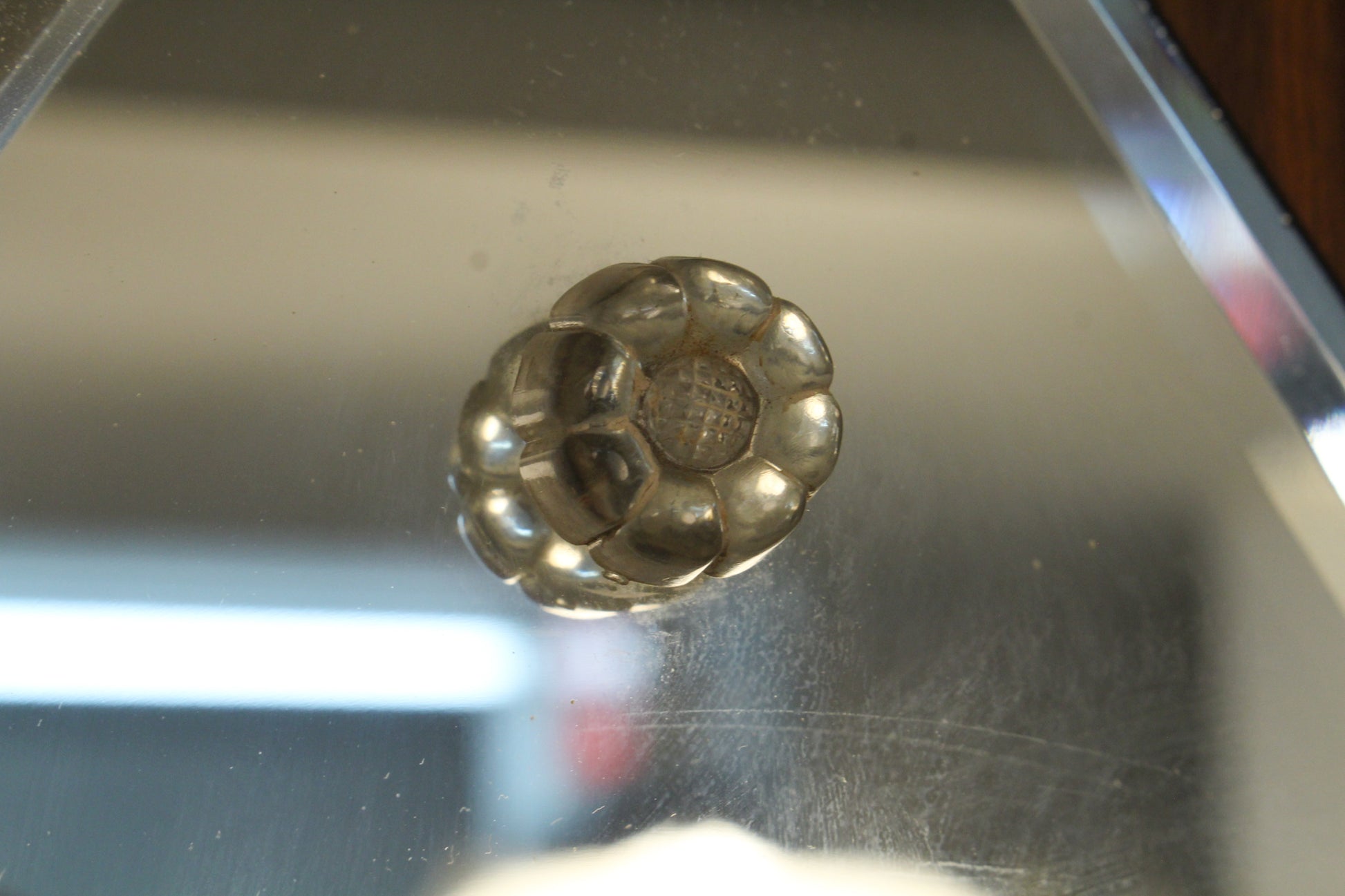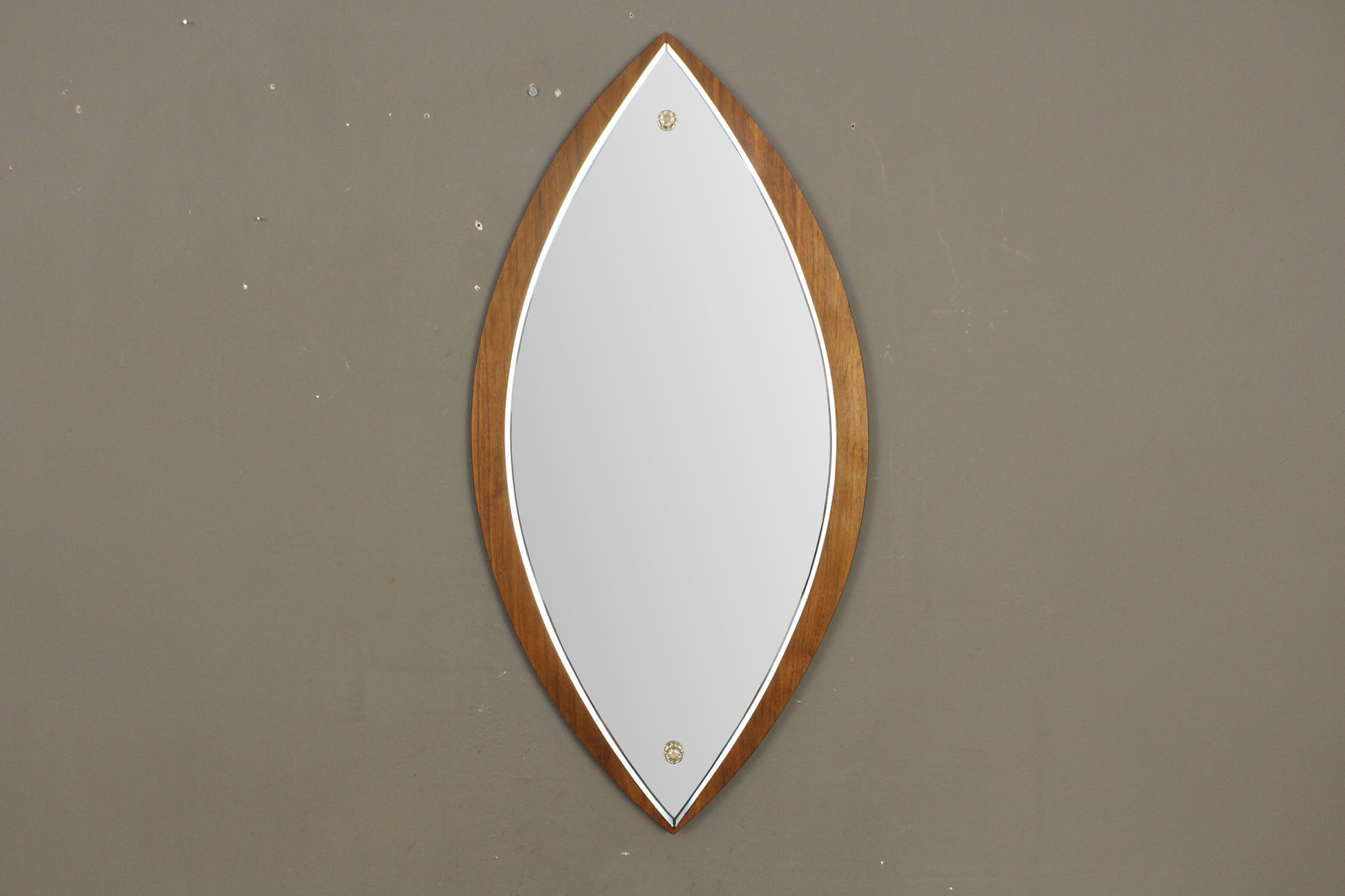 Stunning mid century mirror with a chic cat eye shape and slim, beveled edge. Mirror is secured to walnut backing with darling clear plastic flower accents. Made by Penthouse Art Creations. In good condition, a few small scratches.