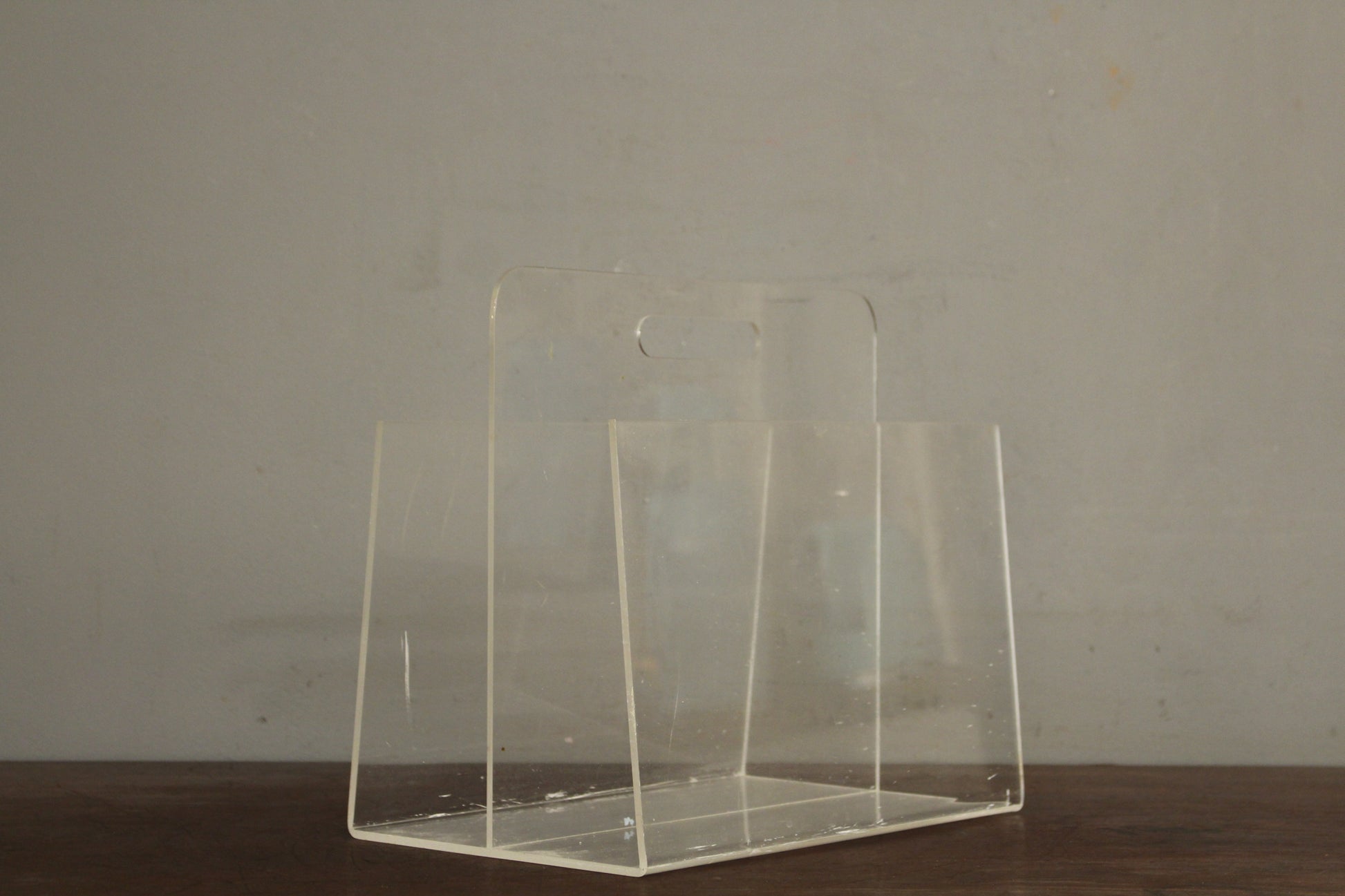 Simple acrylic magazine rack with handle. Perfect for storing your bathroom literature! Some notable scratching and scuffing to acrylic throughout.