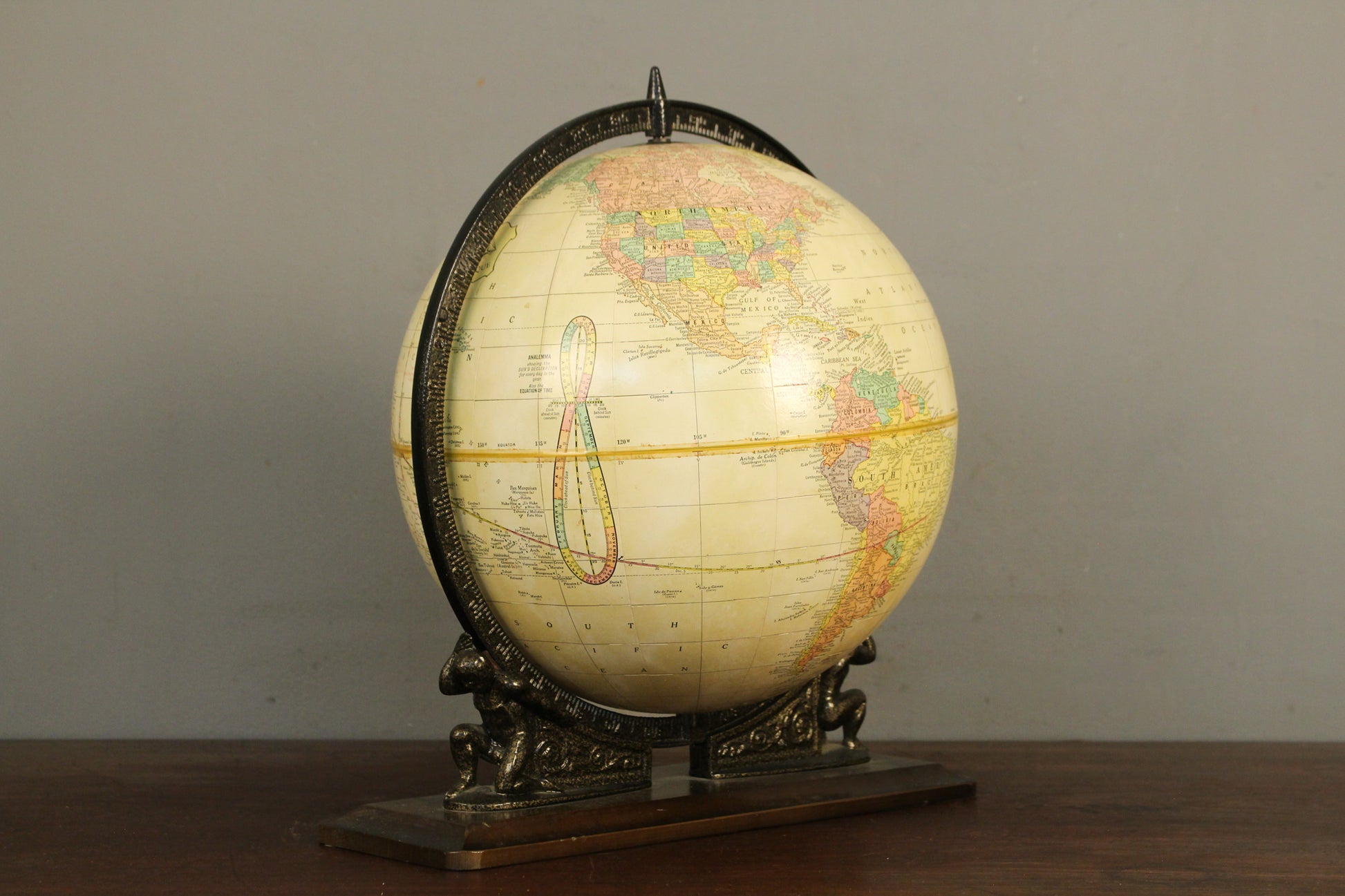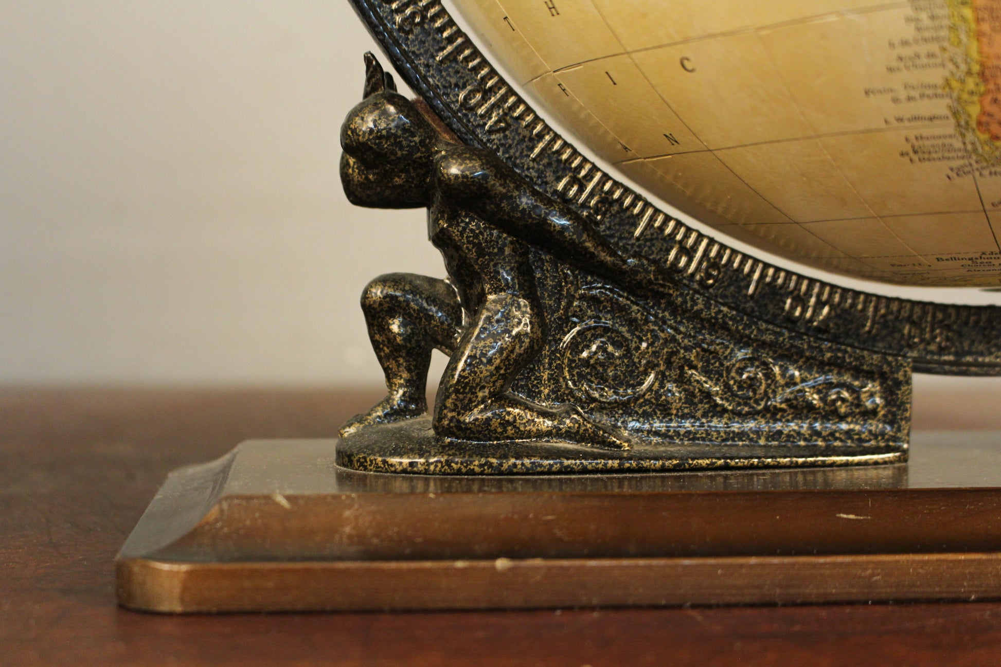 Studious tabletop globe fit for a sophisticated space! Dates to the 1980s. Dark wooden base with a metal sculptural stand that features figures holding up the globe brings a dramatic flair. Globe can be removed fom base easily. In good condition, light surface wear.