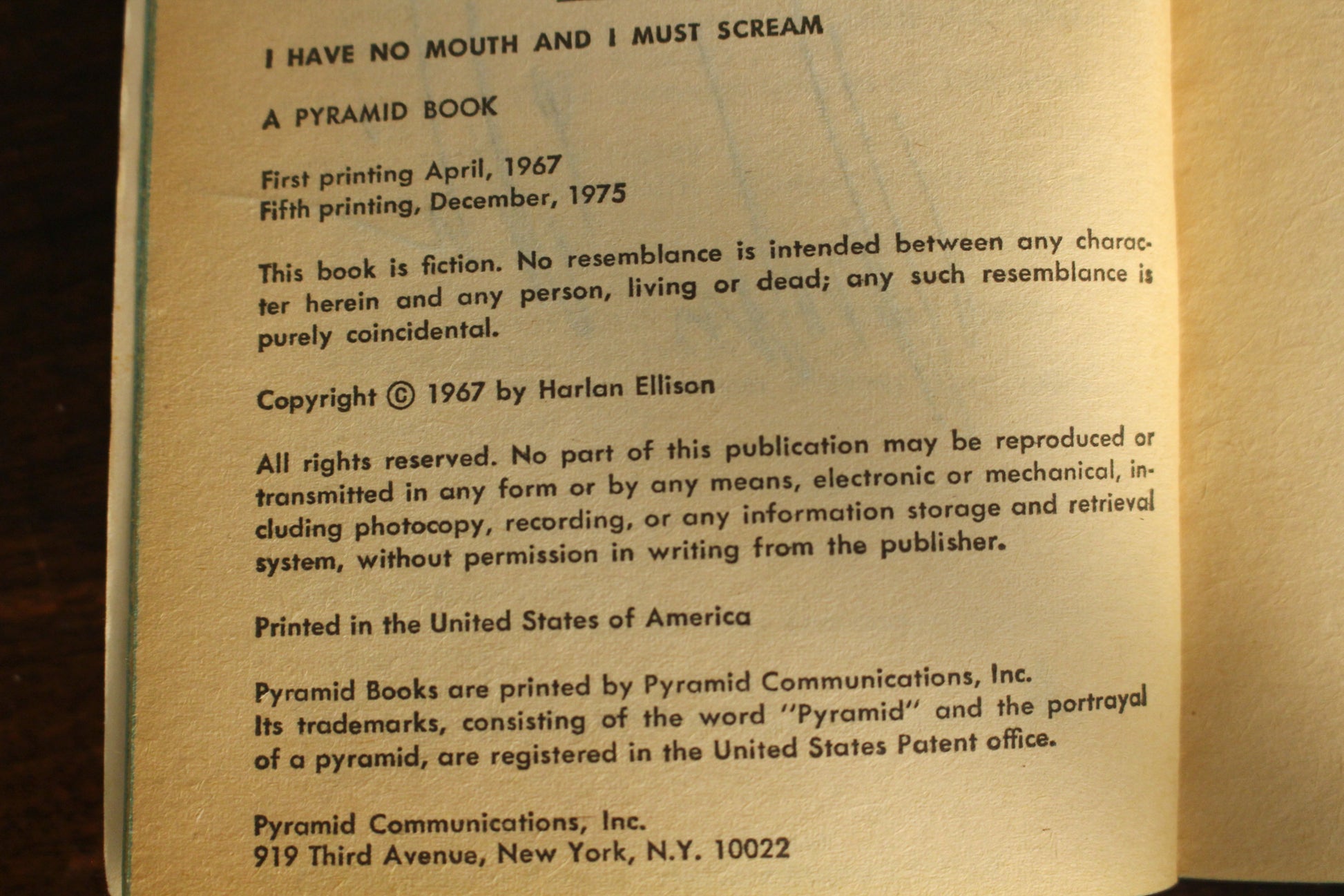 Rare paperback copy of Harlan Ellison's iconic short story collection - signed by the author himself! Fifth printing, from 1975. Softcover, 175 pages. Some standard wear to exterior from a paperback that's been read, but still in structurally good condition.