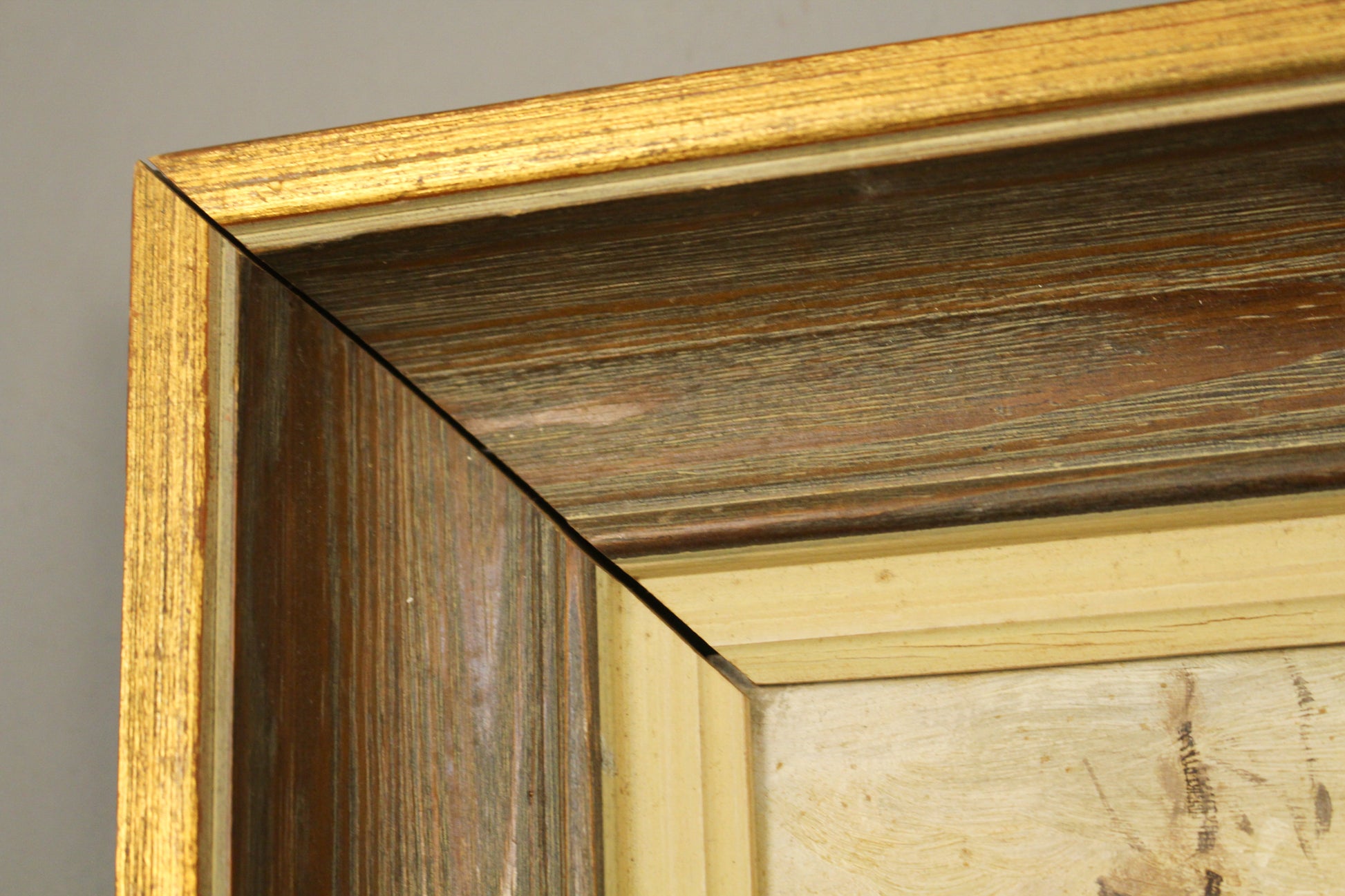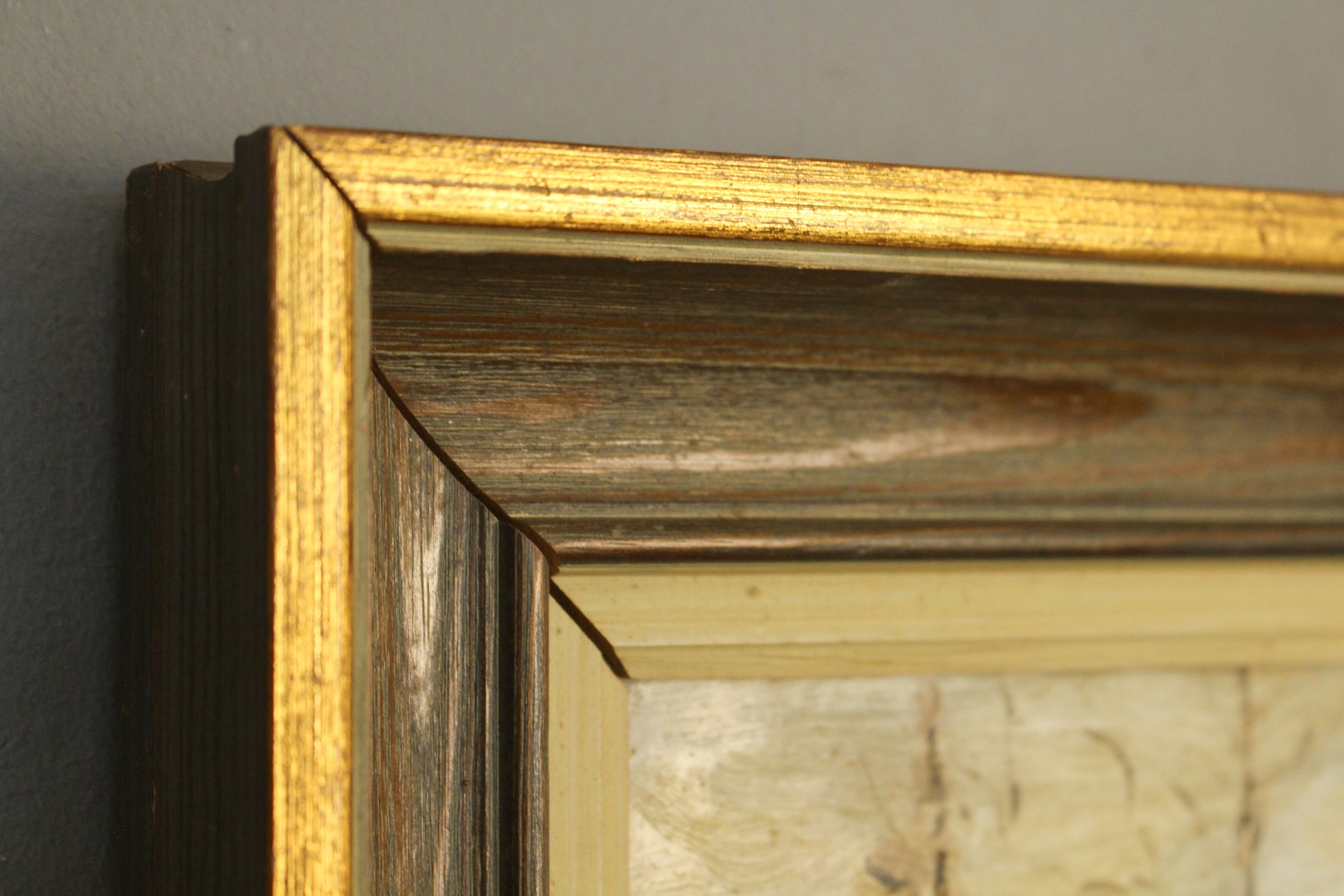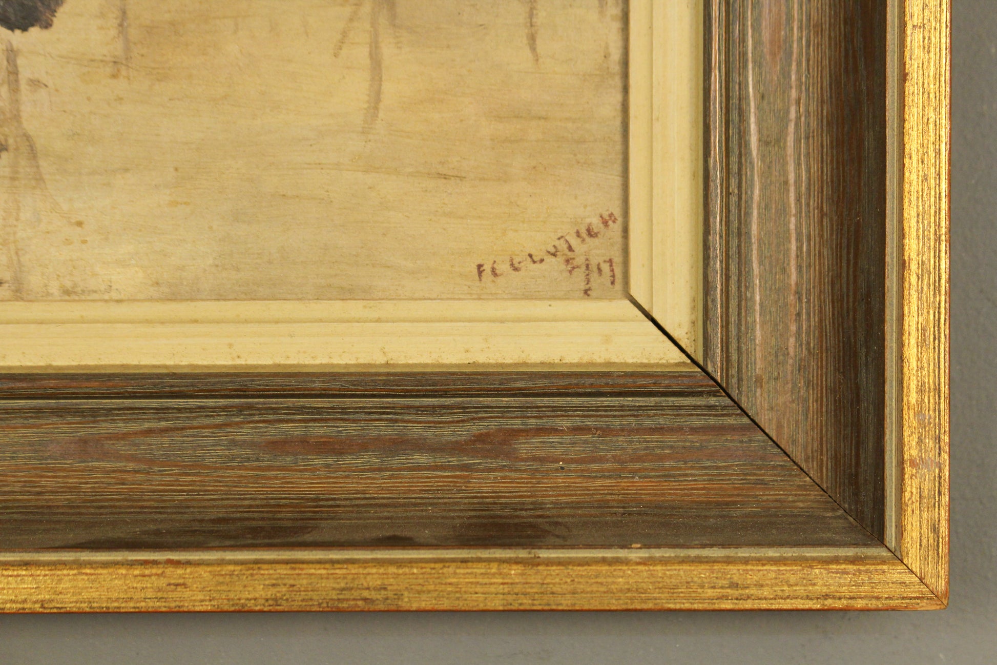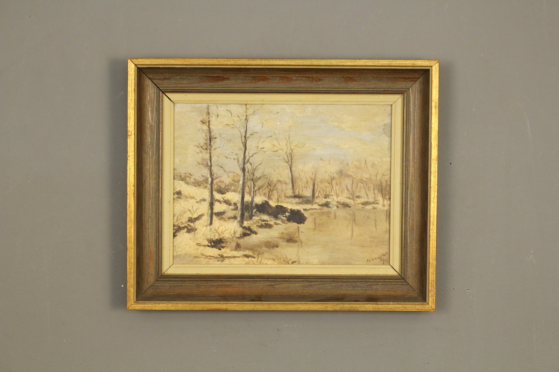 Quaint painting of a forest scene. Signed by the artist. In a wooden frame with a brushed gold detailed finish. In generally good second-hand condition, frame is splitting slightly in one of the corners.