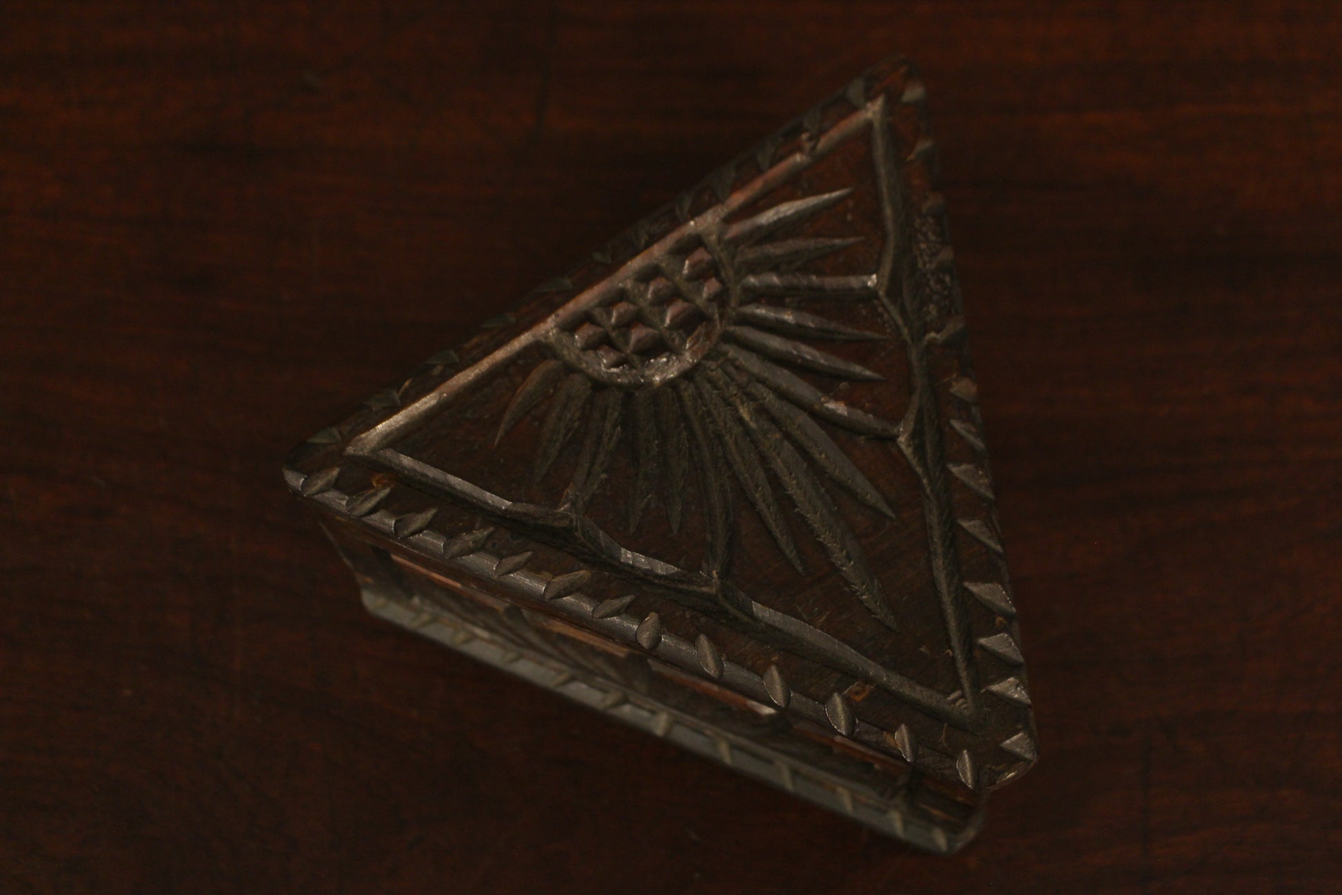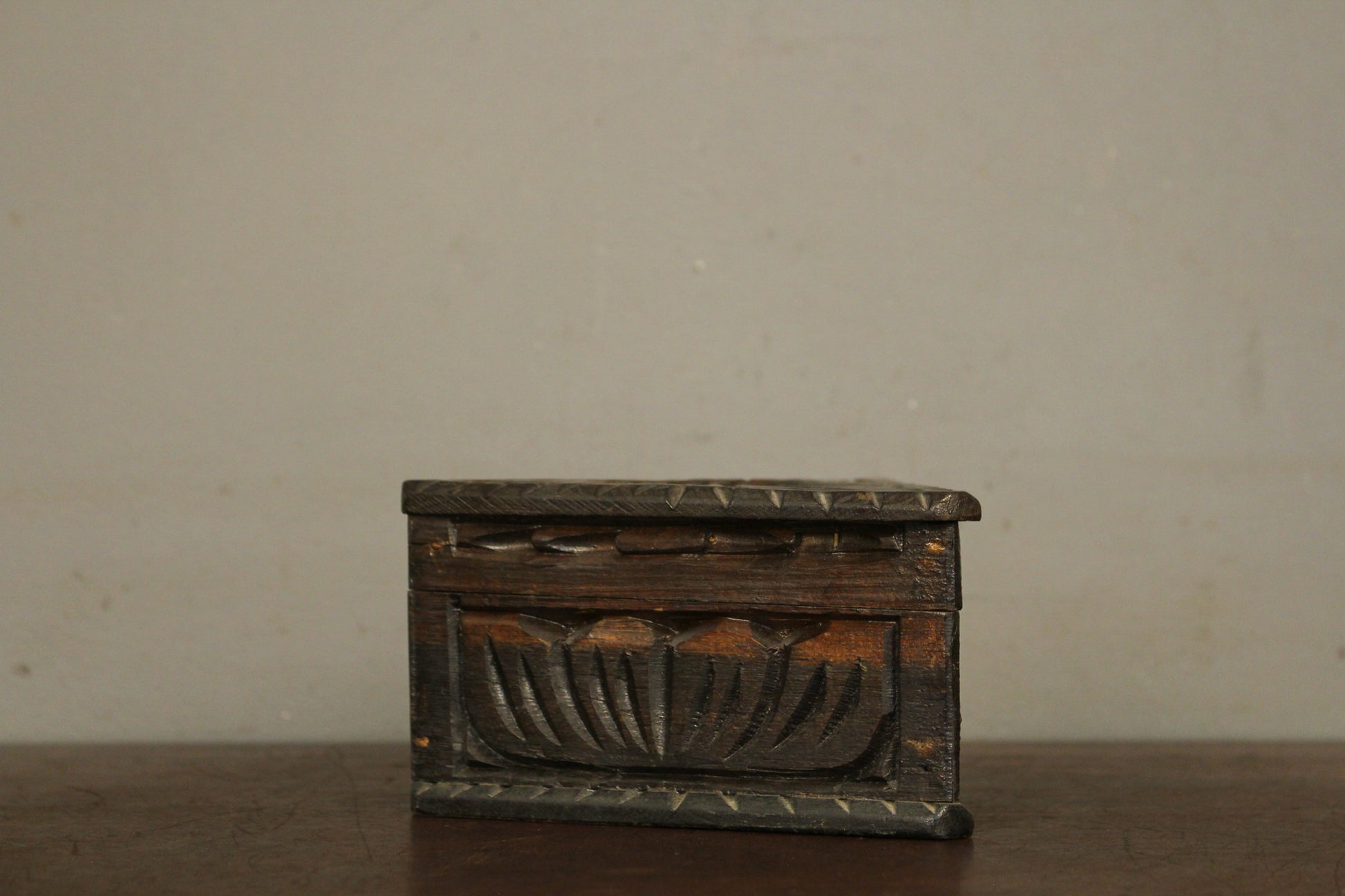 Great little carved wooden box. Red felted interior. Some wear to the food stain and other surface wear throughout.