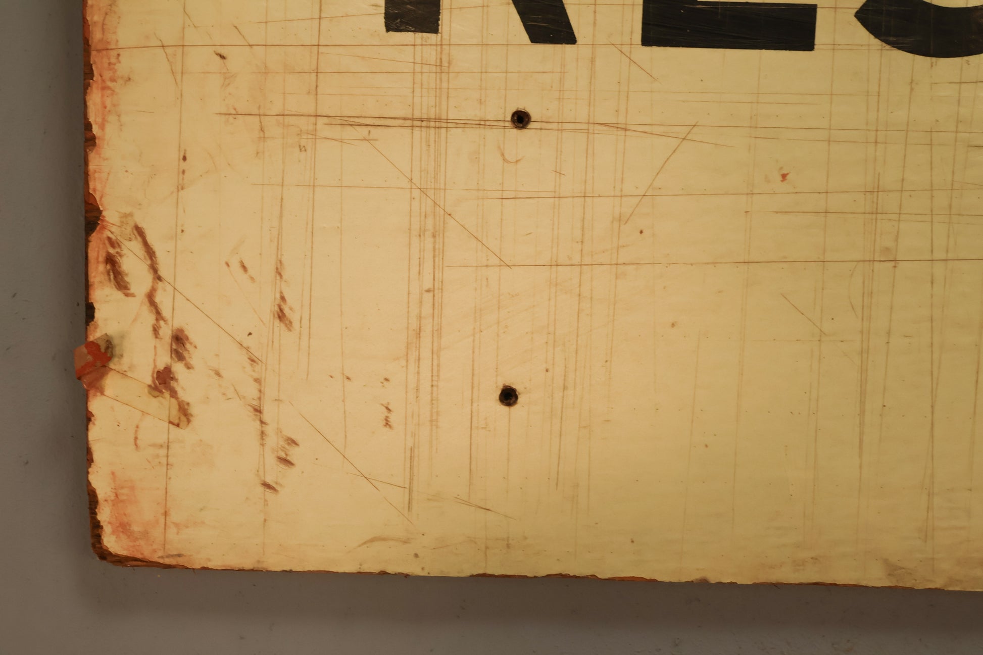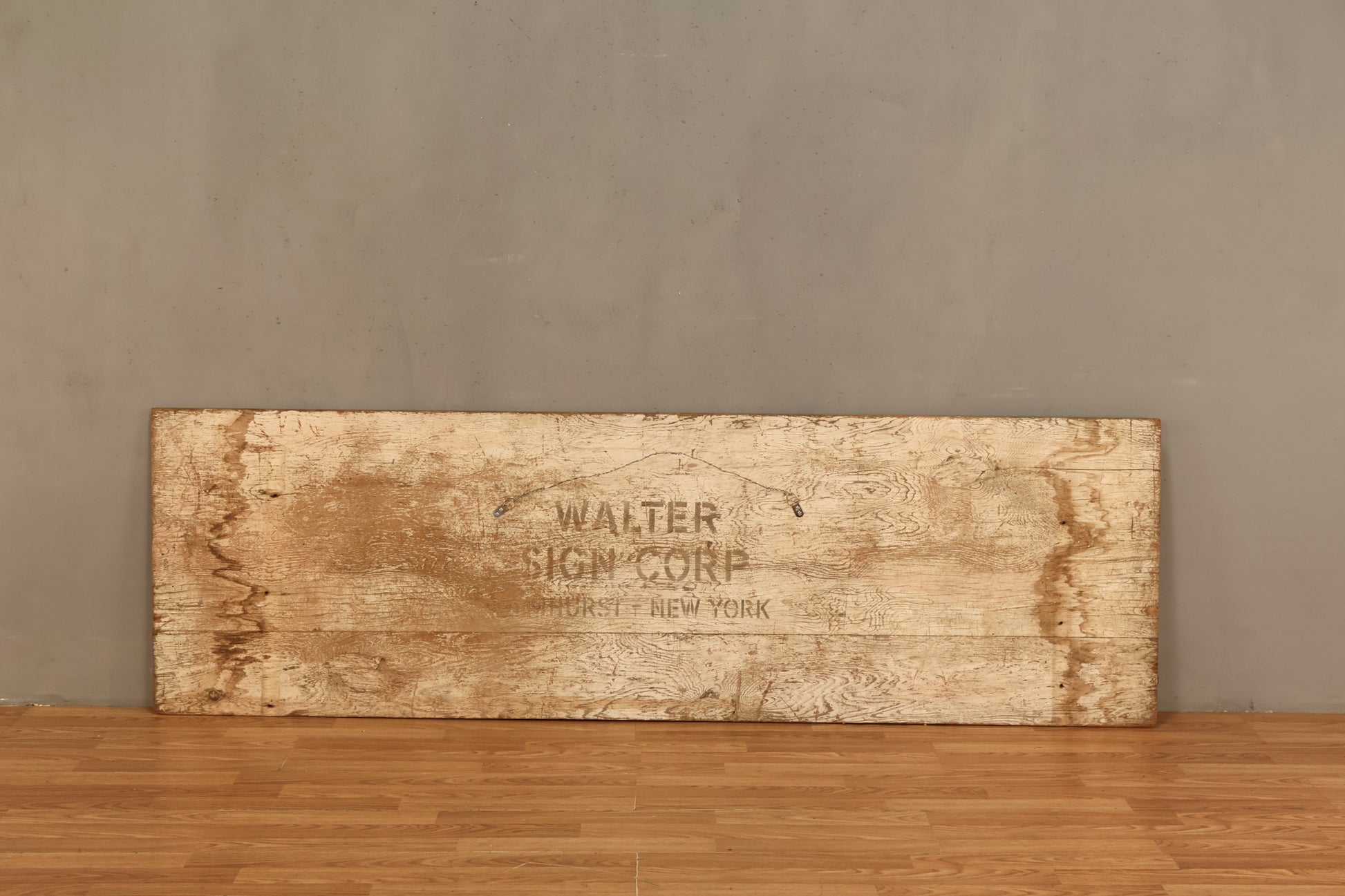 Very large and very cool hand-painted wooden sign. Thank you! In good condition, light wear. Disclaimer: This piece is not available to view in-store. It is for sale online only, and by appointment at our NJ warehouse. Once purchased, it will be transported to our Manhattan store for pick-up or delivery. All sales are FINAL. Please call if you have any questions regarding the piece prior to purchase or to place a 15% deposit to see the piece in-person in our store.