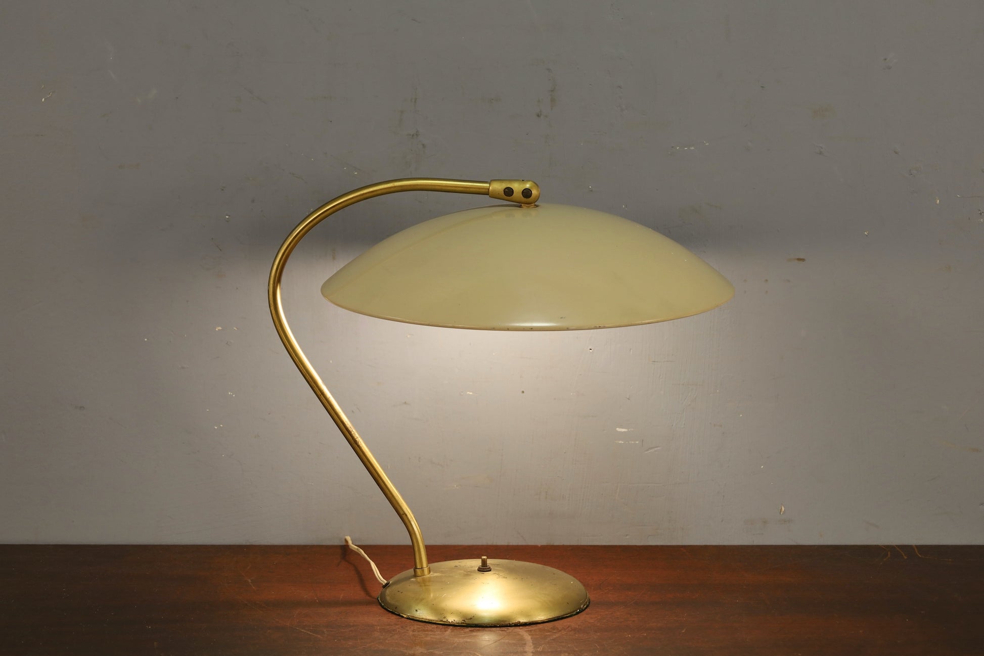 Stylish cream and brass table lamp. Manufactured in the 1950s. Features mid century elegance with a saucer lampshade. Simple brass base with an arched neck. Some signs of light rusting to the brass surface. Other minor surface wear to the shade.