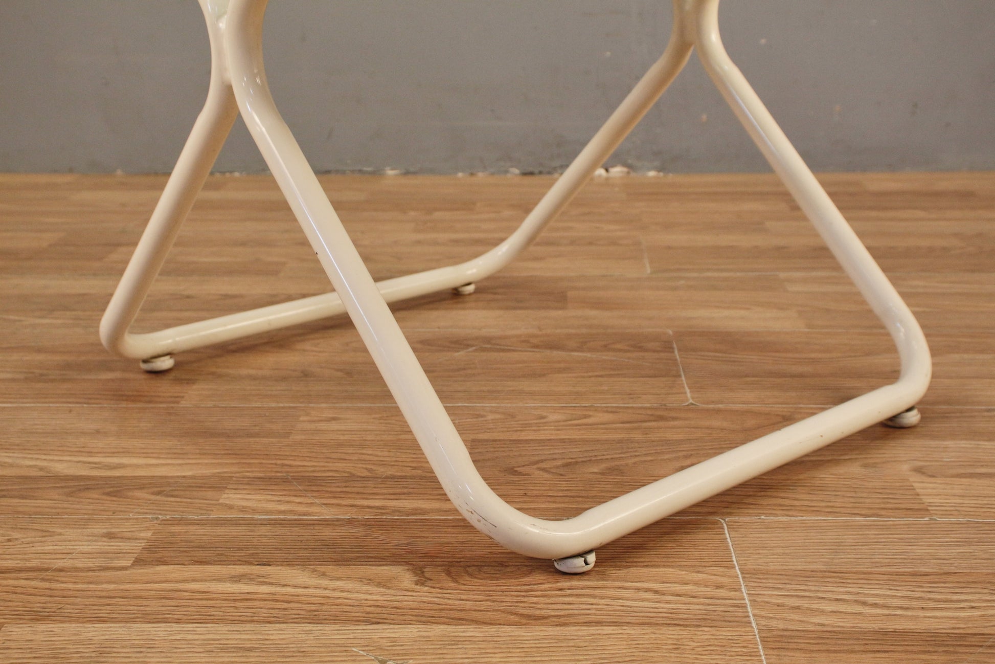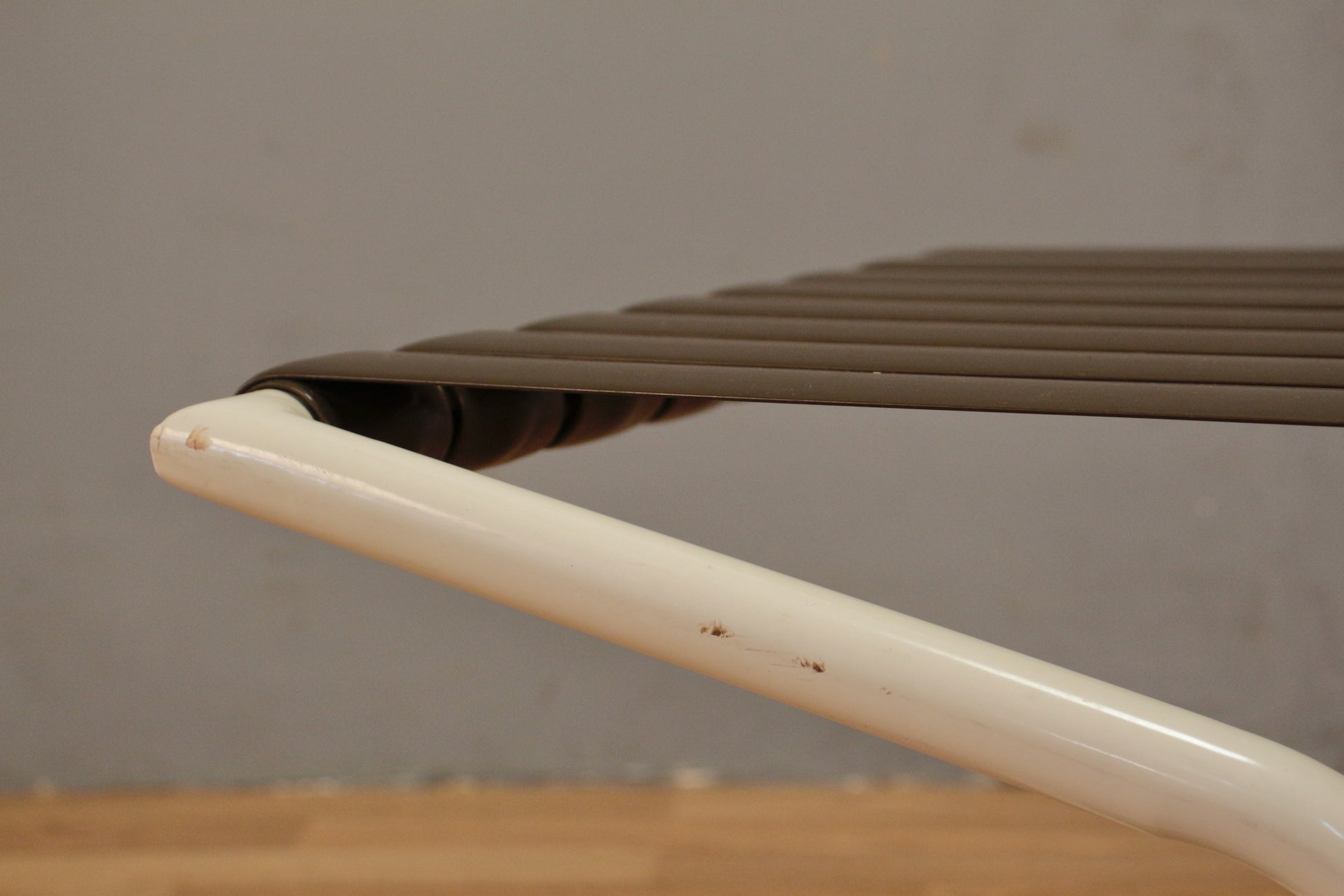 Outdoor seating doesn't get any better than this! Part of the "Kailua" line designed by Hall Bradley for Brown Jordan in the 1970s. Sculpted cream aluminum frame and brown vinyl straps. Great for using as an ottoman or stool. Some scuffs to the frame and fadespots on the vinyl straps, in otherwise great second-hand condition.