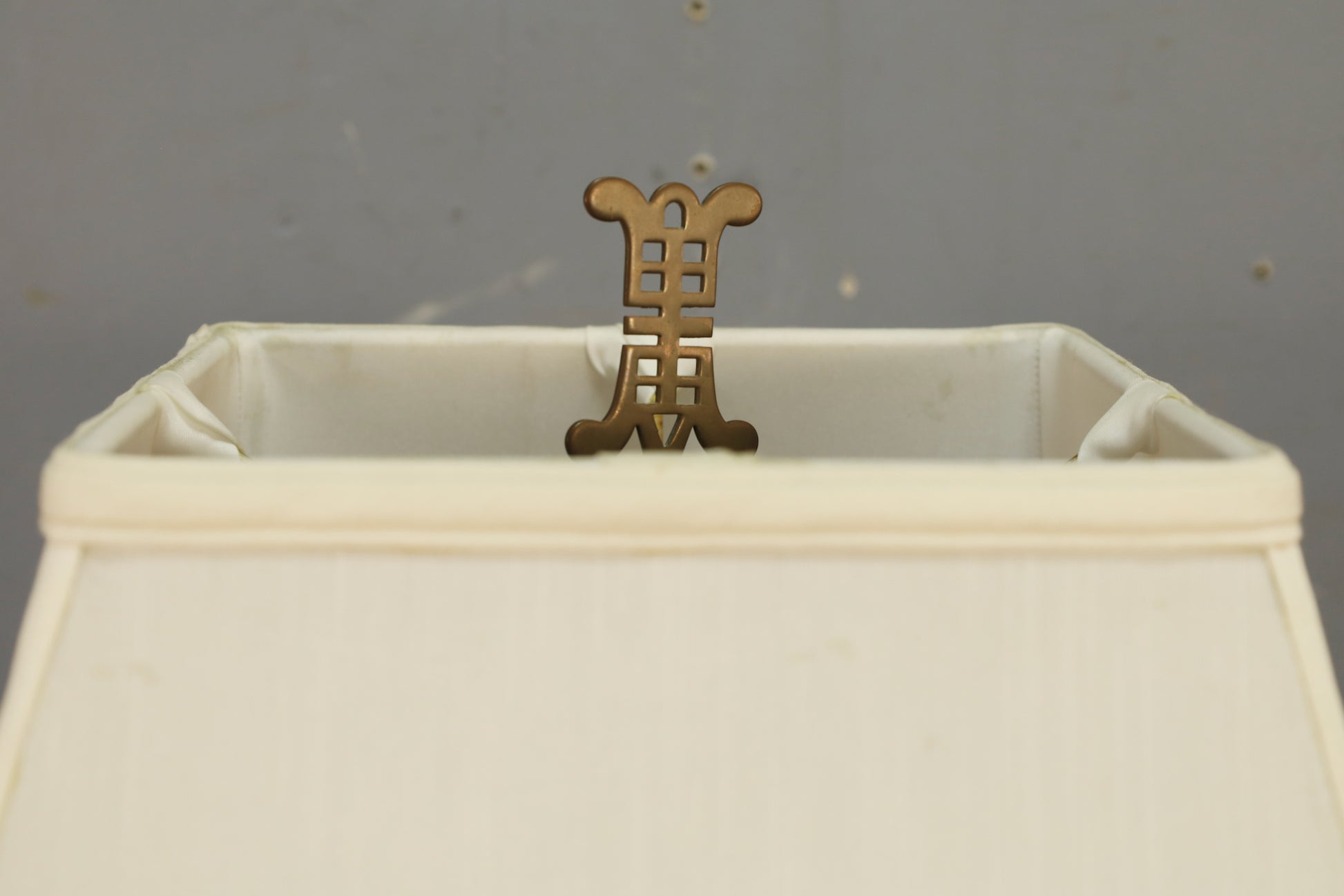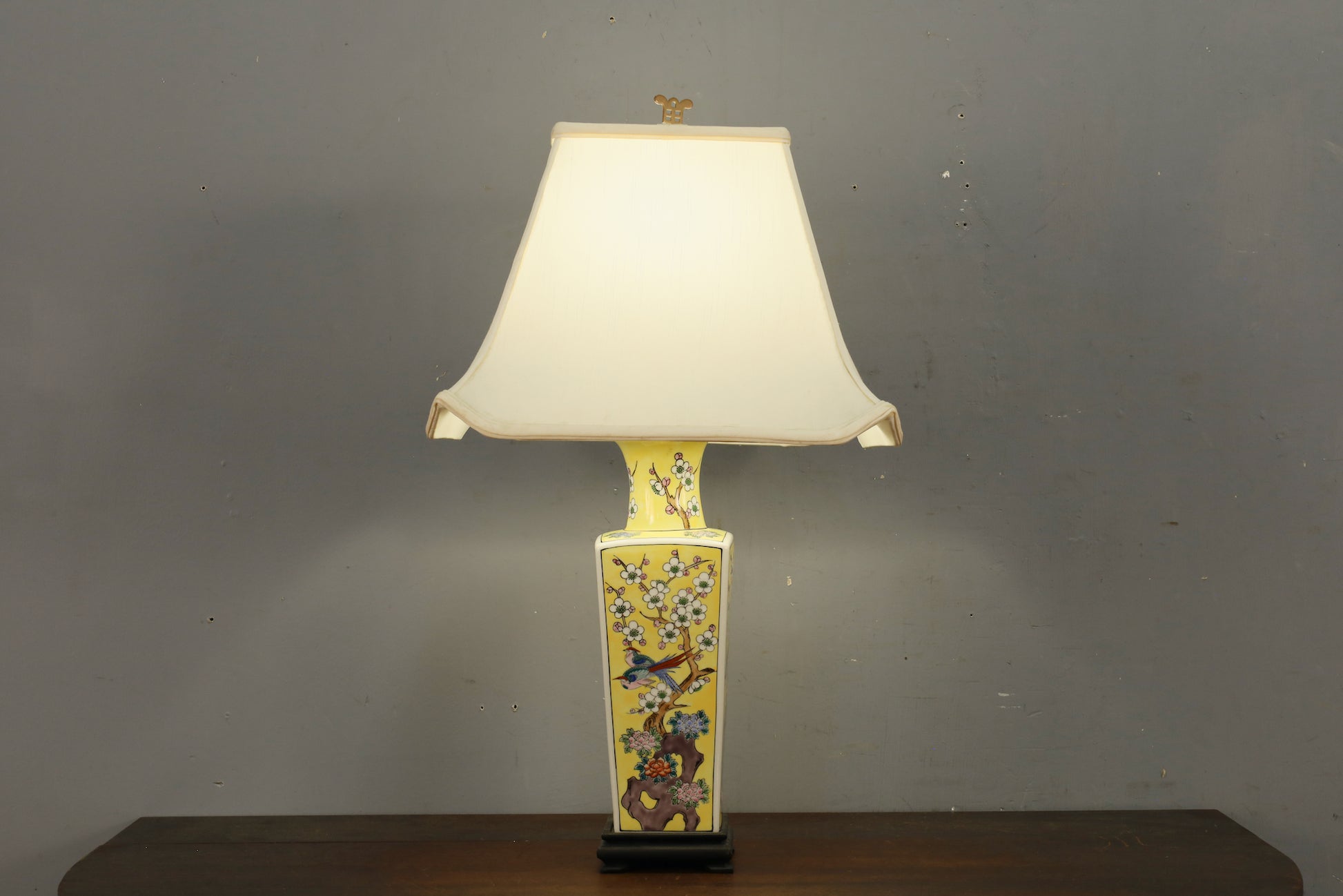 Darling Chinoiserie yellow ceramic table lamp with beautiful floral and bird design. Pagoda style lampshade. One of the lamps has a chip on the side of base, which does not affect stability. One of the lamps has a slightly wonky shade. In otherwise good condition with some light wear throughout. SOLD SEPARATELY.