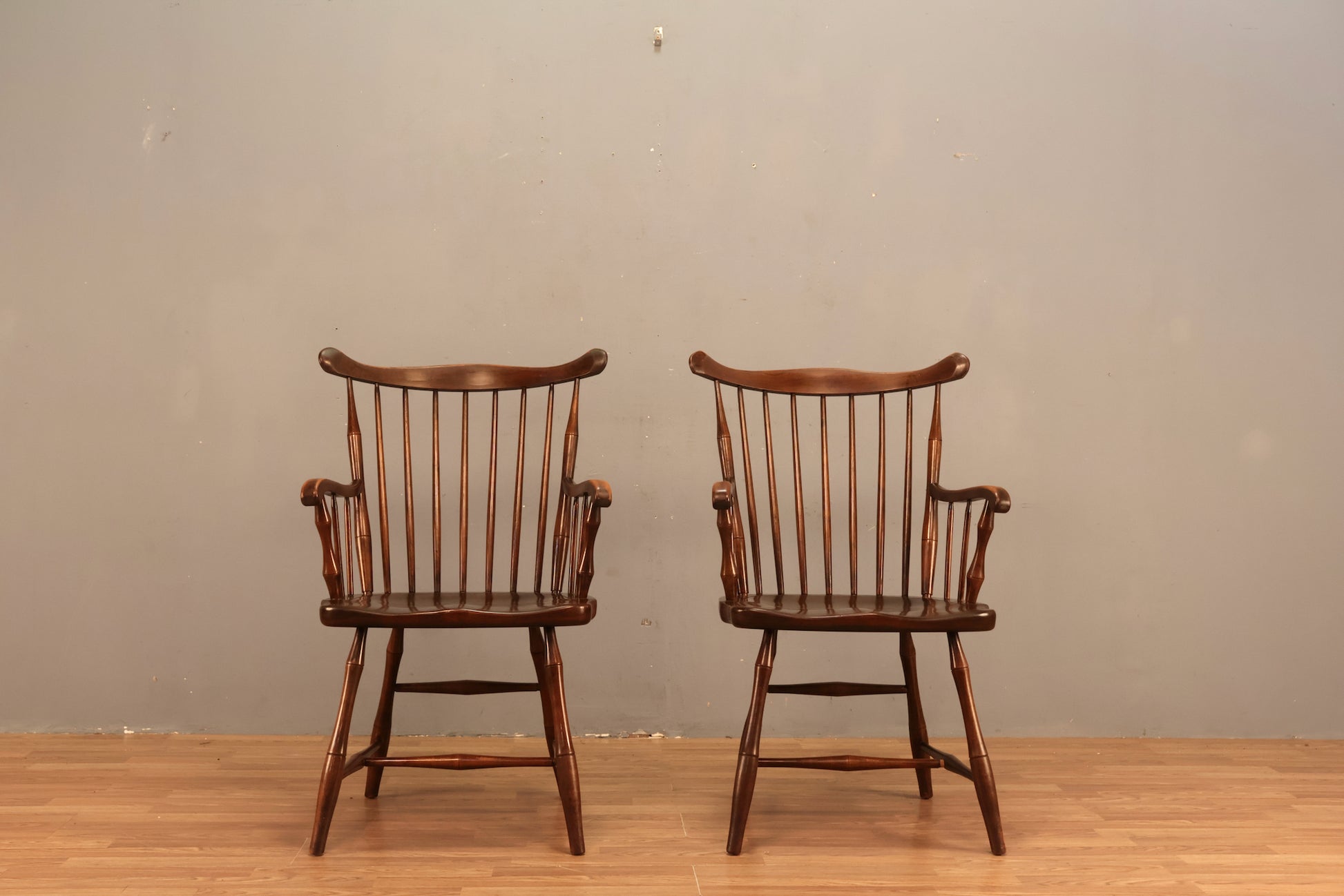 Delightful wooden windsor armchair with beautiful woodgrain and finish. Made by Harden. Sure to make a classy dining chair or seat for your reading corner! Armrest height measures 27" and seat height is 17.5". Dowel by legs out of place on one of the chairs. In good condition, stripping to finish on armrests, scuffing and light wear throughout. SOLD SEPARATELY.