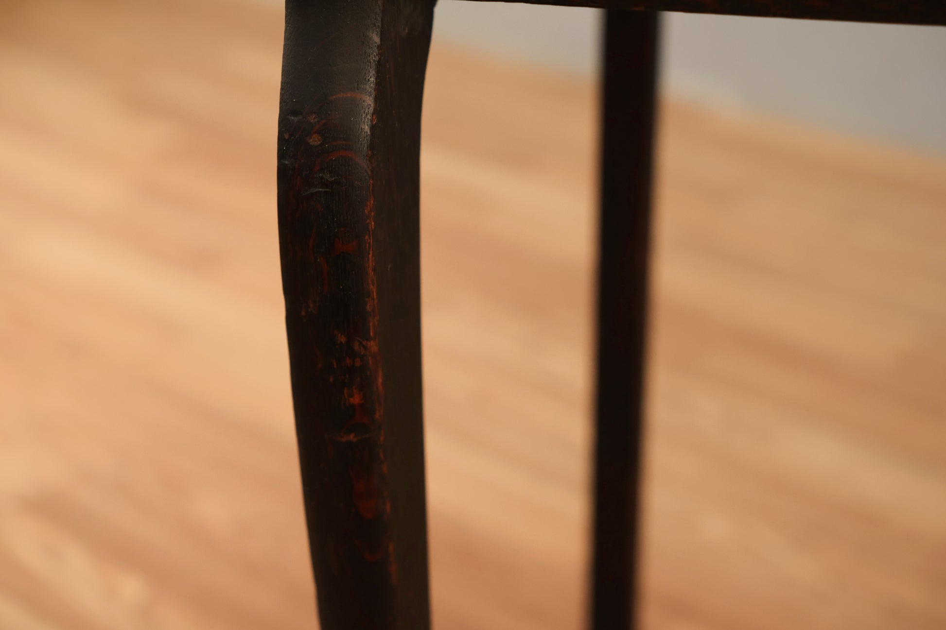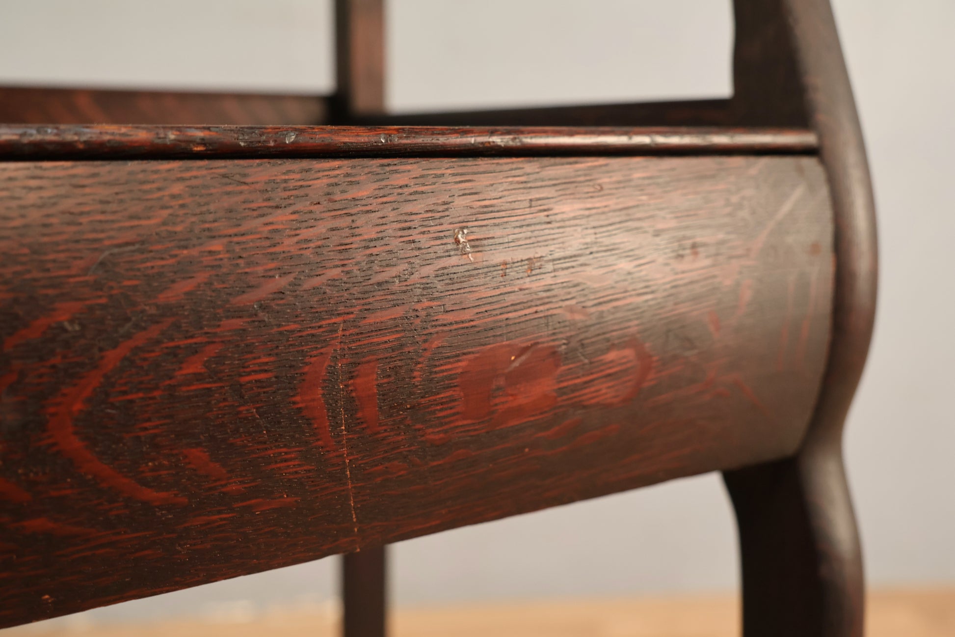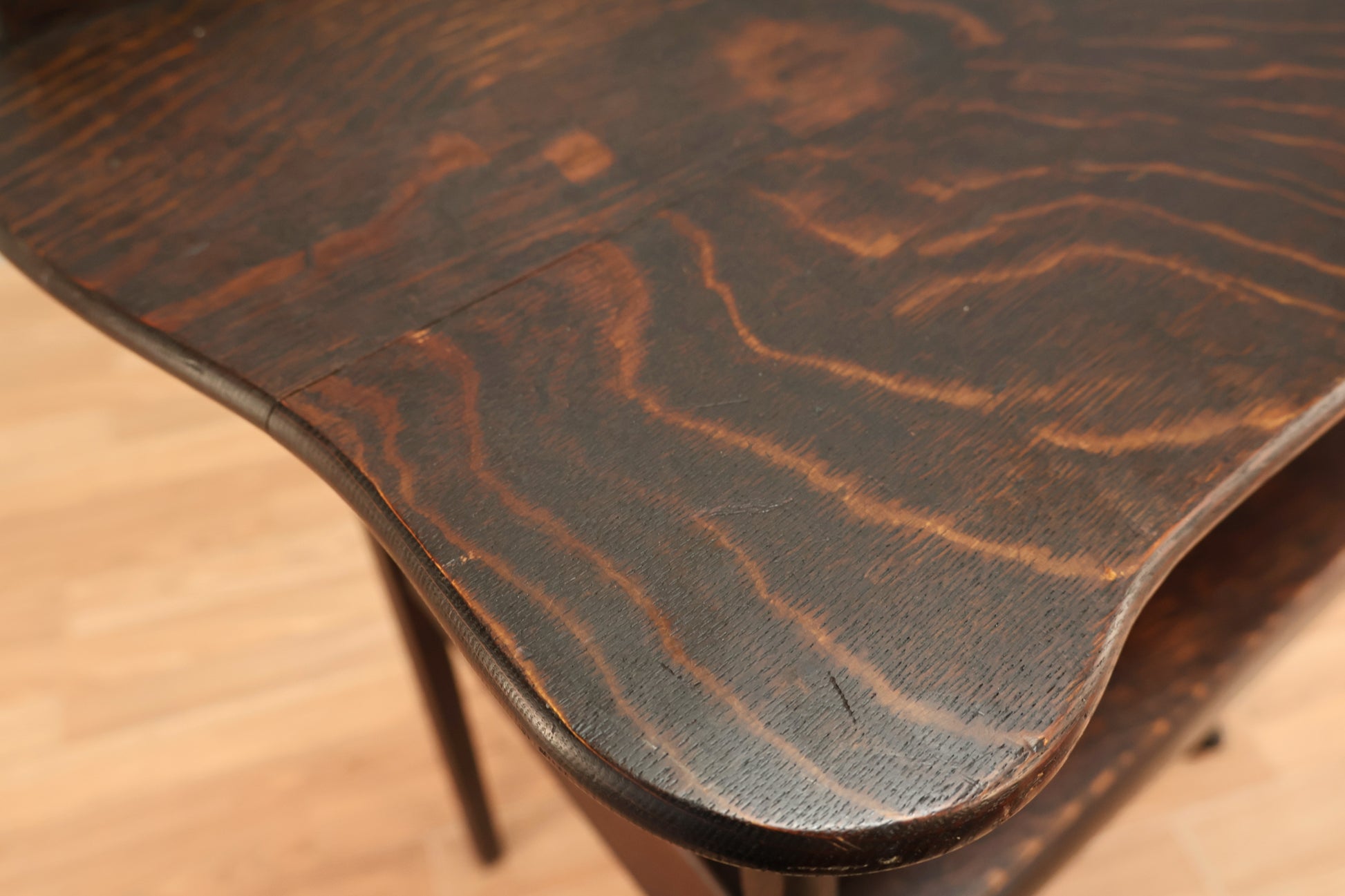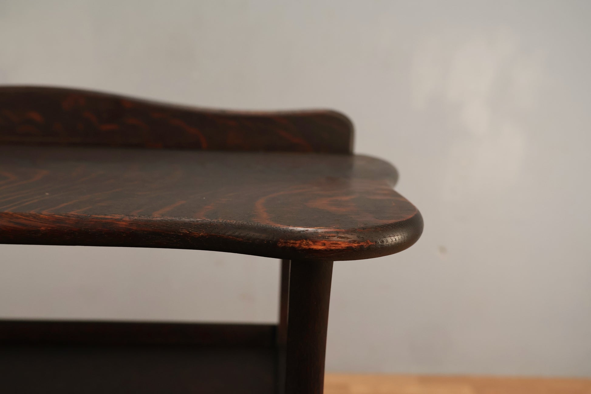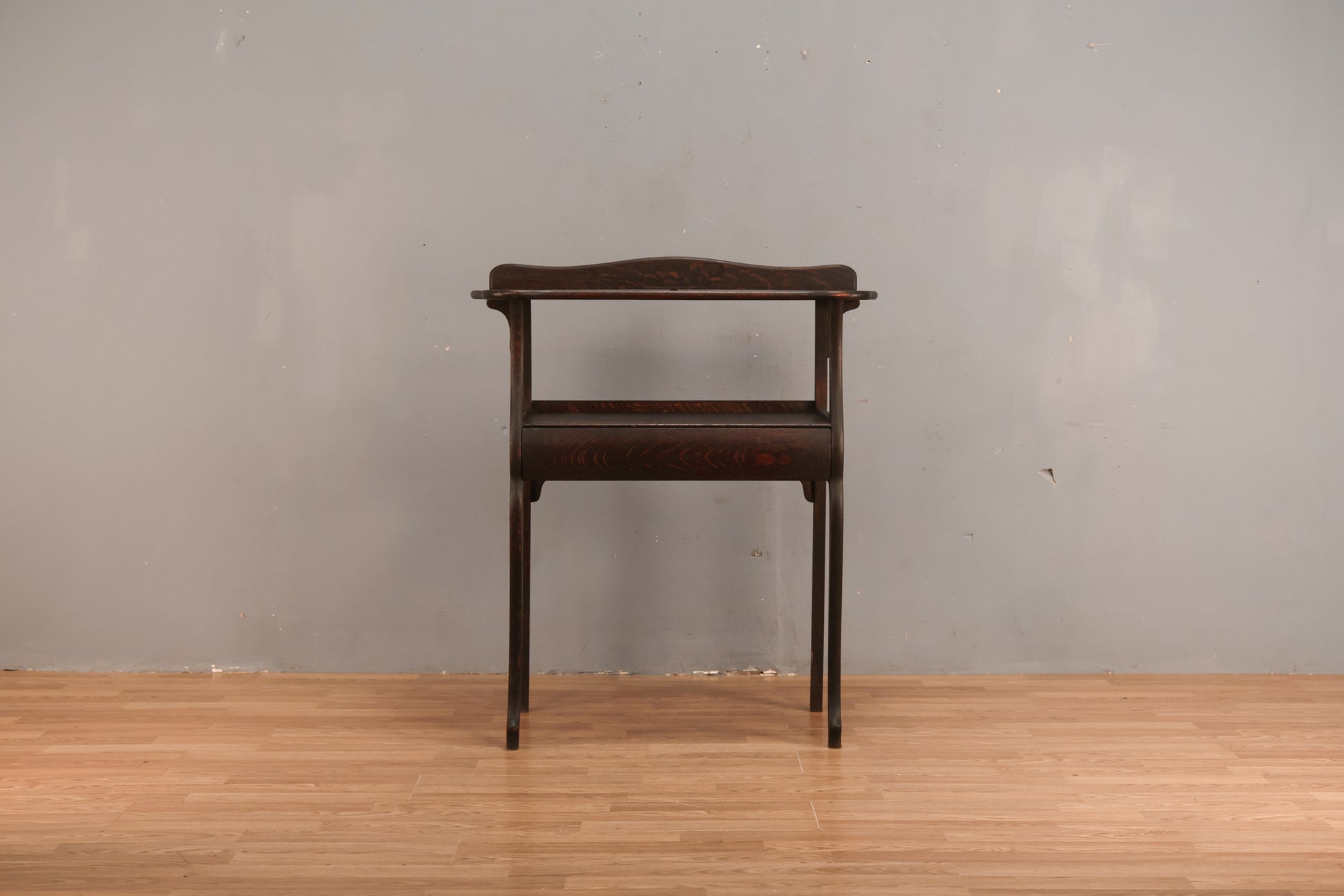 Understated antique oak table with one drawer and dark wood stain. Would make a great compact console table for your entryway! In good condition, with some scuffing, scratching to wood, and surface wear in line with age of piece.