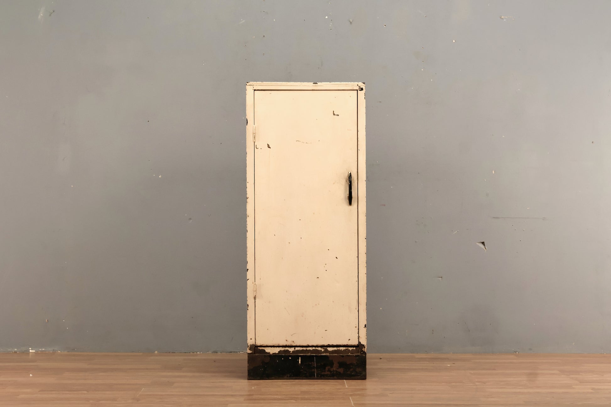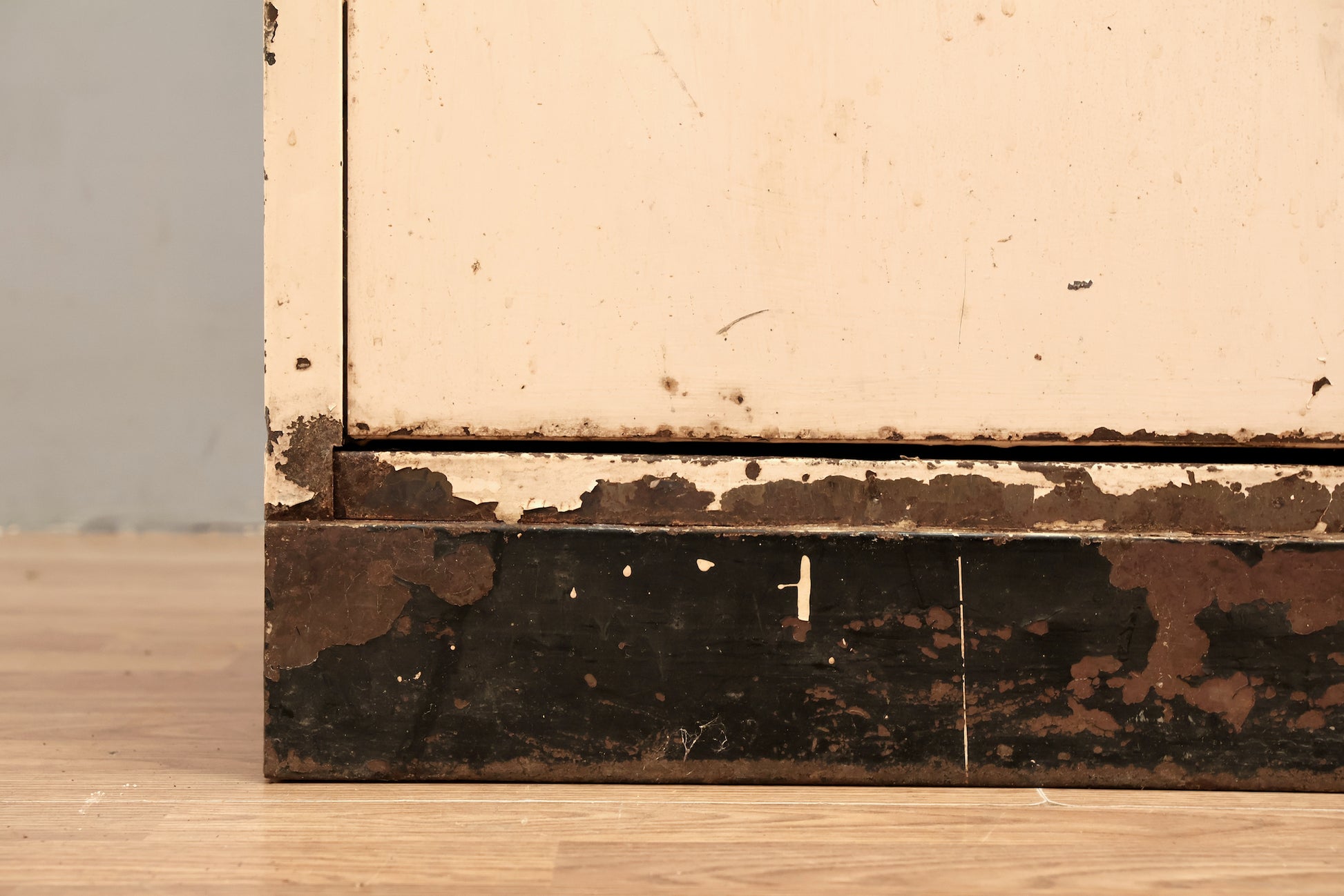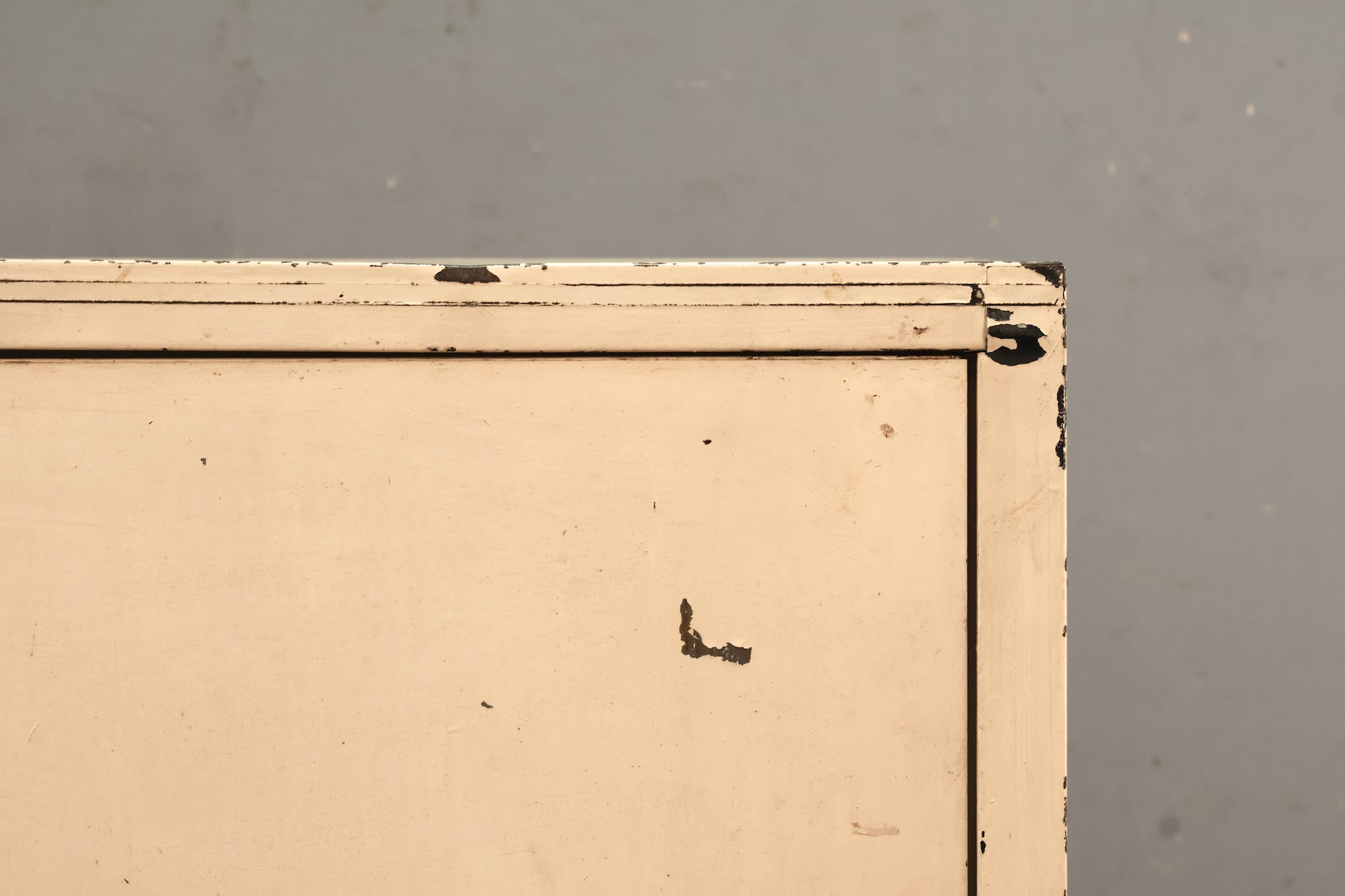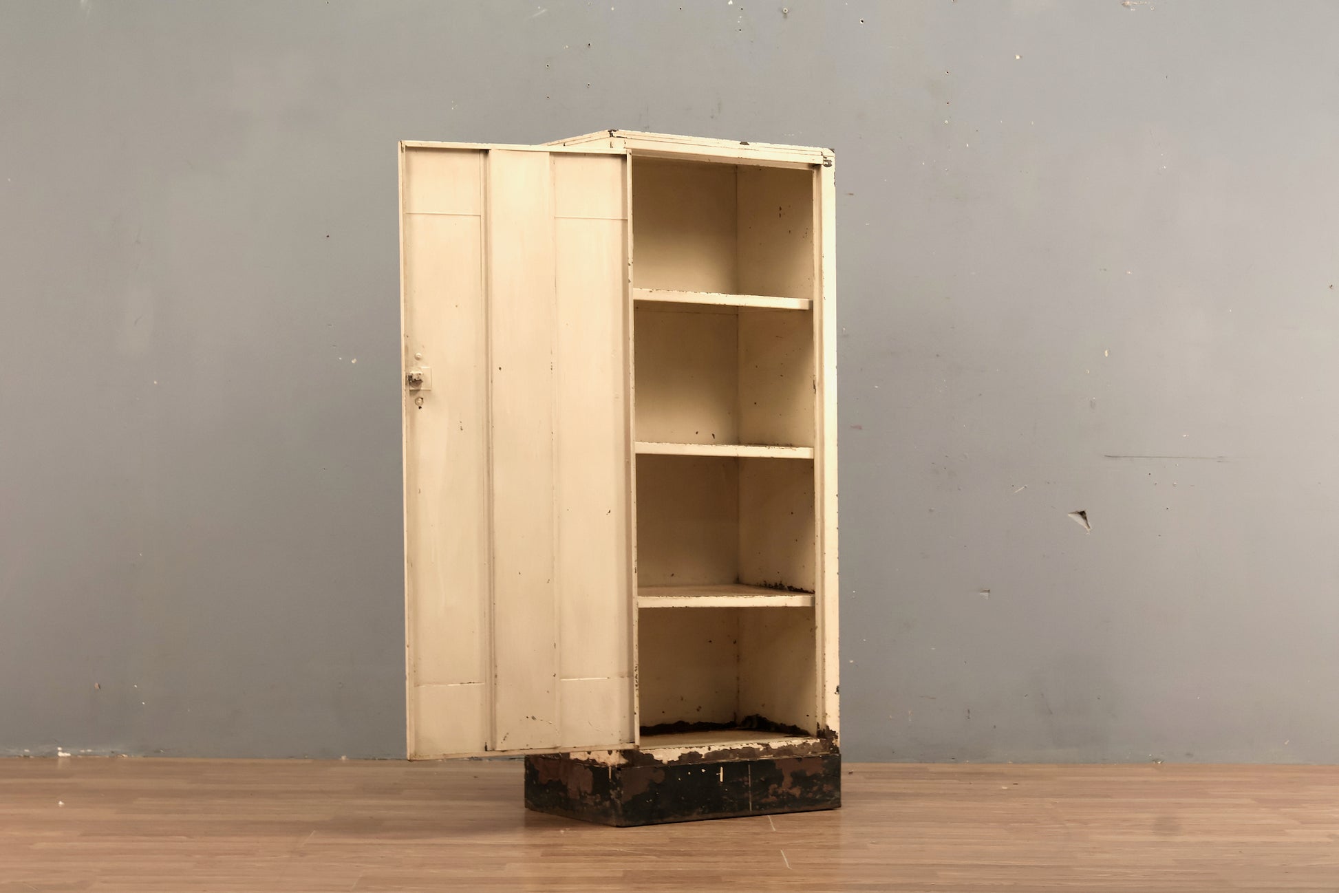 Industrial white and black metal locker with four tiers. Versatile storage that would look great in your bathroom or studio space! Some noticeable chipping to paint, tarnish, and wear throughout in line with style of piece.