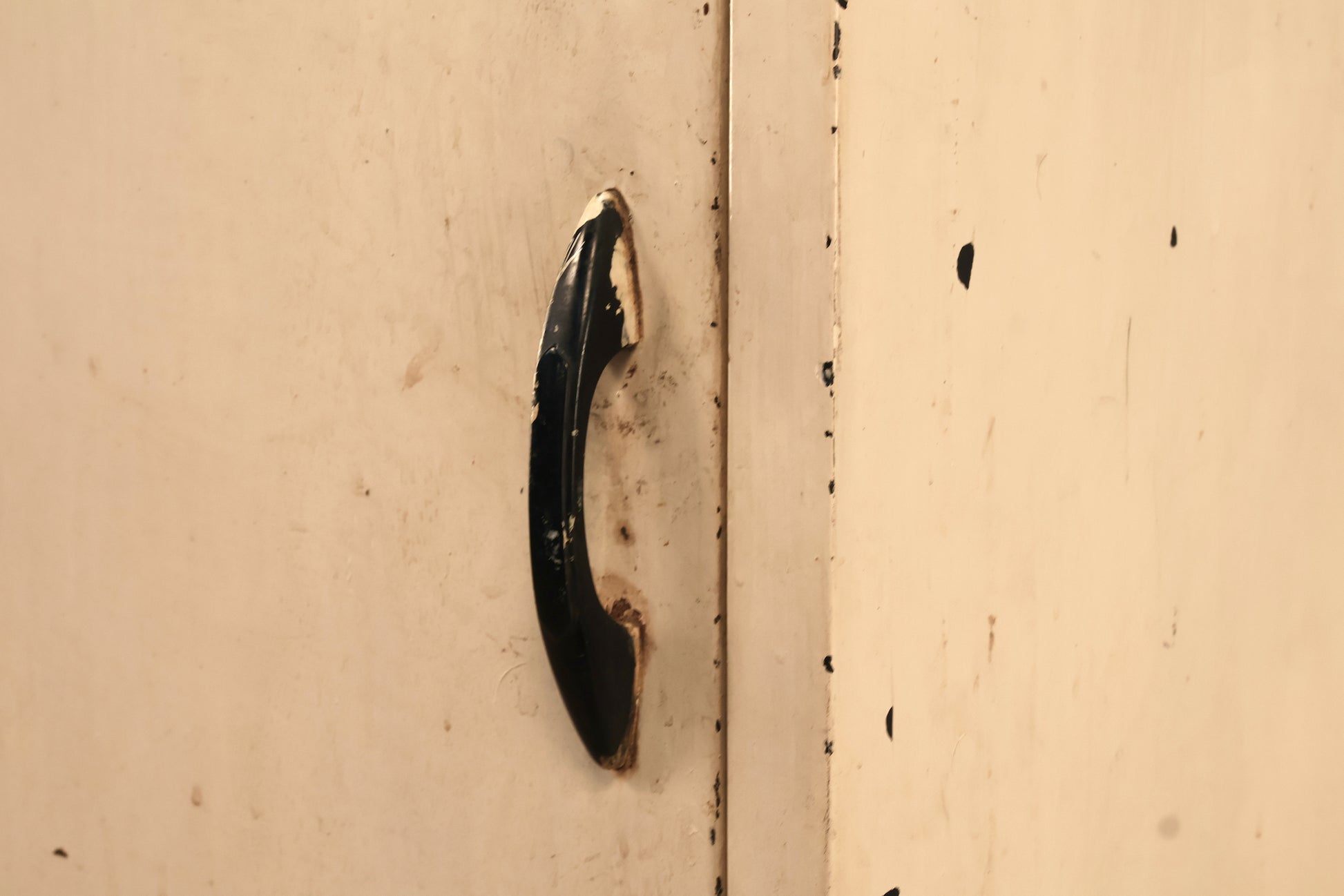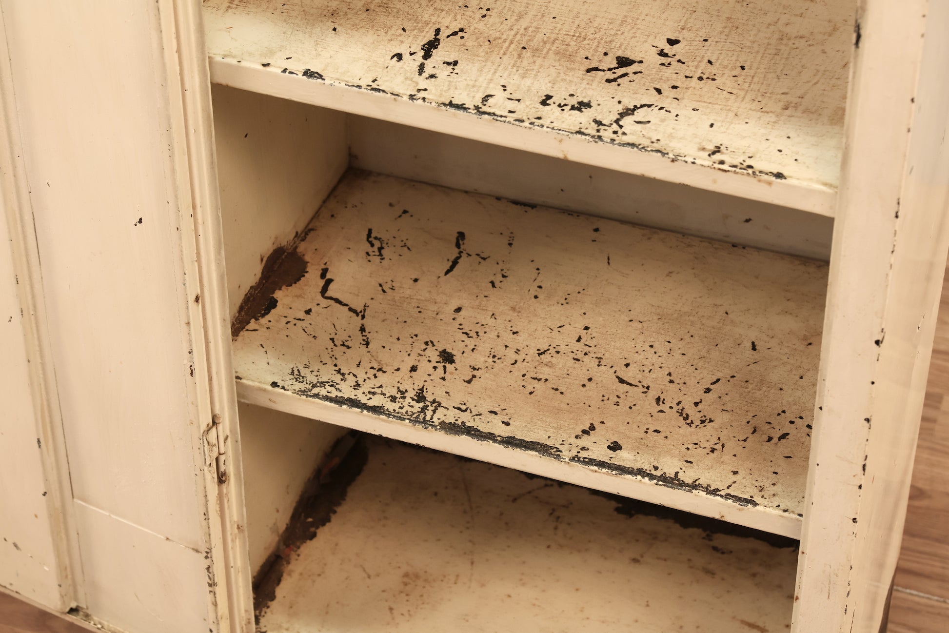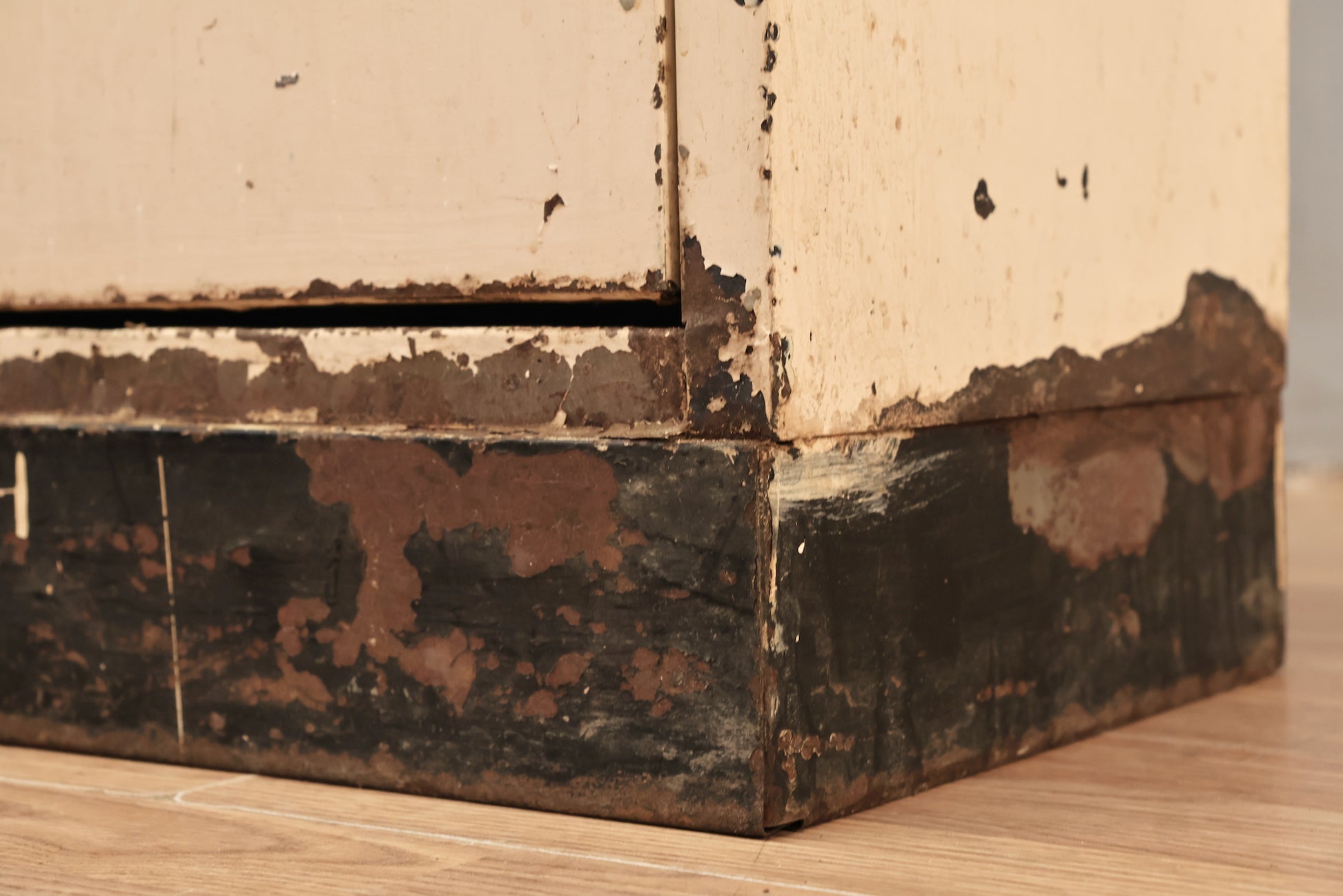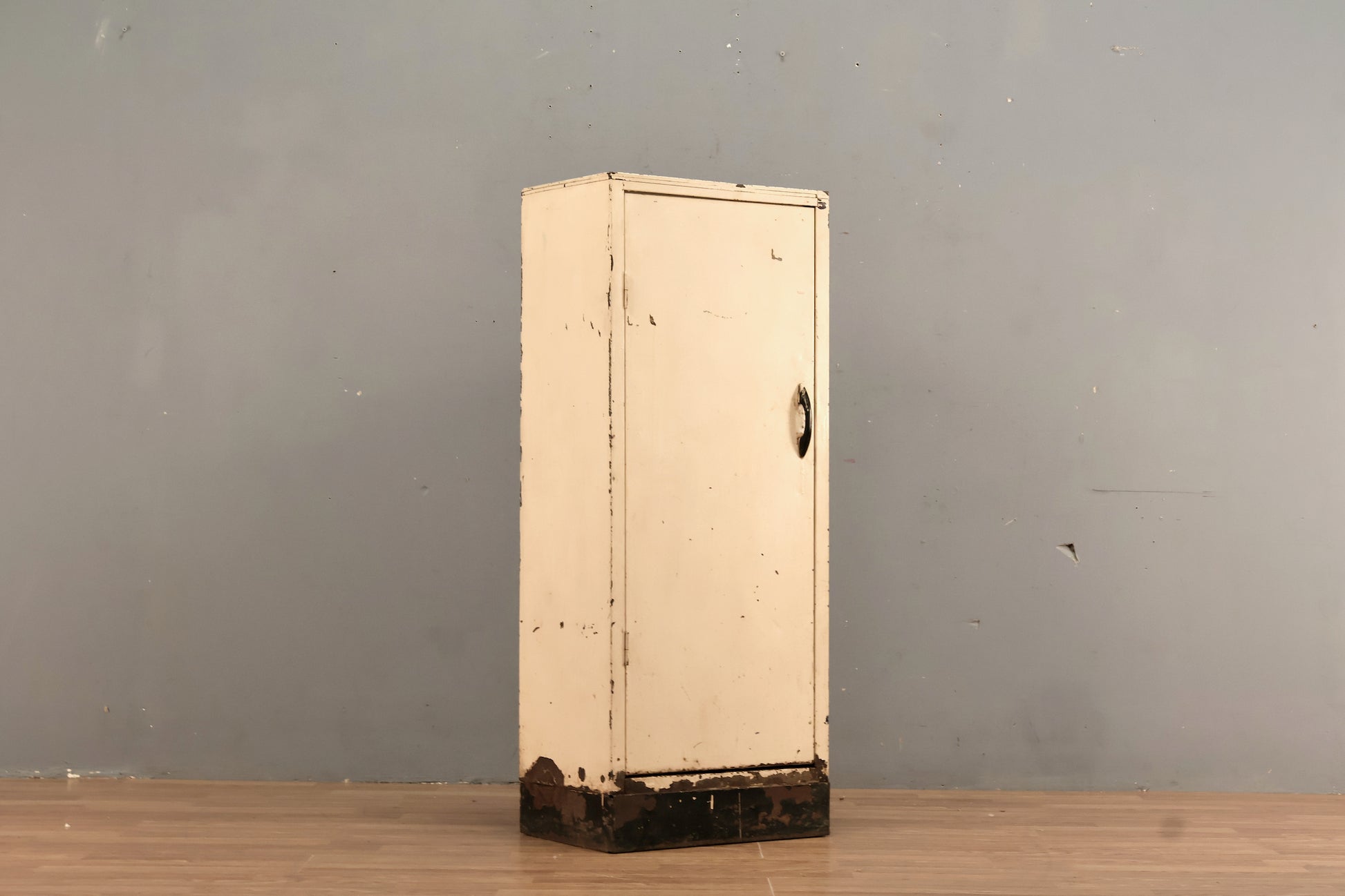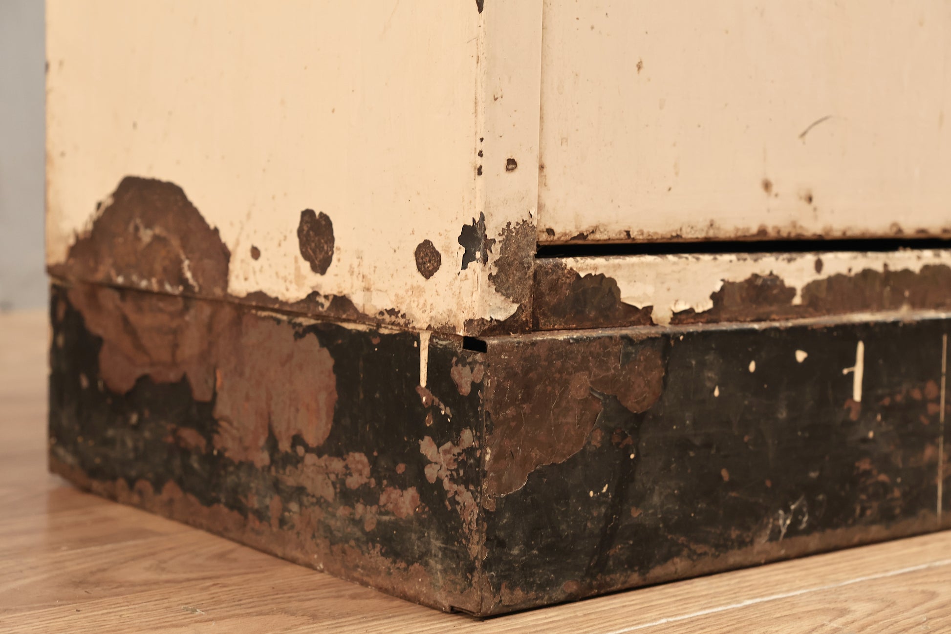 Industrial white and black metal locker with four tiers. Versatile storage that would look great in your bathroom or studio space! Some noticeable chipping to paint, tarnish, and wear throughout in line with style of piece.