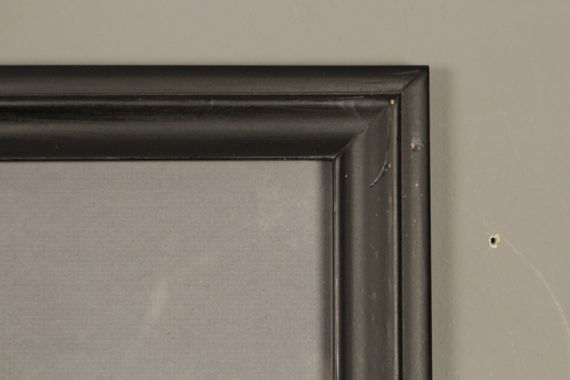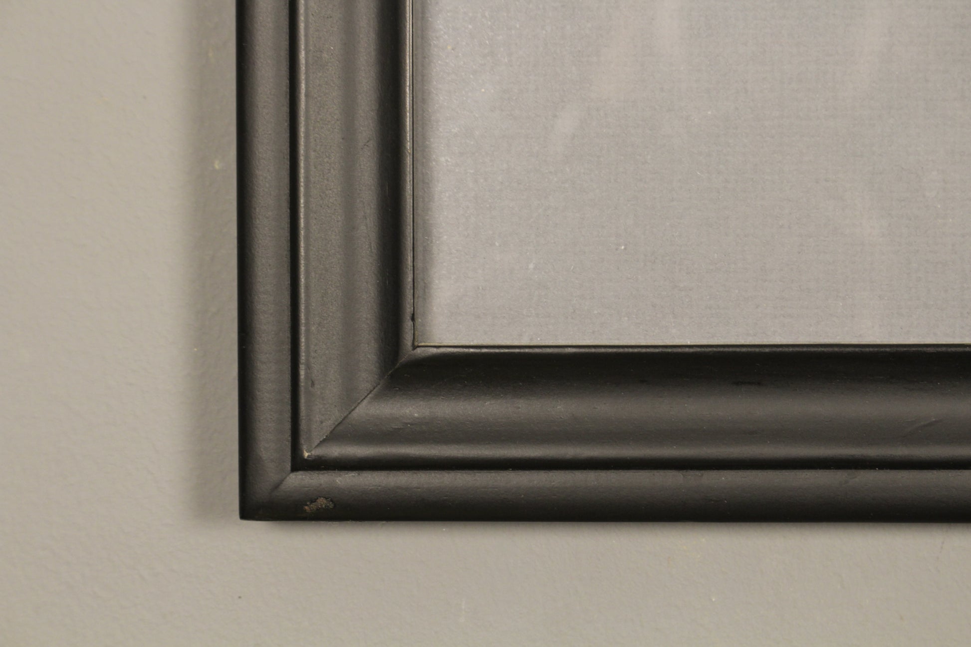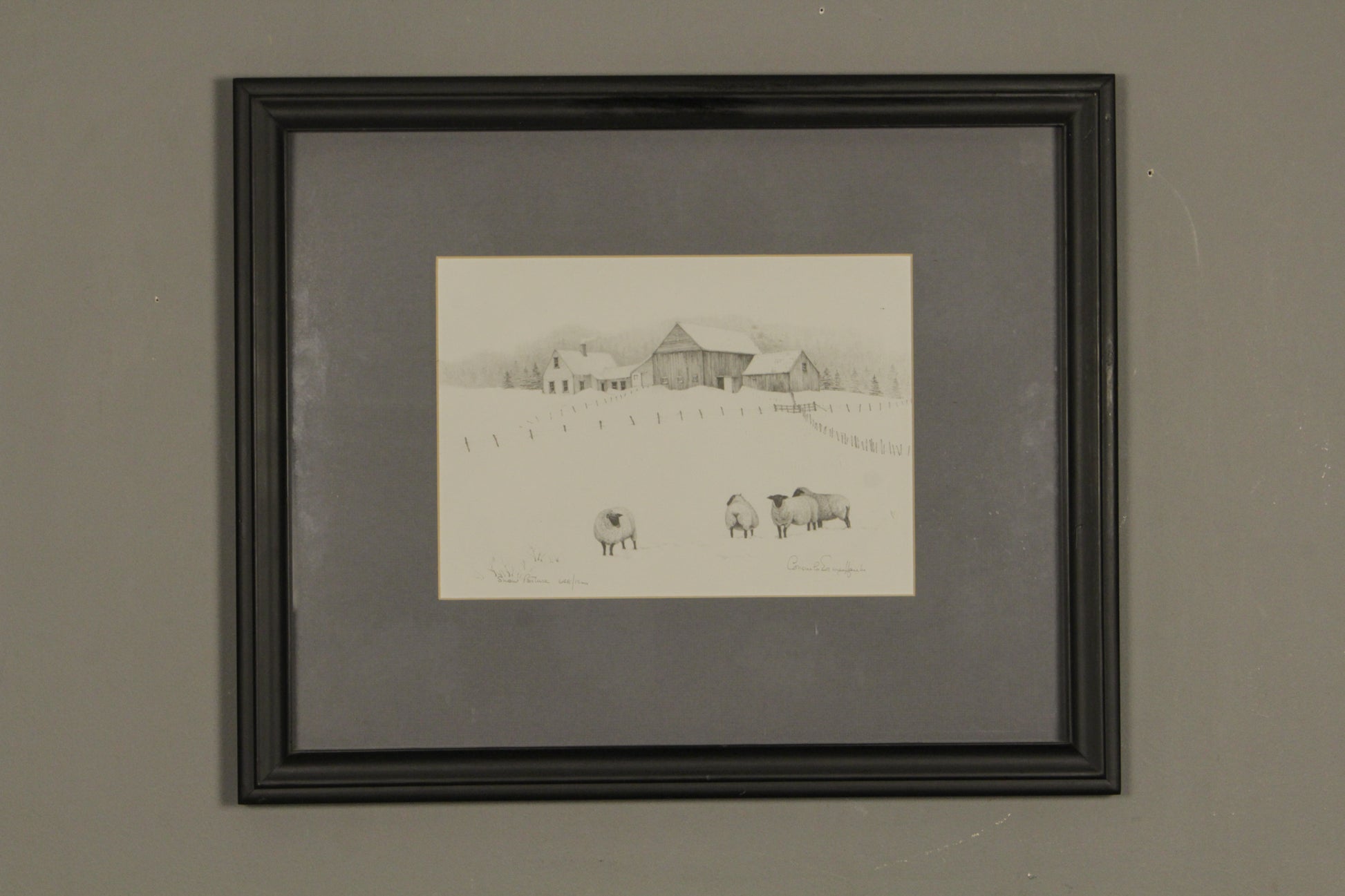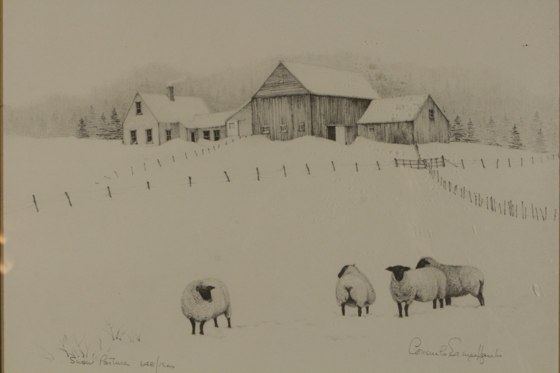 Eerie yet charming lithograph of the "Snow Pasture" by Consuelo Hanks. Sure to make you dream of sweaters on snowy day! In good condition, light wear to frame.