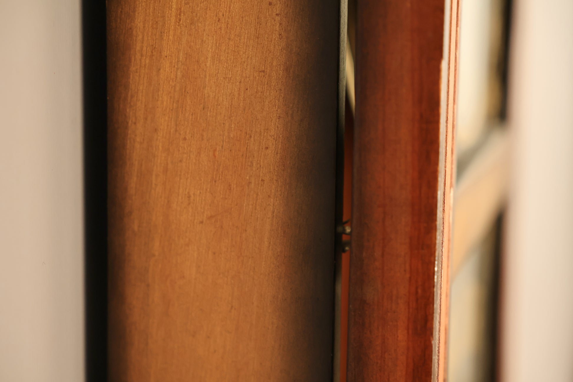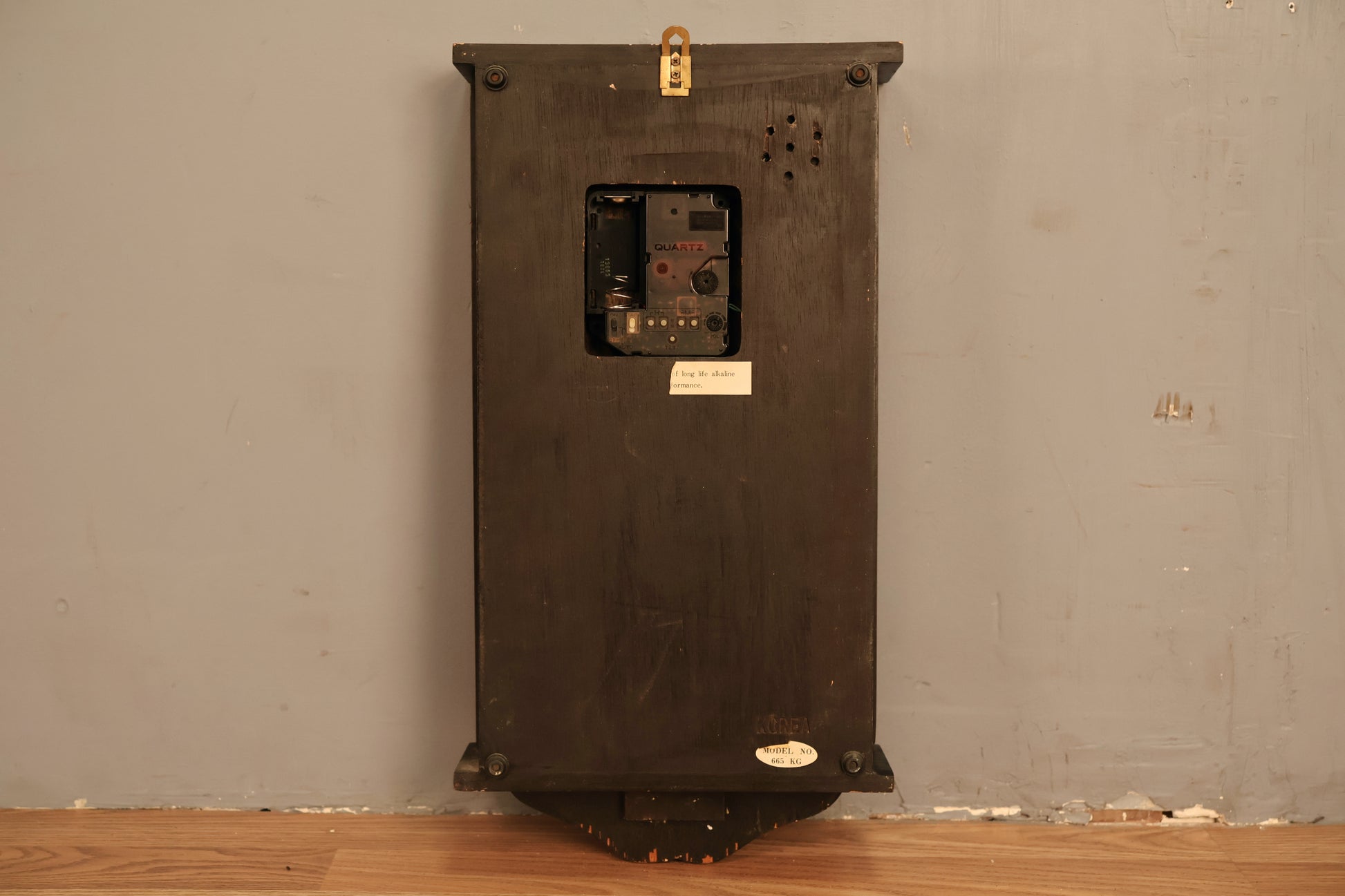 Classy Westminster-style wall clock. Features a dark wooden frame with a classic white and black face and ornate metal hands. Has a glass case with a brass pendulum below. Probably made in the 1990s. In good working condition. Light cosmetic wear.