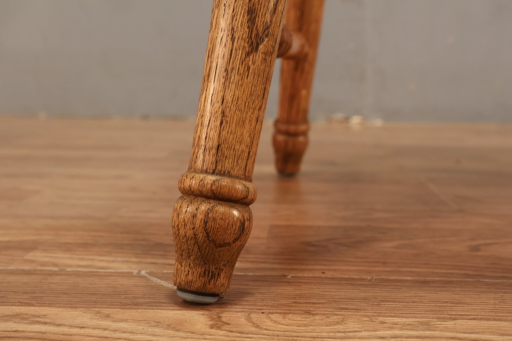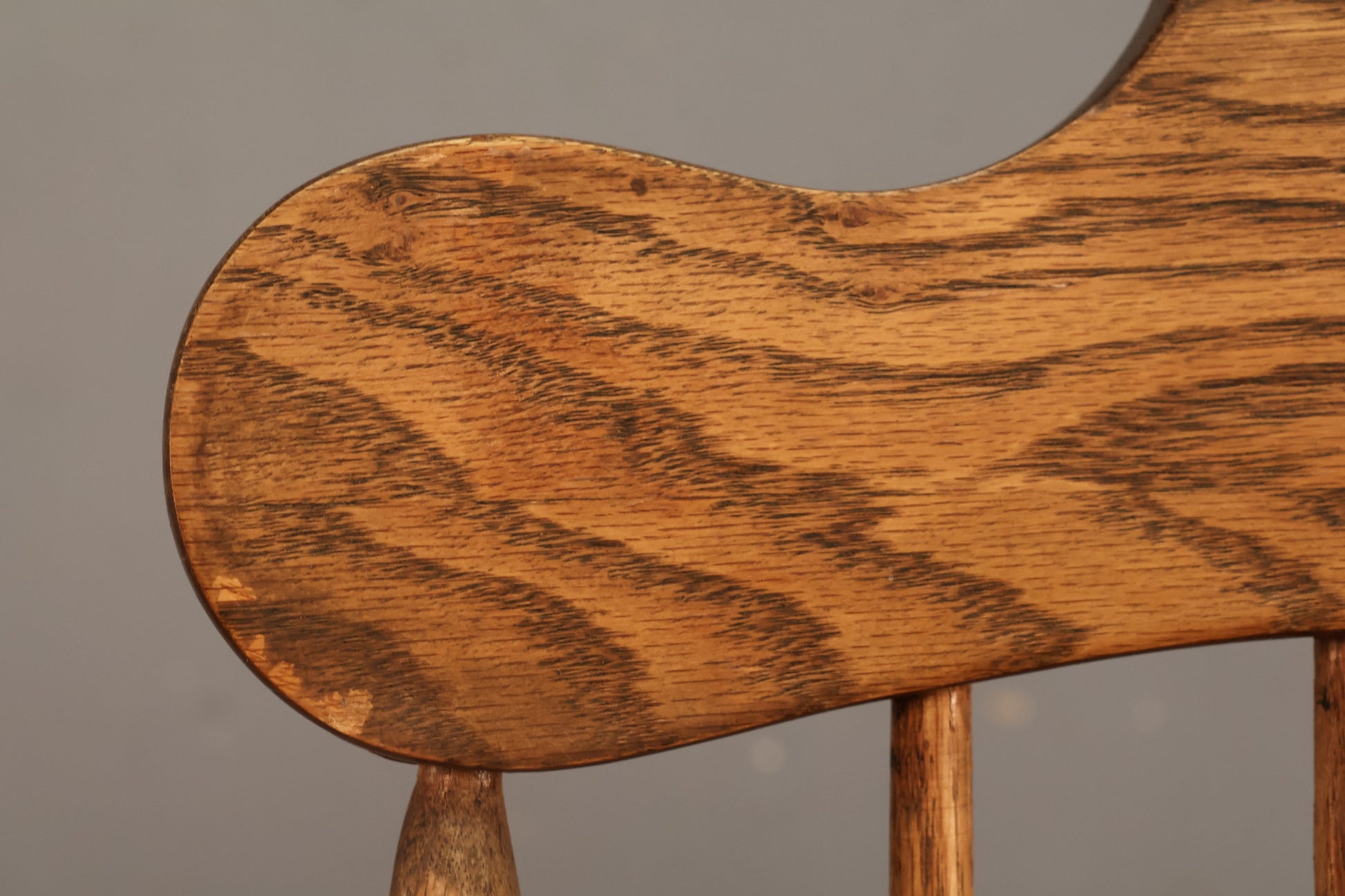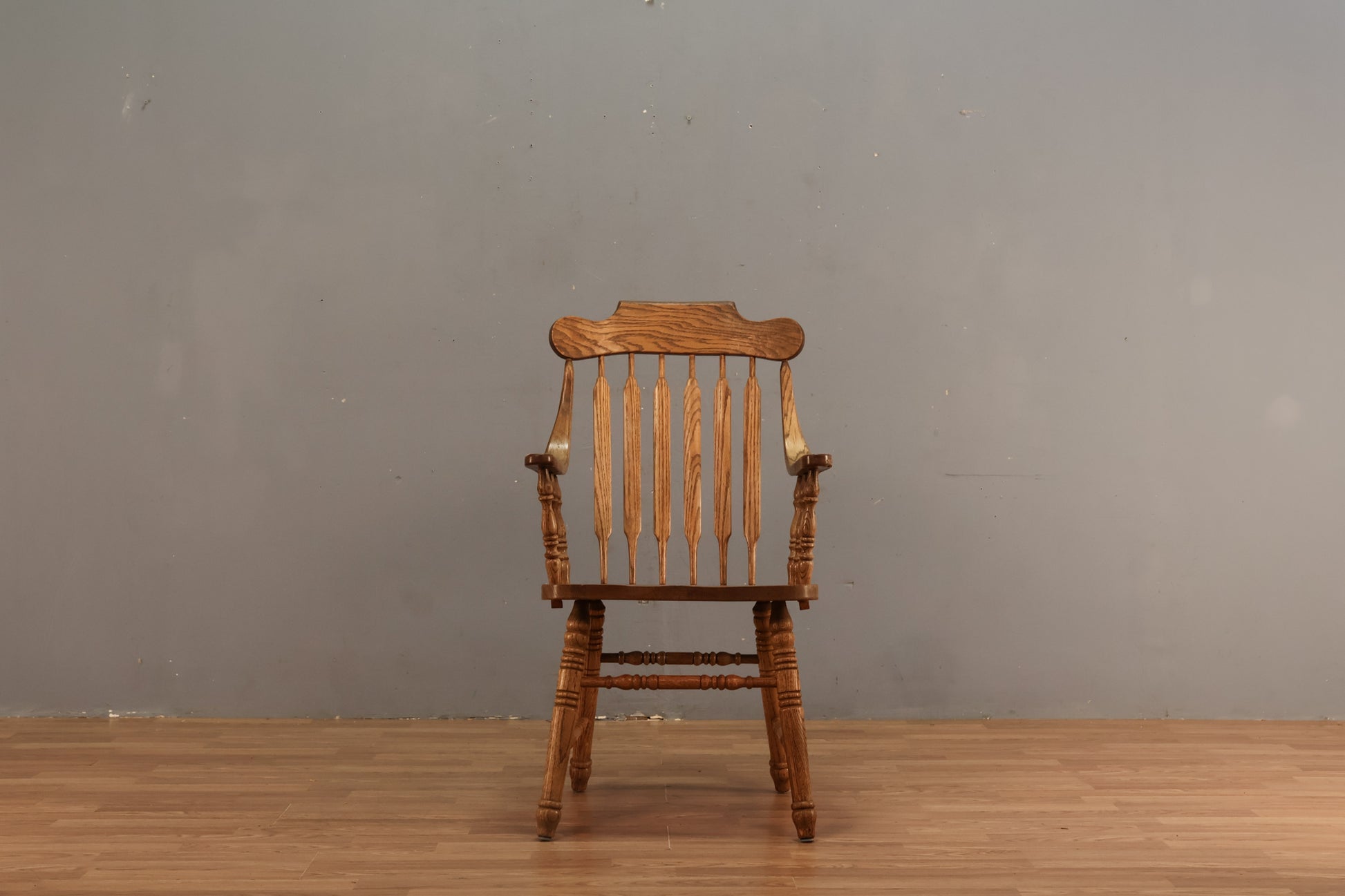 Timeless Windsor-style armchair with oak construction. Features swooping armrests and turned wooden frame. Makes a great dining chair. Made in Taiwan. Seat height is 18" and armrest height is 26.5".