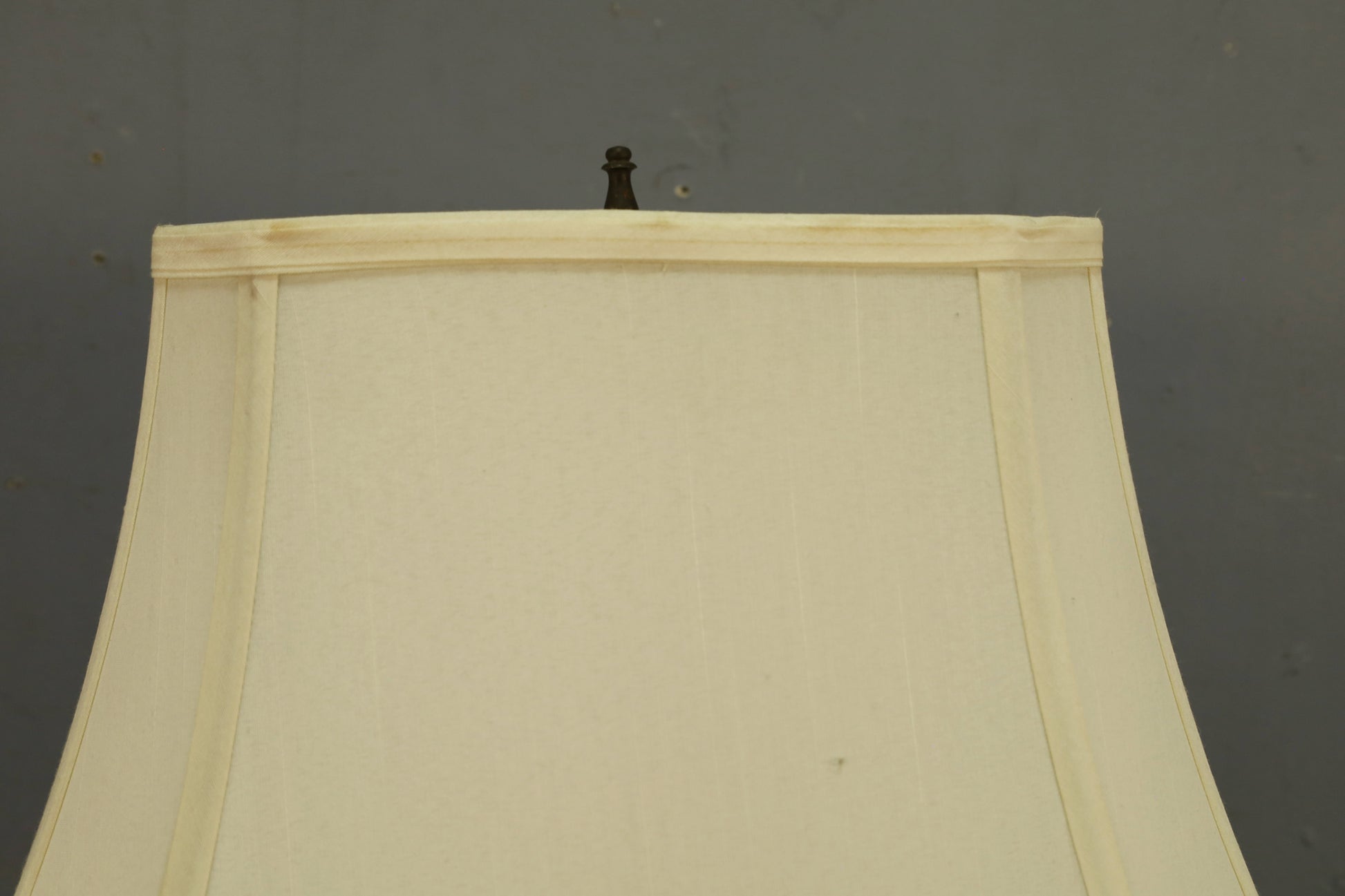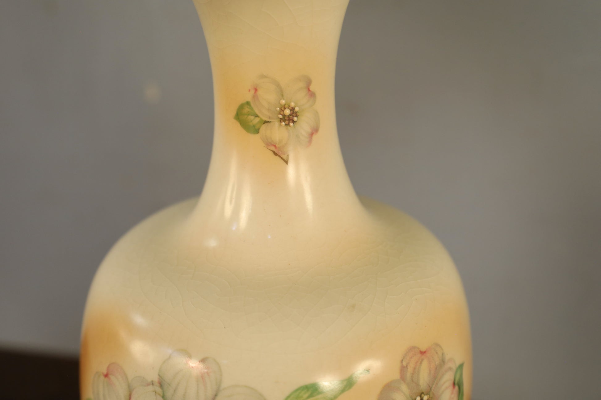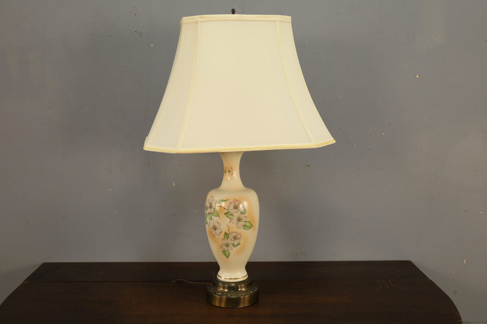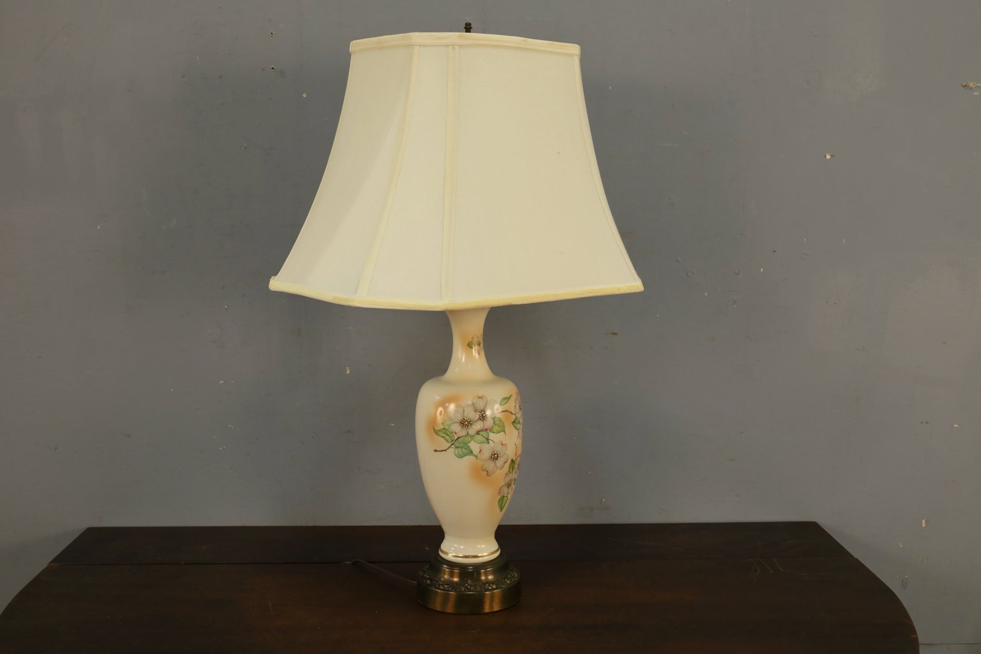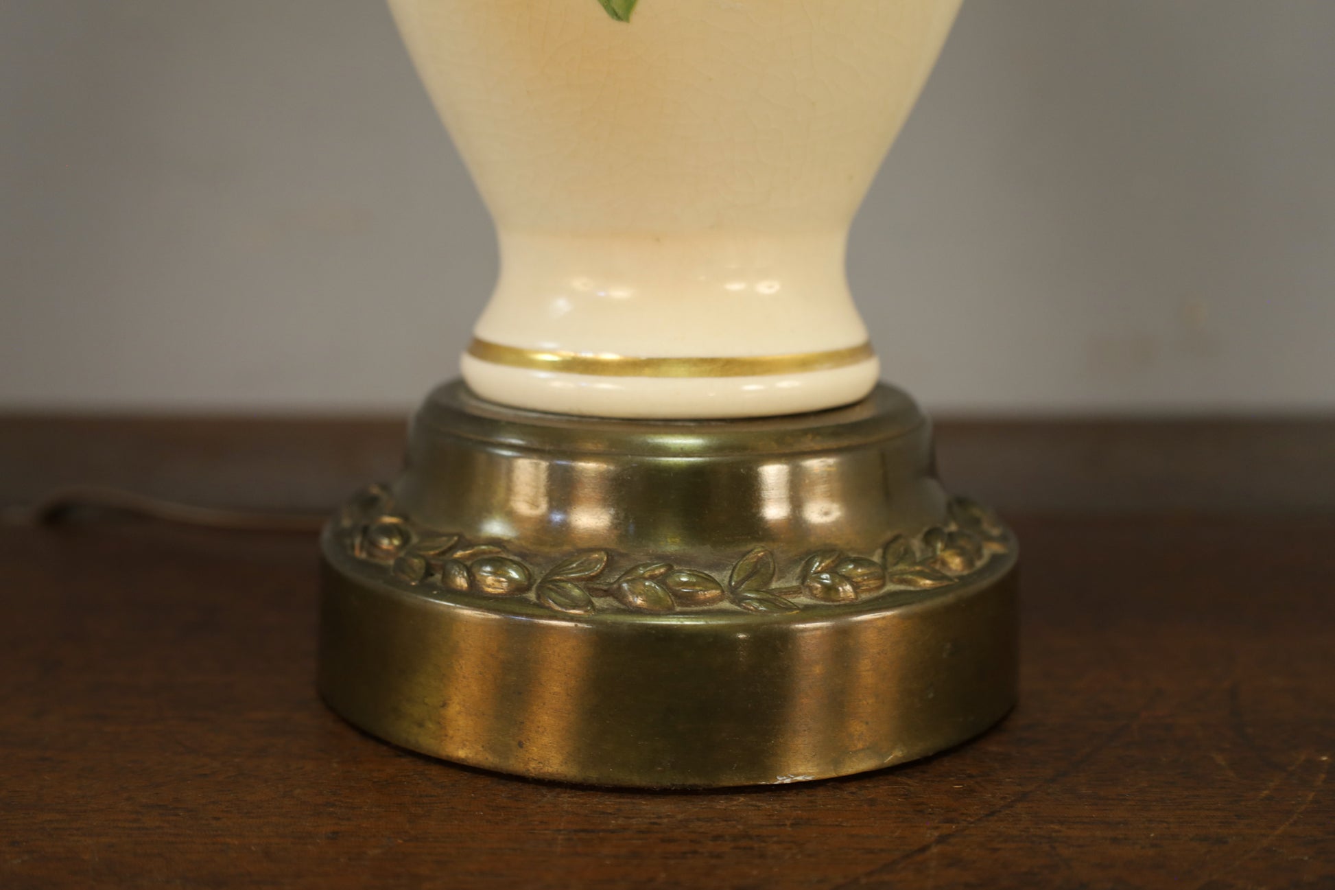 Darling floral ceramic table lamp. Ceramic and brass base. Simple flared cotton lampshade. Crazing to the ceramic finish. Some discolored spots on the lampshade from age.