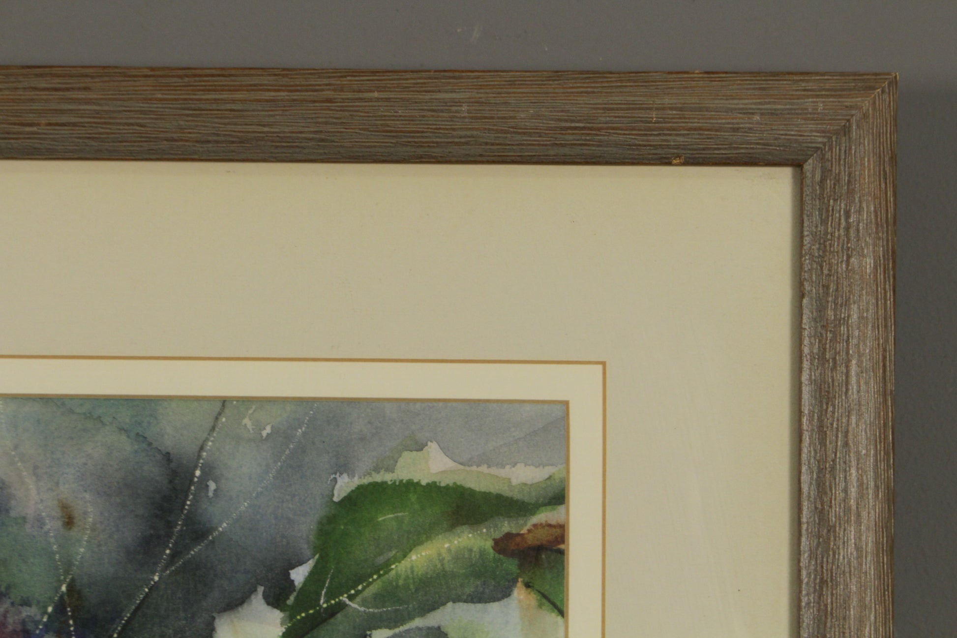 Lively floral watercolor still life. Signed by the artist. In a simple, weathered wooden frame. Signs of wear to the frame are in line with the rustic style.